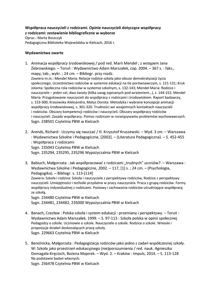 Współpraca nauczycieli z rodzicami. Opinie nauczycieli dotyczące współpracy z rodzicami: zestawienie bibliograficzne w wyborze Oprac.: Marta Boszczyk Pedagogiczna Biblioteka Wojewódzka w Kielcach, 2016 r. Wydawnictwa zwarte 1. Animacja współpracy środowiskowej / pod red. Marii Mendel ; z wstępem Jana Żebrowskiego. – Toruń : Wydawnictwo Adam Marszałek, cop. 2004. – 367 s. : faks., mapy, tab., wykr. ; 24 cm. – Bibliogr. przy rozdz. Zawiera m.in.: Mendel Maria: Relacje rodzice-szkoła jako obszar demokratyzacji życia społecznego. Uczestnictwo rodziców w systemie edukacji na tle porównawczym, s. 121-131; Kruk Jolanta: Społeczna rola rodziców w systemie szkolnym, s. 132-143; Mendel Maria: Rodzice i nauczyciele – jeden cel, dwa światy (kilka uwag zapisanych pod wrażeniem…), s. 144-152; Mendel Maria: Przygotowanie nauczycieli do współpracy z rodzicami i środowiskiem. Raport badawczy, s. 153-300; Krasowska Aleksandra, Matys Dorota: Metodyka i wybrane koncepcje animacji współpracy środowiskowej, s. 301-320. Trudności we wzajemnych kontaktach nauczycieli i rodziców. Obszary kompetencji rodziców i nauczycieli. Obszary współpracy rodziców i nauczycieli. Zasady współpracy. Pomoc rodzicom w rozwiązywaniu problemów wychowawczych. Sygn. 238501 Czytelnia PBW w Kielcach 2. Arends, Richard : Uczymy się nauczać / tł. Krzysztof Kruszewski. – Wyd. 3 zm. – Warszawa : Wydawnictwa Szkolne i Pedagogiczne, [2002]. – (Literatura Pedagogiczna). – S. 452-455 : Współpraca z rodzicami Sygn. 235043 Czytelnia PBW w Kielcach Sygn. 235294, 235295, 235296 Wypożyczalnia PBW w Kielcach 3. Babiuch, Małgorzata : Jak współpracować z rodzicami „trudnych” uczniów?. – Warszawa : Wydawnictwa Szkolne i Pedagogiczne, 2002. – 117, [1] s. ; 24 cm. – (Psychologia, Pedagogika). – Bibliogr. s. 113-[114] Zawiera: Szkoła i rodzina: Szkoła i nauczyciele z perspektywy rodziców, Rodzice z perspektywy nauczycieli. Umiejętności i techniki przydatne w pracy nauczyciela. Praca z grupą rodziców. Formy współpracy indywidualnej z rodzicami. Postawy i zachowania rodziców utrudniające współpracę ze szkołą. Sygn. 234480 Czytelnia PBW w Kielcach Sygn. 234481, 234482, 235000 Wypożyczalnia PBW w Kielcach 4. Banach, Czesław : Polska szkoła i system edukacji : przemiany i perspektywy. – Toruń : Wydawnictwo Adam Marszałek, 1999. – S. 97-113 : Szkoła polska w opinii społecznej Pedagodzy o szkole. Uczniowie o szkole. Nauczyciele o szkole. Rodzice o szkole. Wnioski i propozycje działań doskonalących pracę szkoły. Sygn. 229663 Czytelnia PBW w Kielcach 5. Bereźnicka, Małgorzata : Pedagogizacja rodziców jako jedno z zadań współczesnej szkoły. W: Szkoła jako przestrzeń edukacyjnego (nie)porozumienia / red. nauk. Agnieszka Domagała-Kręcioch, Bożena Majerek. – Wyd. 2. – Kraków : Impuls, 2014. – S. 113-128 Na podstawie badań własnych. Sygn. 256478 Czytelnia PBW w Kielcach Sygn. 256479 Wypożyczalnia PBW w Kielcach 6. Bibik, Renata : Partnerstwo rodziny i szkoły : fikcja czy rzeczywistość?. W: Rodzina we współczesności / pod red. Andrzeja Ładyżyńskiego. – Wrocław : Oficyna Wydawnicza ATUT, 2009. – S. 147-161 Biblioteka UJK - Czytelnia Pedagogiczna 7. Błaszczyk, Klaudia : Potrzeba aktywnej współpracy nauczyciela z rodzicami klas propedeutycznych. W: Modernizowanie edukacji wczesnoszkolnej : wybrane próby / red. nauk. Marzenna Magda-Adamowicz. – Zielona Góra : Oficyna Wydawnicza Uniwersytetu Zielonogórskiego, 2004. – S. 315-324 Podano definicję pojęcia „współpraca”. Na podstawie badań przeprowadzonych za pomocą sondażu diagnostycznego. Biblioteka UJK – Czytelnia Pedagogiczna 8. Bober Justyna, Dec Anna, Jędzula Magdalena : Razem w wychowaniu : rodzina - szkoła – dziecko. W: Rodzina - centrum świata / pod red. nauk. Urszuli Grucy-Miąsik. – Rzeszów : Wydawnictwo Uniwersytetu Rzeszowskiego, 2014. – S. 190-200 Łódź - Biblioteka Uniwersytetu Łódzkiego Kraków - Biblioteka Główna Uniwersytetu Pedagogicznego Kraków - Biblioteka Jagiellońska i Biblioteka Collegium Medicum Uniwersytetu Jagiellońskiego 9. Bullough, Robert V. : Początkujący nauczyciel : studium przypadku / przekł. Krzysztof Rogowski. – Gdańsk ; Sopot : Gdańskie Wydawnictwo Psychologiczne, 2009. – S. 87-92 : Relacje z rodzicami Sygn. 245891 Czytelnia PBW w Kielcach Sygn. 246112 Wypożyczalnia PBW w Kielcach 10. Borawska, Iwona : Współpraca nauczycieli z rodzicami na przykładzie szkoły podstawowej – wyniki badań własnych. W: Oblicza edukacji w zmieniającym się społeczeństwie / pod red. naukową Agaty Popławskiej ; [Niepaństwowa Wyższa Szkoła Pedagogiczna w Białymstoku]. – Białystok : Wydawnictwo Niepaństwowej Wyższej Szkoły Pedagogicznej, 2012. – S. Biblioteka UJK – Czytelnia Pedagogiczna 11. Brzezińska, Renata : Uwarunkowania pracy nauczyciela w szkołach niepublicznych, wyznaniowych i świeckich. – Toruń : Wydawnictwo Adam Marszałek, cop. 2008. – 235243 : Relacje nauczyciel-rodzic w szkołach niepublicznych ; S. 249 : Relacje nauczycielrodzic Stopień angażowania się rodziców w życie klasy i szkoły w opinii nauczycieli. Formy współpracy z rodzicami organizowane przez nauczycieli. Podejmowanie działań i przedsięwzięć przez rodziców na rzecz szkoły. Sygn. 244646 Czytelnia PBW w Kielcach 12. Christopher, Cindy J. : Nauczyciel - rodzic : skuteczne porozumiewanie się / przekł. Jolanta Bartosik. – Gdańsk : Gdańskie Wydawnictwo Psychologiczne, 2004. – 157, [1] s. : rys., tab. ; 21 cm. (Kompetentny Nauczyciel) (Pedagogika). – Bibliogr. s. [158] Sygn. 237948 Czytelnia PBW w Kielcach Sygn. 238026 Wypożyczalnia PBW w Kielcach 13. Ciągłość i zmiana tradycji kulturowej : praca zbiorowa / pod red. Stefana Nowaka. – Warszawa : Państwowe Wydawnictwo Naukowe, 1989. – 486, [2] s. : err. ; 24 cm Sygn. 200915, 200916, 200917 Wypożyczalnia PBW w Kielcach 14. Cierpka, Anna : Ko