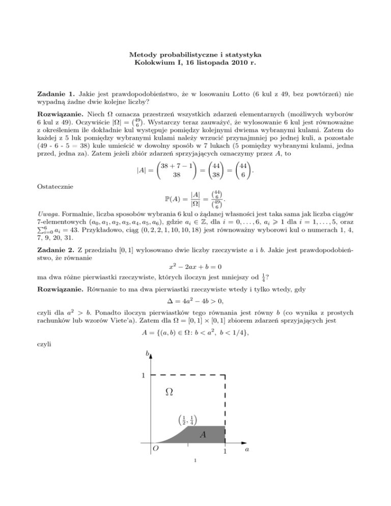 Zadanie 2. Z przedziału [0, 1] wylosowano dwie liczby rzeczywiste a i b. Jakie jest prawdopodobieństwo, że równanie