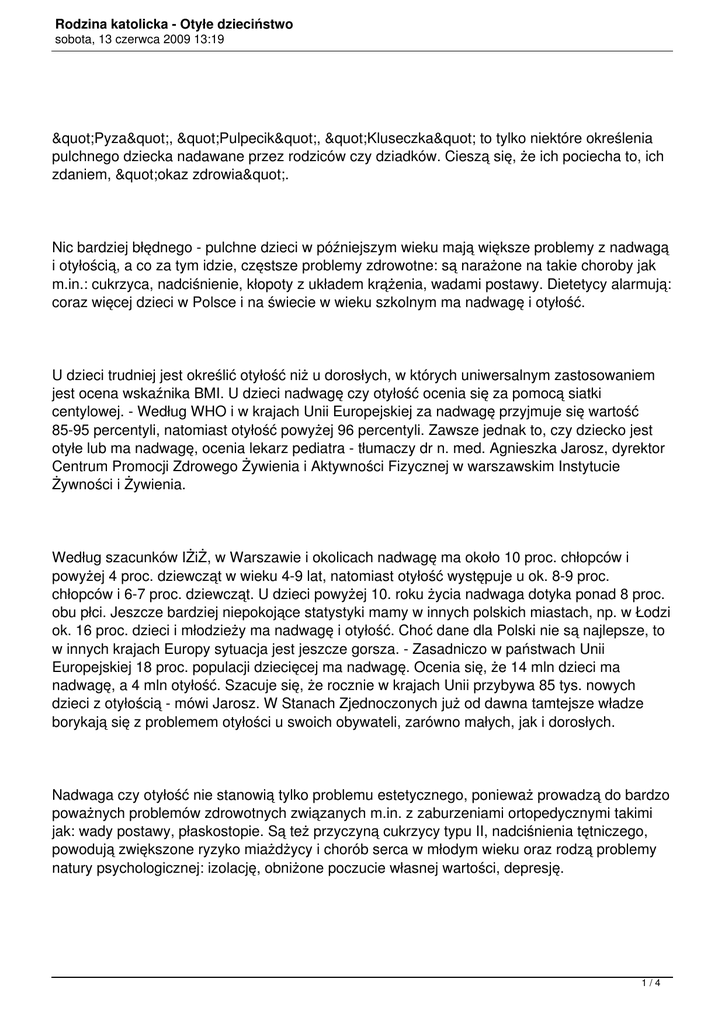 Rodzina katolicka - Otyłe dzieciństwo sobota, 13 czerwca 2009 13:19 "Pyza", "Pulpecik", "Kluseczka" to tylko niektóre określenia pulchnego dziecka nadawane przez rodziców czy dziadków. Cieszą się, że ich pociecha to, ich zdaniem, "okaz zdrowia". Nic bardziej błędnego - pulchne dzieci w późniejszym wieku mają większe problemy z nadwagą i otyłością, a co za tym idzie, częstsze problemy zdrowotne: są narażone na takie choroby jak m.in.: cukrzyca, nadciśnienie, kłopoty z układem krążenia, wadami postawy. Dietetycy alarmują: coraz więcej dzieci w Polsce i na świecie w wieku szkolnym ma nadwagę i otyłość. U dzieci trudniej jest określić otyłość niż u dorosłych, w których uniwersalnym zastosowaniem jest ocena wskaźnika BMI. U dzieci nadwagę czy otyłość ocenia się za pomocą siatki centylowej. - Według WHO i w krajach Unii Europejskiej za nadwagę przyjmuje się wartość 85-95 percentyli, natomiast otyłość powyżej 96 percentyli. Zawsze jednak to, czy dziecko jest otyłe lub ma nadwagę, ocenia lekarz pediatra - tłumaczy dr n. med. Agnieszka Jarosz, dyrektor Centrum Promocji Zdrowego Żywienia i Aktywności Fizycznej w warszawskim Instytucie Żywności i Żywienia. Według szacunków IŻiŻ, w Warszawie i okolicach nadwagę ma około 10 proc. chłopców i powyżej 4 proc. dziewcząt w wieku 4-9 lat, natomiast otyłość występuje u ok. 8-9 proc. chłopców i 6-7 proc. dziewcząt. U dzieci powyżej 10. roku życia nadwaga dotyka ponad 8 proc. obu płci. Jeszcze bardziej niepokojące statystyki mamy w innych polskich miastach, np. w Łodzi ok. 16 proc. dzieci i młodzieży ma nadwagę i otyłość. Choć dane dla Polski nie są najlepsze, to w innych krajach Europy sytuacja jest jeszcze gorsza. - Zasadniczo w państwach Unii Europejskiej 18 proc. populacji dziecięcej ma nadwagę. Ocenia się, że 14 mln dzieci ma nadwagę, a 4 mln otyłość. Szacuje się, że rocznie w krajach Unii przybywa 85 tys. nowych dzieci z otyłością - mówi Jarosz. W Stanach Zjednoczonych już od dawna tamtejsze władze borykają się z problemem otyłości u swoich obywateli, zarówno małych, jak i dorosłych. Nadwaga czy otyłość nie stanowią tylko problemu estetycznego, ponieważ prowadzą do bardzo poważnych problemów zdrowotnych związanych m.in. z zaburzeniami ortopedycznymi takimi jak: wady postawy, płaskostopie. Są też przyczyną cukrzycy typu II, nadciśnienia tętniczego, powodują zwiększone ryzyko miażdżycy i chorób serca w młodym wieku oraz rodzą problemy natury psychologicznej: izolację, obniżone poczucie własnej wartości, depresję. 1/4 Rodzina katolicka - Otyłe dzieciństwo sobota, 13 czerwca 2009 13:19 Mniej więcej do 11. roku życia kształtuje się liczba komórek tłuszczowych, jednak u dzieci z nadwagą czy otyłością jest to proces otwarty. Kiedy zaczynają tyć w wieku dorosłym, ilość tych komórek się zwiększa. Dlatego tak ważne jest właściwe odżywianie i utrzymywanie wagi w normie już od najmłodszych lat. Kanapka zamiast batona Zdaniem dietetyków, dzieci są ofiarami czasów, w których obecnie żyjemy. Zapracowani rodzice często zapominają o właściwym odżywianiu siebie i swoich pociech, a dostępność produktów, szczególnie tych wysokoenergetycznych, np. w szkolnych sklepikach, powoduje pokusę częstego sięgania po nie, bez zważania na konsekwencje, jakie ze sobą niosą. Zdaniem Anny Grudzińskiej, dietetyka z Centrum Leczenia Otyłości w Krakowie, winę za taki stan rzeczy ponoszą niewątpliwie wspomniane sklepiki szkolne, w których znajduje się nieodpowiednia dla dzieci żywność, wszechobecne McDonaldy i mała aktywność fizyczna. Jednak, jej zdaniem, otyłość czy nadwaga dzieci spożywających niewłaściwe posiłki nie wynika z samego faktu istnienia niezdrowej żywności, ale najczęściej z braku w ich zasięgu żywności odpowiedniej. Taki stan rzeczy spowodowany jest przede wszystkim niewiedzą opiekunów w zakresie prawidłowego żywienia dzieci, jak również małą świadomością potrzeby edukacji zdrowotnej ze strony rodziców i szkoły. - Najlepszym sposobem dbania o prawidłowe odżywienie dziecka jest dawanie mu dobrego przykładu własnym postępowaniem. Jeżeli dziecko dostaje do szkoły pełnowartościowy posiłek, a jednocześnie od najmłodszych lat widzi, że rodzice również dbają o swoje posiłki, nie będzie kupowało w szkole batonika - uważa Grudzińska. Zdarza się, że dziecko ma nadwagę już w wieku 4-5 lat. Najmłodsze dziecko z problemem nadmiernej wagi, które spotkała pani dietetyk w swojej pracy zawodowej, miało półtora roku. W takich sytuacjach nie ma mowy o odchudzaniu, z całą pewnością należy jednak uświadomić rodziców, jak dziecko powinno być żywione, by zapobiec kłopotom w przyszłości. Odchudzajmy zdrowo i kolorowo Problem otyłości może także wynikać np. z nieprawidłowych relacji z otoczeniem i rekompensowania swoich smutków m.in. jedzeniem. Dlatego w wielu placówkach leczenia 2/4 Rodzina katolicka - Otyłe dzieciństwo sobota, 13 czerwca 2009 13:19 otyłości pracuje cały zespół na czele z pediatrą, dietetykiem czy psychologiem. - W trakcie odchudzania kładziemy nacisk na naukę prawidłowych nawyków żywieniowych. Nie stosujemy drastycznych diet, lecz staramy się zachęcić dzieci i rodziców do wprowadzenia zmian w żywieniu całej rodziny. Na przykład tłumaczymy, jak organizować posiłki, co ma być w nich zawarte, jak gotować smacznie i zdrowo. Bardzo ważnym aspektem w odchudzaniu dziecka jest czynny udział rodziców w tym przedsięwzięciu - rodzic ma nie tylko przygotować, ale również jeść to samo, w myśl zasady "wszyscy teraz jemy zdrowo". Aby przekonać malucha do podjęcia wysiłku, proponujemy rodzicom ustalenie nagrody dla dziecka. Nagroda oczywiście nie może być związana z jedzeniem, a jednocześnie na tyle atrakcyjna, by pociecha miała ochotę się starać - tłumaczyła Anna Gr