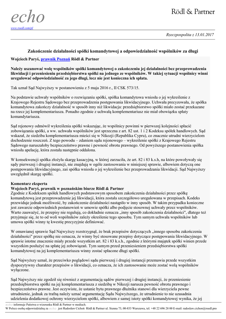 echo www.roedl.com/pl Rzeczpospolita z 13.01.2017 Zakończenie działalności spółki komandytowej a odpowiedzialność wspólników za długi Wojciech Paryś, prawnik Poznań Rödl & Partner Należy uszanować wolę wspólników spółki komandytowej o zakończeniu jej działalności bez przeprowadzenia likwidacji i przeniesieniu przedsiębiorstwa spółki na jednego ze wspólników. W takiej sytuacji wspólnicy winni uregulować odpowiedzialność za jego długi, lecz nie jest konieczna ich spłata. Tak uznał Sąd Najwyższy w postanowieniu z 5 maja 2016 r., II CSK 573/15. Na podstawie uchwały wspólników o rozwiązaniu spółki, spółka komandytowa wniosła o jej wykreślenie z Krajowego Rejestru Sądowego bez przeprowadzenia postępowania likwidacyjnego. Uchwała precyzowała, że spółka komandytowa zakończy działalność w sposób inny niż likwidacja: przedsiębiorstwo spółki miało zostać przekazane na rzecz jej komplementariusza. Ponadto zgodnie z uchwałą komplementariusz nie miał obowiązku spłaty komandytariusza. Sąd rejonowy odmówił wykreślenia spółki wskazując, że wspólnicy powinni w pierwszej kolejności spłacić zobowiązania spółki, a ww. uchwała wspólników jest sprzeczna z art. 82 ust. 1 i 2 Kodeksu spółek handlowych. Sąd wskazał, że siedziba komplementariusza mieści się w Nikozji (Republika Cypru), co znacznie utrudni wierzycielom dochodzenie roszczeń. Z tego powodu – zdaniem sądu rejonowego – wykreślenie spółki z Krajowego Rejestru Sądowego naruszałoby bezpieczeństwo prawne i pewność obrotu prawnego. Od powyższego postanowienia spółka wniosła apelację, która została następnie oddalona. W konsekwencji spółka złożyła skargę kasacyjną, w której zarzuciła, że art. 82 i 83 k.s.h, na które powoływały się sądy pierwszej i drugiej instancji, nie znajdują w ogóle zastosowania w niniejszej sprawie, albowiem dotyczą one postępowania likwidacyjnego, zaś spółka wniosła o jej wykreślenie bez przeprowadzania likwidacji. Sąd Najwyższy uwzględnił skargę spółki. Komentarz eksperta Wojciech Paryś, prawnik w poznańskim biurze Rödl & Partner Zgodnie z Kodeksem spółek handlowych podstawowym sposobem zakończenia działalności przez spółkę komandytową jest przeprowadzenie jej likwidacji, która została szczegółowo uregulowana w przepisach. Kodeks przewiduje jednak możliwość, by zakończenie działalności nastąpiło w inny sposób. W takim przypadku konieczne jest zawarcie odpowiednich postanowień w umowie spółki albo podjęcie stosownej uchwały przez wspólników. Warto zauważyć, że przepisy nie regulują, co dokładnie oznacza „inny sposób zakończenia działalności", dlatego też przyjmuje się, że to od woli wspólników zależy określenie tego sposobu. Tym samym uchwała wspólników lub umowa spółki winny tę kwestię precyzyjnie definiować. W omawianej sprawie Sąd Najwyższy rozstrzygnął, że brak przepisów dotyczących „innego sposobu zakończenia działalności" przez spółkę nie oznacza, że winny być stosowane przepisy dotyczące postępowania likwidacyjnego. W sprawie istotne znaczenie miały przede wszystkim art. 82 i 83 k.s.h., zgodnie z którymi majątek spółki winien przede wszystkim posłużyć na spłatę jej zobowiązań. Tym samym przed przeniesieniem przedsiębiorstwa spółki komandytowej na jej komplementariusza winny zostać spłacone długi spółki. Sąd Najwyższy uznał, że przeciwko poglądowi sądu pierwszej i drugiej instancji przemawia przede wszystkim dyspozytywny charakter przepisów o likwidacji, co oznacza, że ich zastosowanie może zostać wolą wspólników wyłączone. Sąd Najwyższy nie zgodził się również z argumentacją sądów pierwszej i drugiej instancji, że przeniesienie przedsiębiorstwa spółki na jej komplementariusza z siedzibą w Nikozji narusza pewność obrotu prawnego i bezpieczeństwo prawne. Jest oczywiste, że ustanie bytu prawnego dłużnika stanowi dla wierzyciela pewne utrudnienie, jednak za trafną należy uznać argumentację Sądu Najwyższego, że utrudnienie to nie uzasadnia udzielenia dodatkowej ochrony wierzycielom spółki, albowiem z samej istoty spółki komandytowej wynika, że jej echo informuje Państwa o wizerunku Rödl & Partner w mediach. W Polsce osobą odpowiedzialną za echo jest Radosław Cichoń Rödl & Partner ul. Sienna 73, 00-833 Warszawa, tel. +48 22 696 28 00 E-mail: [email protected] wspólnicy odpowiadają za jej zobowiązania, przy czym odpowiedzialność komandytariusza jest ograniczona do tzw. sumy komandytowej. Tym samym nawiązując stosunki prawne ze spółką komandytową wierzyciele winni liczyć się z tym, że być może będą musieli dochodzić wierzytelności od komplementariusza spółki nawet wtedy, gdy ma on swą siedzibę za granicą tj. tak jak w tej sprawie – w Nikozji. Nie sposób nie zgodzić się nadto ze stanowiskiem Sądu Najwyższego, że upowszechnienie się poglądu sądów pierwszej i drugiej instancji prowadzi do dyskryminacji spółek komandytowych, w których komplementariusz jest podmiotem z siedzibą za granicą, co byłoby sprzeczne z prawem europejskim jak również mogłoby stanowić naruszenie konstytucji. Argumentu za prawidłowością orzeczenia Sądu Najwyższego dostarcza również Kodeks cywilny, który nie przewiduje obowiązku uprzedniej spłaty długów przedsiębiorstwa przed jego zbyciem. W tym kontekście istotne jest jednak uregulowanie przez wspólników odpowiedzialności za długi przedsiębiorstwa. Niezależnie od tego, warto zauważyć również, że spłata wierzycieli spółki może prowadzić do tego, że komplementariusz będzie zmuszony do zbycia majątku spółki, co może mu znacznie utrudnić a nawet uniemożliwić prowadzenie przedsiębiorstwa spółki. Taka sytuacja mogłaby okazać się niekorzystna nie tylko dla pracowników i kontrahentów, ale nawet również dla wierzycieli spółki, w których 