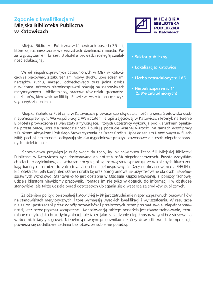 Zgodnie z kwalifikacjami Miejska Biblioteka Publiczna w Katowicach Miejska Biblioteka Publiczna w Katowicach posiada 35 filii, które sà rozmieszczone we wszystkich dzielnicach miasta. Poza wypo˝yczaniem ksià˝ek Biblioteka prowadzi rozleg∏à dzia∏alnoÊç edukacyjnà. • Sektor publiczny • Lokalizacja: Katowice WÊród niepe∏nosprawnych zatrudnionych w MBP w Katowicach sà pracownicy z zaburzeniami mowy, s∏uchu, upoÊledzeniami narzàdów ruchu, narzàdu oddechowego oraz jedna osoba niewidoma. Wszyscy niepe∏nosprawni pracujà na stanowiskach merytorycznych – bibliotekarzy, pracowników dzia∏u gromadzenia zbiorów, kierowników filii itp. Prawie wszyscy to osoby z wy˝szym wykszta∏ceniem. • Liczba zatrudnionych: 185 • Niepe∏nosprawni: 11 (5,9% zatrudnionych) Miejska Biblioteka Publiczna w Katowicach prowadzi szerokà dzia∏alnoÊç na rzecz Êrodowiska osób niepe∏nosprawnych. We wspó∏pracy z Warsztatem Terapii Zaj´ciowej w Katowicach Promyk na terenie Biblioteki prowadzone sà warsztaty aktywizujàce, których uczestnicy wykonujà pod kierunkiem opiekuna proste prace, uczà si´ samodzielnoÊci i budujà poczucie w∏asnej wartoÊci. W ramach wspó∏pracy z Punktem Aktywizacji Polskiego Stowarzyszenia na Rzecz Osób z UpoÊledzeniem Umys∏owym w filiach MBP, pod okiem trenera, odbywajà si´ dwutygodniowe praktyki zawodowe dla osób niepe∏nosprawnych intelektualnie. Kierownictwo przywiàzuje du˝à wag´ do tego, by jak najwi´ksza liczba filii Miejskiej Biblioteki Publicznej w Katowicach by∏a dostosowana do potrzeb osób niepe∏nosprawnych. Przede wszystkim chodzi tu o czytelników, ale wdra˝ane przy tej okazji rozwiàzania sprawiajà, ˝e w kolejnych filiach znikajà bariery na drodze do zatrudniania osób niepe∏nosprawnych. Dzi´ki dofinansowaniu z PFRON-u Biblioteka zakupi∏a komputer, skaner i drukark´ oraz oprogramowanie przystosowane dla osób niepe∏nosprawnych wzrokowo. Stanowisko to jest dost´pne w Oddziale Ksià˝ki Mówionej, a pomocy fachowej udziela klientom niewidomy pracownik. Pomaga im nie tylko w dotarciu do informacji i w obs∏udze stanowiska, ale tak˝e udziela porad dotyczàcych ubiegania si´ o wsparcie ze Êrodków publicznych. Za∏o˝eniem polityki personalnej katowickiej MBP jest zatrudnianie niepe∏nosprawnych pracowników na stanowiskach merytorycznych, które wymagajà wysokich kwalifikacji i wykszta∏cenia. W rezultacie nie sà oni postrzegani przez wspó∏pracowników i prze∏o˝onych przez pryzmat swojej niepe∏nosprawnoÊci, lecz przez pryzmat kompetencji. Konsekwencjà takiego podejÊcia jest równe traktowanie, rozumiane nie tylko jako brak dyskryminacji, ale tak˝e jako zarzàdzanie niepe∏nosprawnymi bez stosowania wobec nich taryfy ulgowej. Niepe∏nosprawnym pracownikom, którzy dowiedli swoich kompetencji, powierza si´ dodatkowe zadania bez obaw, ˝e sobie nie poradzà.