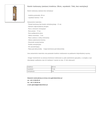 Komin izolowany (zestaw) średnica: 20cm, wysokość: 7mb, bez wentylacji Komin izolowany (zestaw) bez wentylacji - średnica przewodu: 20 cm - wysokość komina: 7 mb Zestawienie materiału : - Pustak kominowy bez kanału wentylacyjnego - 21 szt. - Element odprowadzenia skroplin - Rura z otworem rewizyjnym - Rura prosta - 17 szt. - Rura podłączenia pieca - Wełna mineralna - 7 szt. - Płyta czołowa z wełny mineralnej - Osłona zakończenia komina - Drzwiczki rewizji komina - Kratka wentylacyjna - Kit uszczelniający - Płyta pod obmurówkę - Czapa kominowa pod obmurówkę Inne zestawienie materiału oraz pozostałe średnice realizowane na podstawie indywidualnej wyceny. Uwaga! Zamówienie na zestawy kominowe traktowane sa jako zamówienia specjalne, w związku z tym obowiązuje wydłużony czas ich realizacji i wynosi on max. 21 dni roboczych. średnica: 20 cm wysokość: 7 mb wentylacja: nie Dokument został pobrany ze strony www.galeriakominkow.pl tel. +48 12 250-09-45 fax. +48 12 250-09-46 e-mail: [email protected]