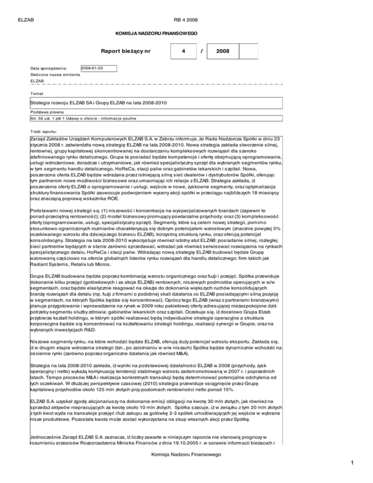 ELZAB RB 4 2008 KOMISJA NADZORU FINANSOWEGO Raport bieżący nr Data sporządzenia: 4 / 2008 2008-01-23 Skrócona nazwa emitenta ELZAB Temat Strategia rozwoju ELZAB SA i Grupy ELZAB na lata 2008-2010 Podstawa prawna Art. 56 ust. 1 pkt 1 Ustawy o ofercie - informacje poufne Treść raportu: Zarząd Zakładów Urządzeń Komputerowych ELZAB S.A. w Zabrzu informuje, że Rada Nadzorcza Spółki w dniu 23 stycznia 2008 r. zatwierdziła nową strategię ELZAB na lata 2008-2010. Nowa strategia zakłada stworzenie silnej, rentownej, grupy kapitałowej skoncentrowanej na dostarczaniu kompleksowych rozwiązań dla szeroko zdefiniowanego rynku detalicznego. Grupa ta posiadać będzie kompetencje i ofertę obejmującą oprogramowanie, usługi wdrożeniowe, doradcze i utrzymaniowe, jak również specjalistyczny sprzęt dla wybranych segmentów rynku, w tym segmentu handlu detalicznego, HoReCa, stacji paliw oraz gabinetów lekarskich i szpitali. Nowa, poszerzona oferta ELZAB będzie wdrażana przez istniejącą silną sieć dealerów i dystrybutorów Spółki, oferując tym partnerom nowe możliwości biznesowe oraz umacniając ich relacje z ELZAB. Strategia zakłada, iż poszerzenie oferty ELZAB o oprogramowanie i usługi, wejście w nowe, zyskowne segmenty, oraz optymalizacja struktury finansowania Spółki zaowocuje podwojeniem wyceny akcji spółki w przeciągu najbliższych 18 miesięcy oraz znaczącą poprawą wskaźnika ROE. Podstawami nowej strategii są: (1) niszowość i koncentracja na wyspecjalizowanych branżach (zapewni to ponad-przeciętną rentowność); (2) model biznesowy promujący powtarzalne przychody; oraz (3) kompleksowość oferty (oprogramowanie, usługi, specjalistyczny sprzęt). Segmenty, które są celem nowej strategii, pomimo stosunkowo ograniczonych rozmiarów charakteryzują się dobrym potencjałem wzrostowym (znacznie powyżej 5% oczekiwanego wzrostu dla dzisiejszego biznesu ELZAB), korzystną strukturą rynku, oraz oferują potencjał konsolidacyjny. Strategia na lata 2008-2010 wykorzystuje również istotny atut ELZAB: posiadanie silnej, rozległej sieci partnerów będących w stanie zarówno sprzedawać, wdrażać jak również serwisować rozwiązania na rynkach specjalistycznego detalu, HoReCa i stacji paliw. Wdrażając nową strategię ELZAB budować będzie Grupę wzorowaną częściowo na ofercie globalnych liderów rynku rozwiązań dla handlu detalicznego: firm takich jak Radiant Systems, Retalix lub Micros. Grupa ELZAB budowana będzie poprzez kombinację wzrostu organicznego oraz fuzji i przejęć. Spółka przewiduje dokonanie kilku przejęć (gotówkowych i za akcje ELZAB) rentownych, niszowych podmiotów operujących w w/w segmentach, oraz będzie elastycznie reagować na okazje do dokonania większych ruchów konsolidujących branżę rozwiązań dla detalu (np. fuzji z firmami o podobnej skali działania co ELZAB posiadającymi silną pozycję w segmentach, na których Spółka będzie się koncentrować). Oprócz tego ELZAB (wraz z partnerami branżowymi) planuje przygotowanie i wprowadzenie na rynek w 2009 roku pakietowej oferty adresującej niezaspokojone dziś potrzeby segmentu służby zdrowia: gabinetów lekarskich oraz szpitali. Oczekuje się, iż docelowo Grupa Elzab przybierze kształt holdingu, w którym spółki realizować będą indywidualne strategie operacyjne a struktura korporacyjna będzie się koncentrować na kształtowaniu strategii holdingu, realizacji synergii w Grupie, oraz na wybranych inwestycjach R&D. Niszowe segmenty rynku, na które wchodzić będzie ELZAB, oferują duży potencjał wzrostu eksportu. Zakłada się, iż w drugim etapie wdrożenia strategii (tzn., po zaistnieniu w w/w niszach) Spółka będzie dynamicznie wchodzić na ościenne rynki (zarówno poprzez organiczne działania jak również M&A). Strategia na lata 2008-2010 zakłada, iż wyniki na podstawowej działalności ELZAB w 2008 (przychody, zysk operacyjny i netto) wykażą kontynuację tendencji stabilnego wzrostu zademonstrowaną w 2007 r. i poprzednich latach. Tempo procesów M&A i realizacja konkretnych transakcji będą determinować potencjalne odchylenia od tych oczekiwań. W dłuższej perspektywie czasowej (2010) strategia przewiduje osiągnięcie przez Grupę kapitałową przychodów około 125 mln złotych przy poziomach rentowności netto ponad 15%. ELZAB S.A. uzyskał zgodę akcjonariuszy na dokonanie emisji obligacji na kwotę 30 mln złotych, jak również na sprzedaż aktywów niepracujących za kwotę około 10 mln złotych. Spółka szacuje, iż w związku z tym 20 mln złotych z tych kwot wyda na transakcje przejęć i/lub zakupu za gotówkę 2-3 spółek umożliwiających jej wejście w wybrane nisze produktowe. Pozostała kwota może zostać wykorzystana na skup własnych akcji przez Spółkę. Jednocześnie Zarząd ELZAB S.A. zaznacza, iż liczby zawarte w niniejszym raporcie nie stanowią prognozy w rozumieniu przepisów Rozporządzenia Ministra Finansów z dnia 19.10.2005 r. w sprawie informacji bieżących i Komisja Nadzoru Finansowego 1 ELZAB RB 4 2008 rozumieniu przepisów Rozporządzenia Ministra Finansów z dnia 19.10.2005 r. w sprawie informacji bieżących i okresowych przekazywanych przez emitentów papierów wartościowych. ZAKŁADY URZĄDZEŃ KOMPUTEROWYCH ELZAB SA (pełna nazwa emitenta) ELZAB Informatyka (inf) (skróc ona nazwa emitenta) 41-813 (sektor wg. klasyfikacji GPW w W-wie) Zabrze (kod pocztowy) (miejscowość) ul. Kruc zkowskiego 39 (ulica) (numer) (032) 272 20 21 272 25 83 (telefon) (fax) [email protected] www.elzab.com.pl (e-mail) (www) 6480000255 270036336 (NIP) (REGON) PODPISY OSÓB REPREZENTUJĄCYCH SPÓŁKĘ Data Imię i Nazwisko Stanowisko/Funkc ja 2008-01-23 Jerzy Biernat Prezes Zarządu 2008-01-23 Elżbieta Załóg Prokurent Podpis Komisja Nadzoru Finansowego 2