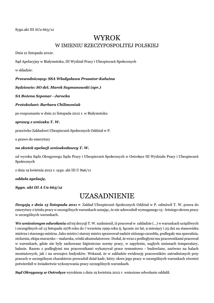 Sygn.akt III AUa 663/12 WYROK W IMIENIU RZECZYPOSPOLITEJ POLSKIEJ Dnia 21 listopada 2012r. Sąd Apelacyjny w Białymstoku, III Wydział Pracy i Ubezpieczeń Społecznych w składzie: Przewodniczący: SSA Władysława Prusator-Kałużna Sędziowie: SO del. Marek Szymanowski (spr.) SA Bożena Szponar - Jarocka Protokolant: Barbara Chilimoniuk po rozpoznaniu w dniu 21 listopada 2012 r. w Białymstoku sprawy z wniosku T. W. przeciwko Zakładowi Ubezpieczeń Społecznych Oddział w P. o prawo do emerytury na skutek apelacji wnioskodawcy T. W. od wyroku Sądu Okręgowego Sądu Pracy i Ubezpieczeń Społecznych w Ostrołęce III Wydziału Pracy i Ubezpieczeń Społecznych z dnia 19 kwietnia 2012 r. sygn. akt III U 896/11 oddala apelację. Sygn. akt III A Ua 663/12 UZASADNIENIE Decyzją z dnia 15 listopada 2011 r. Zakład Ubezpieczeń Społecznych Oddział w P. odmówił T. W. prawa do emerytury z tytułu pracy w szczególnych warunkach uznając, że nie udowodnił wymaganego 15 - letniego okresu pracy w szczególnych warunkach. We wniesionym odwołaniu od tej decyzji T. W. nadmienił, iż pracował w zakładzie (...) w warunkach uciążliwych i szczególnych od 13 listopada 1978 roku do 7 września 1999 roku tj. łącznie 20 lat, 9 miesięcy i 25 dni na stanowisku mistrza i starszego mistrza. Jako mistrz i starszy mistrz sprawował nadzór niższego szczebla, podlegały mu spawalnia, stolarnia, ekipa murarsko – malarska, wózki akumulatorowe. Dodał, że wraz z podległymi mu pracownikami pracował w warunkach, gdzie nie były zachowane higieniczne normy pracy, w zapyleniu, nagłych zmianach temperatury, hałasie. Razem z podległymi mu pracownikami wykonywał prace remontowo - budowlane, zarówno na halach montażowych, jak i na zewnątrz budynków. Wskazał, że w zakładzie ewidencję pracowników zatrudnionych przy pracach w szczególnym charakterze prowadził dział kadr, który okres jego pracy w szczególnych warunkach również potwierdził w świadectwie wykonywania pracy szczególnych warunkach. Sąd Okręgowy w Ostrołęce wyrokiem z dnia 19 kwietnia 2012 r. wniesione odwołanie oddalił. Sąd Okręgowy wskazał, iż wniesione odwołanie rozpatrywał pod kątem przepisów prawa materialnego regulujących prawo do wcześniejszej emerytury tj. art. 184 ustawy o emeryturach i rentach z Funduszu Ubezpieczeń Społecznych (tekst jedn. Dz. U. z 2009 r., Nr 153, poz.1227 ze zm.) w zw. z §4 rozporządzenia Rady Ministrów z dnia 07.02.1983 r. w sprawie wieku emerytalnego pracowników zatrudnionych w szczególnych warunkach lub w szczególnym charakterze (Dz. U. Nr 8, poz. 43 ze zm.), gdyż urodził się on 29 listopada 1951 roku. Zgodnie z tymi przepisami prawo do emerytury przysługuje ubezpieczonemu urodzonemu po 01.01.1949 r., jeżeli: - osiągnął wiek emerytalny wynoszący 60 lat dla mężczyzn, - nie przystąpił do otwartego funduszu emerytalnego lub złożył wniosek o przekazanie środków zgromadzonych na rachunku w OFE, za pośrednictwem Zakładu na dochody budżetu państwa, - rozwiązał stosunek pracy, w przypadku ubezpieczonego będącego pracownikiem, - w dniu 01.01.1999 r. udowodnił 25-letni okres składkowy i nieskładkowy, w tym co najmniej 15 lat pracy w szczególnych warunkach. Zgodnie z treścią § 2 ust. 1 powołanego rozporządzenia Rady Ministrów z dnia 07.02.1983 r. okresami pracy uzasadniającymi prawo do świadczeń na zasadach określonych w rozporządzeniu są okresy, w których praca w szczególnych warunkach lub w szczególnym charakterze jest wykonywana stale i w pełnym wymiarze czasu pracy obowiązującym na danym stanowisku pracy. Regułą jest, że okresy pracy w szczególnych warunkach stwierdza zakład pracy, na podstawie posiadanej dokumentacji, w świadectwie wykonywania pracy w szczególnych warunkach, wystawionym według wzoru stanowiącego załącznik do przepisów wydanych na podstawie § 1 ust. 2 rozporządzenia lub w świadectwie pracy (tak: § 2 ust. 2 rozporządzenia Rady Ministrów z dnia 07.02.1983 r.). W postępowaniu przed sądem ubezpieczeń - utrwalone orzecznictwo Sądu Najwyższego pozwala na wykazywanie okoliczności, od których zależy nabycie uprawnień wszelkimi dowodami (wyrok SN z dnia 06.09.1995r., II URN 23/95, OSNP 1996/5/77, wyrok SN z dnia 02.02.1996r., II URN 3/95, OSNP 1996/16/239). Zdaniem Sądu Okręgowego zasadniczą kwestią wymagająca rozstrzygnięcia w przedmiotowej sprawie było ustalenie, czy charakter pracy T. W. w (...) W., w spornym okresie pozwala na uznanie jej jako pracy wykonywanej w szczególnych warunkach bądź szczególnym charakterze w rozumieniu przepisów rozporządzenia Rady Ministrów z dnia 07.02.1983r. w sprawie wieku emerytalnego pracowników zatrudnionych w szczególnych warunkach lub w szczególnym charakterze (Dz. U. Nr 8, poz. 43 ze. zm.). Na te okoliczności Sąd Okręgowy przesłuchał zawnioskowanych przez odwołującego się świadków oraz jego samego w charakterze strony, przeprowadził też dowód z dokumentów z akt osobowych oraz dokumentów z akt emerytalnych. Z zeznań świadków Z. B. i A. S. oraz odwołującego przesłuchanego w charakterze strony wynikało, że w spornym okresie od 1978 roku do 1999 roku charakter pracy odwołującego w (...) W. (następnie (...) W.) był zasadniczo taki sam. T. W. był mistrzem w dziale Głównego Mechanika. Do jego obowiązków należał szeroko rozumiany nadzór nad wszystkimi pracami konserwatorskimi i remontowo-budowlanymi w całym zakładzie. T. W. nadzorował ekipę spawaczy, ekipę remontującą wózki spalinowe i elektryczne, brygadę malarzy oraz murarzy, w tym betoniarzy i zbrojarzy, którzy zajmowali się m.in. remontami, wyburzaniem ścianek, malowaniem maszyn, pomieszczeń, elewacji, naprawą przeciekających dachów, lepikowaniem, kuciem starych fundamentów i wykonywaniem nowych. Do jego obowiązków należał też nadzór nad ekipą stolarzy, którzy wykonywali różne drewniane elementy, palety, drewniane wstawki na w