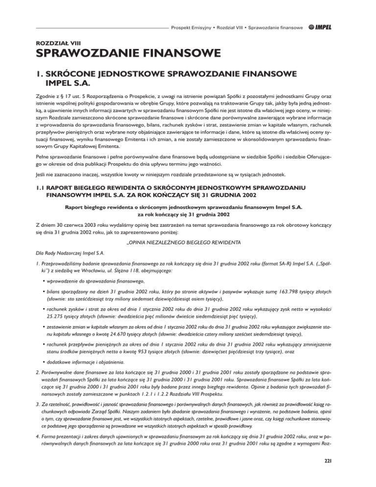 Prospekt Emisyjny • Rozdzia∏ VIII • Sprawozdanie finansowe ROZDZIA¸ VIII SPRAWOZDANIE FINANSOWE 1. SKRÓCONE JEDNOSTKOWE SPRAWOZDANIE FINANSOWE IMPEL S.A. Zgodnie z § 17 ust. 5 Rozporzàdzenia o Prospekcie, z uwagi na istnienie powiàzaƒ Spó∏ki z pozosta∏ymi jednostkami Grupy oraz istnienie wspólnej polityki gospodarowania w obr´bie Grupy, które pozwalajà na traktowanie Grupy tak, jakby by∏a jednà jednostkà, a ujawnienie innych informacji zawartych w sprawozdaniu finansowym Spó∏ki nie jest istotne dla w∏aÊciwej jego oceny, w niniejszym Rozdziale zamieszczono skrócone sprawozdanie finansowe i skrócone dane porównywalne zawierajàce wybrane informacje z wprowadzenia do sprawozdania finansowego, bilans, rachunek zysków i strat, zestawienie zmian w kapitale w∏asnym, rachunek przep∏ywów pieni´˝nych oraz wybrane noty objaÊniajàce zawierajàce te informacje i dane, które sà istotne dla w∏aÊciwej oceny sytuacji finansowej, wyniku finansowego Emitenta i ich zmian, a nie zosta∏y zamieszczone w skonsolidowanym sprawozdaniu finansowym Grupy Kapita∏owej Emitenta. Pe∏ne sprawozdanie finansowe i pe∏ne porównywalne dane finansowe b´dà udost´pniane w siedzibie Spó∏ki i siedzibie Oferujàcego w okresie od dnia publikacji Prospektu do dnia up∏ywu terminu jego wa˝noÊci. JeÊli nie zaznaczono inaczej, wszystkie kwoty w niniejszym rozdziale przedstawione sà w tysiàcach jednostek. 1.1 RAPORT BIEG¸EGO REWIDENTA O SKRÓCONYM JEDNOSTKOWYM SPRAWOZDANIU FINANSOWYM IMPEL S.A. ZA ROK KO¡CZÑCY SI¢ 31 GRUDNIA 2002 Raport bieg∏ego rewidenta o skróconym jednostkowym sprawozdaniu finansowym Impel S.A. za rok koƒczàcy si´ 31 grudnia 2002 Z dniem 30 czerwca 2003 roku wydaliÊmy opini´ bez zastrze˝eƒ na temat sprawozdania finansowego za rok obrotowy koƒczàcy si´ dnia 31 grudnia 2002 roku, jak to zaprezentowano poni˝ej: „OPINIA NIEZALE˚NEGO BIEG¸EGO REWIDENTA Dla Rady Nadzorczej Impel S.A. 1. PrzeprowadziliÊmy badanie sprawozdania finansowego za rok koƒczàcy si´ dnia 31 grudnia 2002 roku (format SA-R) Impel S.A. („Spó∏ki”) z siedzibà we Wroc∏awiu, ul. Âl´˝na 118, obejmujàcego: • wprowadzenie do sprawozdania finansowego, • bilans sporzàdzony na dzieƒ 31 grudnia 2002 roku, który po stronie aktywów i pasywów wykazuje sum´ 163.798 tysi´cy z∏otych (s∏ownie: sto szeÊçdziesiàt trzy miliony siedemset dziewi´çdziesiàt osiem tysi´cy), • rachunek zysków i strat za okres od dnia 1 stycznia 2002 roku do dnia 31 grudnia 2002 roku wykazujàcy zysk netto w wysokoÊci 25.275 tysi´cy z∏otych (s∏ownie: dwadzieÊcia pi´ç milionów dwieÊcie siedemdziesiàt pi´ç tysi´cy), • zestawienie zmian w kapitale w∏asnym za okres od dnia 1 stycznia 2002 roku do dnia 31 grudnia 2002 roku wykazujàce zwi´kszenie stanu kapita∏u w∏asnego o kwot´ 24.670 tysi´cy z∏otych (s∏ownie: dwadzieÊcia cztery miliony szeÊçset siedemdziesiàt tysi´cy), • rachunek przep∏ywów pieni´˝nych za okres od dnia 1 stycznia 2002 roku do dnia 31 grudnia 2002 roku wykazujàcy zmniejszenie stanu Êrodków pieni´˝nych netto o kwot´ 953 tysiàce z∏otych (s∏ownie: dziewi´çset pi´çdziesiàt trzy tysiàce), oraz • dodatkowe informacje i objaÊnienia. 2. Porównywalne dane finansowe za lata koƒczàce si´ 31 grudnia 2000 i 31 grudnia 2001 roku zosta∏y sporzàdzone na podstawie sprawozdaƒ finansowych Spó∏ki za lata koƒczàce si´ 31 grudnia 2000 i 31 grudnia 2001 roku. Sprawozdania finansowe Spó∏ki za lata koƒczàce si´ 31 grudnia 2000 i 31 grudnia 2001 roku by∏y badane przez innego bieg∏ego rewidenta. Opinie z badania tych sprawozdaƒ finansowych zosta∏y zamieszczone w punktach 1.2.1 i 1.2.2 Rozdzia∏u VIII Prospektu. 3. Za rzetelnoÊç, prawid∏owoÊç i jasnoÊç sprawozdania finansowego i porównywalnych danych finansowych, jak równie˝ za prawid∏owoÊç ksiàg rachunkowych odpowiada Zarzàd Spó∏ki. Naszym zadaniem by∏o zbadanie sprawozdania finansowego i wyra˝enie, na podstawie badania, opinii o tym, czy sprawozdanie finansowe jest, we wszystkich istotnych aspektach, rzetelne, prawid∏owe i jasne oraz, czy ksi´gi rachunkowe stanowiàce podstaw´ jego sporzàdzenia sà prowadzone we wszystkich istotnych aspektach w sposób prawid∏owy. 4. Forma prezentacji i zakres danych ujawnionych w sprawozdaniu finansowym za rok koƒczàcy si´ dnia 31 grudnia 2002 roku, oraz w porównywalnych danych finansowych za lata koƒczàce si´ 31 grudnia 2000 roku oraz 31 grudnia 2001 roku sà zgodne z wymogami Roz221 Prospekt Emisyjny • Rozdzia∏ VIII • Sprawozdanie finansowe porzàdzenia Rady Ministrów z dnia 16 paêdziernika 2001 roku w sprawie szczegó∏owych warunków, jakim powinien odpowiadaç prospekt emisyjny oraz skrót prospektu (Dz.U. Nr 139, poz. 1568, z póêniejszymi zmianami). 5. Badanie sprawozdania finansowego przeprowadziliÊmy stosownie do obowiàzujàcych w Polsce postanowieƒ: • rozdzia∏u 7 ustawy z dnia 29 wrzeÊnia 1994 roku o rachunkowoÊci („ustawa”), • norm wykonywania zawodu bieg∏ego rewidenta wydanych przez Krajowà Rad´ Bieg∏ych Rewidentów, w taki sposób, aby uzyskaç racjonalnà pewnoÊç co do tego, czy sprawozdanie to oraz ksi´gi rachunkowe nie zawierajà istotnych nieprawid∏owoÊci. W szczególnoÊci badanie obejmowa∏o sprawdzenie – w du˝ej mierze metodà wyrywkowà – dokumentacji, z której wynikajà kwoty i informacje zawarte w sprawozdaniu finansowym. Badanie obejmowa∏o równie˝ ocen´ poprawnoÊci przyj´tych i stosowanych przez Zarzàd zasad rachunkowoÊci i znaczàcych szacunków dokonanych przez Zarzàd, jak i ogólnej prezentacji sprawozdania finansowego. Uwa˝amy, ˝e przeprowadzone przez nas badanie dostarczy∏o nam wystarczajàcych podstaw do wyra˝enia opinii o sprawozdaniu finansowym traktowanym jako ca∏oÊç. 6. Sprawozdanie finansowe za poprzedni rok obrotowy koƒczàcy si´ dnia 31 grudnia 2001 roku by∏o przedmio