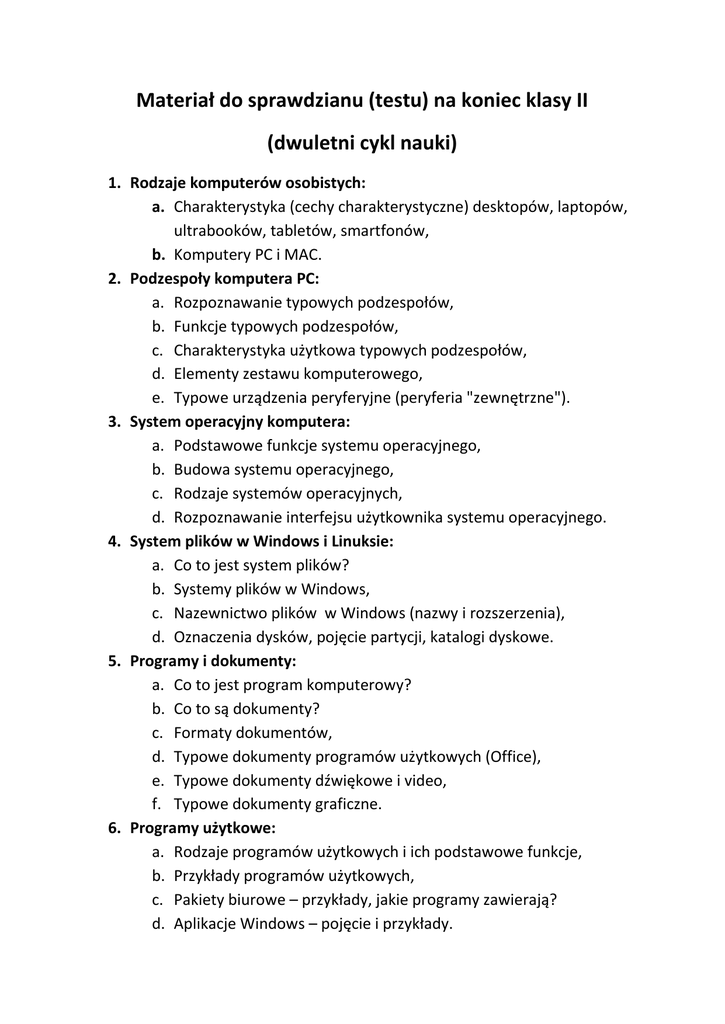 Materiał do sprawdzianu (testu) na koniec klasy II (dwuletni cykl nauki) 1. Rodzaje komputerów osobistych: a. Charakterystyka (cechy charakterystyczne) desktopów, laptopów, ultrabooków, tabletów, smartfonów, b. Komputery PC i MAC. 2. Podzespoły komputera PC: a. Rozpoznawanie typowych podzespołów, b. Funkcje typowych podzespołów, c. Charakterystyka użytkowa typowych podzespołów, d. Elementy zestawu komputerowego, e. Typowe urządzenia peryferyjne (peryferia "zewnętrzne"). 3. System operacyjny komputera: a. Podstawowe funkcje systemu operacyjnego, b. Budowa systemu operacyjnego, c. Rodzaje systemów operacyjnych, d. Rozpoznawanie interfejsu użytkownika systemu operacyjnego. 4. System plików w Windows i Linuksie: a. Co to jest system plików? b. Systemy plików w Windows, c. Nazewnictwo plików w Windows (nazwy i rozszerzenia), d. Oznaczenia dysków, pojęcie partycji, katalogi dyskowe. 5. Programy i dokumenty: a. Co to jest program komputerowy? b. Co to są dokumenty? c. Formaty dokumentów, d. Typowe dokumenty programów użytkowych (Office), e. Typowe dokumenty dźwiękowe i video, f. Typowe dokumenty graficzne. 6. Programy użytkowe: a. Rodzaje programów użytkowych i ich podstawowe funkcje, b. Przykłady programów użytkowych, c. Pakiety biurowe – przykłady, jakie programy zawierają? d. Aplikacje Windows – pojęcie i przykłady. e. Office i OpenOffice - korzystanie z typowych aplikacji: i. Podstawowe zasady tworzenia dokumentów tekstowych WORD, Writer, ii. Budowa, funkcje i zastosowania arkuszy kalkulacyjnych Excel, Calc, iii. Tworzenie prezentacji multimedialnych - PowerPoint, Impress, iv. Elementy baz danych - Excel. 7. Sieci komputerowe: a. Co to jest sieć komputerowa? b. Podział sieci komputerowych – topologie, c. Podział sieci komputerowych – architektura, d. Adres IP komputera, e. Programy do testowania sieci - IPCONFIG i PING. 8. Korzystanie z Internetu: a. Przeglądarki internetowe, b. Podstawowe usługi w Internecie, c. Przykłady programów do korzystania z Internetu – Windows i Linux, d. Nazwy komputerów w Internecie, e. Pojęcie „wyszukiwarka internetowa”. f. Publikowanie w Internecie - elementy HTML. 9. Grafika komputerowa: a. Podział grafiki komputerowej, b. Jak komputer traktuje obraz (w grafice bitowej)? c. Jak "pamiętany" jest obraz w grafice wektorowej? d. Obliczanie wielkości pliku obrazu, e. Pojęcie „rozdzielczość” (obrazu), 10.Linux – system operacyjny Free Software: a. Pojęcie „wolne oprogramowanie”, b. Dostępność Linuksa, c. Linux i Windows – porównanie systemów, d. Typowe programy użytkowe w systemie Linux, e. Pojęcie dystrybucji Linuxa, popularne dystrybucje.