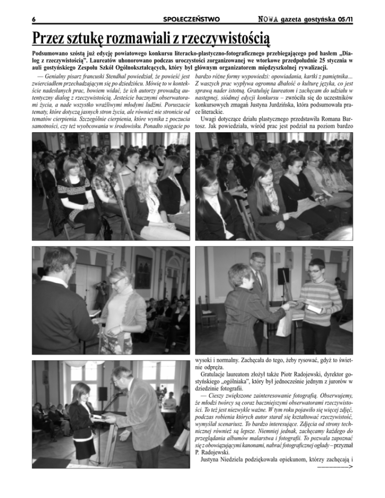6 SPO£ECZEÑSTWO NOWA gazeta gostyñska 05/11 Przez sztukê rozmawiali z rzeczywistoci¹ Podsumowano szóst¹ ju¿ edycjê powiatowego konkursu literacko-plastyczno-fotograficznego przebiegaj¹cego pod has³em Dialog z rzeczywistoci¹. Laureatów uhonorowano podczas uroczystoci zorganizowanej we wtorkowe przedpo³udnie 25 stycznia w auli gostyñskiego Zespo³u Szkó³ Ogólnokszta³c¹cych, który by³ g³ównym organizatorem miêdzyszkolnej rywalizacji. Genialny pisarz francuski Stendhal powiedzia³, ¿e powieæ jest bardzo ró¿ne formy wypowiedzi: opowiadania, kartki z pamiêtnika zwierciad³em przechadzaj¹cym siê po dziedziñcu. Mówiê to w kontek- Z waszych prac wyp³ywa ogromna dba³oæ o kulturê jêzyka, co jest cie nades³anych prac, bowiem widaæ, ¿e ich autorzy prowadz¹ au- spraw¹ nader istotn¹. Gratulujê laureatom i zachêcam do udzia³u w tentyczny dialog z rzeczywistoci¹. Jestecie bacznymi obserwatora- nastêpnej, siódmej edycji konkursu zwróci³a siê do uczestników mi ¿ycia, a nade wszystko wra¿liwymi m³odymi ludmi. Poruszacie konkursowych zmagañ Justyna Jurdziñska, która podsumowa³a pratematy, które dotycz¹ jasnych stron ¿ycia, ale równie¿ nie stronicie od ce literackie. tematów cierpienia. Szczególnie cierpienia, które wynika z poczucia Uwagi dotycz¹ce dzia³u plastycznego przedstawi³a Romana Barsamotnoci, czy te¿ wyobcowania w rodowisku. Ponadto siêgacie po tosz. Jak powiedzia³a, wród prac jest podzia³ na poziom bardzo wysoki i normalny. Zachêca³a do tego, ¿eby rysowaæ, gdy¿ to wietnie odprê¿a. Gratulacje laureatom z³o¿y³ tak¿e Piotr Radojewski, dyrektor gostyñskiego ogólniaka, który by³ jednoczenie jednym z jurorów w dziedzinie fotografii. Cieszy zwiêkszone zainteresowanie fotografi¹. Obserwujemy, ¿e m³odzi twórcy s¹ coraz baczniejszymi obserwatorami rzeczywistoci. To te¿ jest niezwykle wa¿ne. W tym roku pojawi³o siê wiêcej zdjêæ, podczas robienia których autor stara³ siê kszta³towaæ rzeczywistoæ, wymyla³ scenariusz. To bardzo interesuj¹ce. Zdjêcia od strony technicznej równie¿ s¹ lepsze. Niemniej jednak, zachêcamy ka¿dego do przegl¹dania albumów malarstwa i fotografii. To pozwala zapoznaæ siê z obowi¹zuj¹cymi kanonami, nabraæ fotograficznej og³ady przyzna³ P. Radojewski. Justyna Niedziela podziêkowa³a opiekunom, którzy zachêcaj¹ i >