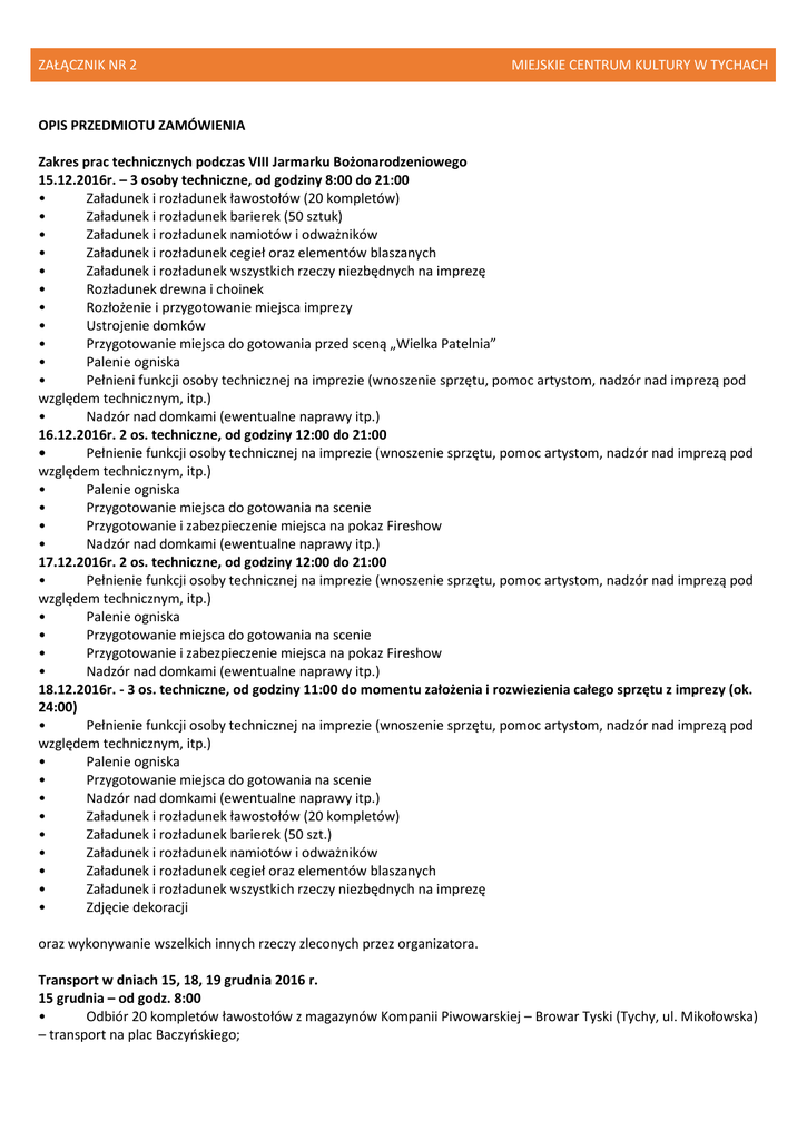 ZAŁĄCZNIK NR 2 MIEJSKIE CENTRUM KULTURY W TYCHACH OPIS PRZEDMIOTU ZAMÓWIENIA Zakres prac technicznych podczas VIII Jarmarku Bożonarodzeniowego 15.12.2016r. – 3 osoby techniczne, od godziny 8:00 do 21:00 • Załadunek i rozładunek ławostołów (20 kompletów) • Załadunek i rozładunek barierek (50 sztuk) • Załadunek i rozładunek namiotów i odważników • Załadunek i rozładunek cegieł oraz elementów blaszanych • Załadunek i rozładunek wszystkich rzeczy niezbędnych na imprezę • Rozładunek drewna i choinek • Rozłożenie i przygotowanie miejsca imprezy • Ustrojenie domków • Przygotowanie miejsca do gotowania przed sceną „Wielka Patelnia” • Palenie ogniska • Pełnieni funkcji osoby technicznej na imprezie (wnoszenie sprzętu, pomoc artystom, nadzór nad imprezą pod względem technicznym, itp.) • Nadzór nad domkami (ewentualne naprawy itp.) 16.12.2016r. 2 os. techniczne, od godziny 12:00 do 21:00 • Pełnienie funkcji osoby technicznej na imprezie (wnoszenie sprzętu, pomoc artystom, nadzór nad imprezą pod względem technicznym, itp.) • Palenie ogniska • Przygotowanie miejsca do gotowania na scenie • Przygotowanie i zabezpieczenie miejsca na pokaz Fireshow • Nadzór nad domkami (ewentualne naprawy itp.) 17.12.2016r. 2 os. techniczne, od godziny 12:00 do 21:00 • Pełnienie funkcji osoby technicznej na imprezie (wnoszenie sprzętu, pomoc artystom, nadzór nad imprezą pod względem technicznym, itp.) • Palenie ogniska • Przygotowanie miejsca do gotowania na scenie • Przygotowanie i zabezpieczenie miejsca na pokaz Fireshow • Nadzór nad domkami (ewentualne naprawy itp.) 18.12.2016r. - 3 os. techniczne, od godziny 11:00 do momentu założenia i rozwiezienia całego sprzętu z imprezy (ok. 24:00) • Pełnienie funkcji osoby technicznej na imprezie (wnoszenie sprzętu, pomoc artystom, nadzór nad imprezą pod względem technicznym, itp.) • Palenie ogniska • Przygotowanie miejsca do gotowania na scenie • Nadzór nad domkami (ewentualne naprawy itp.) • Załadunek i rozładunek ławostołów (20 kompletów) • Załadunek i rozładunek barierek (50 szt.) • Załadunek i rozładunek namiotów i odważników • Załadunek i rozładunek cegieł oraz elementów blaszanych • Załadunek i rozładunek wszystkich rzeczy niezbędnych na imprezę • Zdjęcie dekoracji oraz wykonywanie wszelkich innych rzeczy zleconych przez organizatora. Transport w dniach 15, 18, 19 grudnia 2016 r. 15 grudnia – od godz. 8:00 • Odbiór 20 kompletów ławostołów z magazynów Kompanii Piwowarskiej – Browar Tyski (Tychy, ul. Mikołowska) – transport na plac Baczyńskiego; ZAŁĄCZNIK NR 2 MIEJSKIE CENTRUM KULTURY W TYCHACH • transport barierek zabezpieczających imprezę z O.W. Paprocany (Tychy, ul. Parkowa) – transport na plac Baczyńskiego; • transport namiotów oraz sprzętu na potrzeby imprezy z MCK (Tychy, ul. Boh. Warszawy) – transport na plac Baczyńskiego; • transport drewna opałowego 3 m³ (na potrzeby ogniska podczas imprezy) z Kobióra (Kobiór, ul. Leśników) transport na plac Baczyńskiego; • transport 10 choinek o wys. od 2,5 m do 3 m z Kobióra (Kobiór, ul. Leśników) – transport na plac Baczyńskiego; 18 grudnia – od godz. 21:00 • odwóz barierek zabezpieczających imprezę z pl. Baczyńskiego do O.W. Paprocany (Tychy, ul. Parkowa); • odwóz namiotów do MCK (Tychy, ul. Boh. Warszawy); • odwóz sprzętu do MCK (Tychy, ul. Boh. Warszawy); 19 grudnia – od godz. 8:00 • odwóz 20 kompletów ławostołów z MCK (Tychy, ul. Boh. Warszawy) do magazynów Kompanii Piwowarskiej – Browar Tyski (Tychy, ul. Mikołowska); dodatkowo: dyżur na telefon z możliwością dodatkowego transportu w dniach 15 – 18.12.2016r. (w gotowości między 12:00 – 21:00)