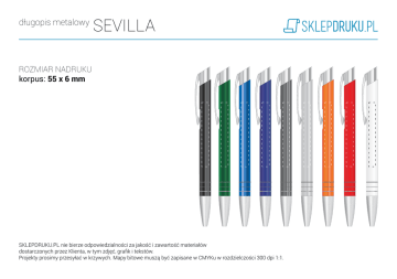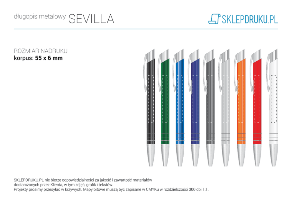 długopis metalowy SEVILLA rozmiar nadruku korpus: 55 x 6 mm SKLEPDRUKU.PL nie bierze odpowiedzialności za jakość i zawartość materiałów dostarczonych przez Klienta, w tym zdjęć, grafik i tekstów. Projekty prosimy przesyłać w krzywych. Mapy bitowe muszą być zapisane w CMYKu w rozdzielczości 300 dpi 1:1.