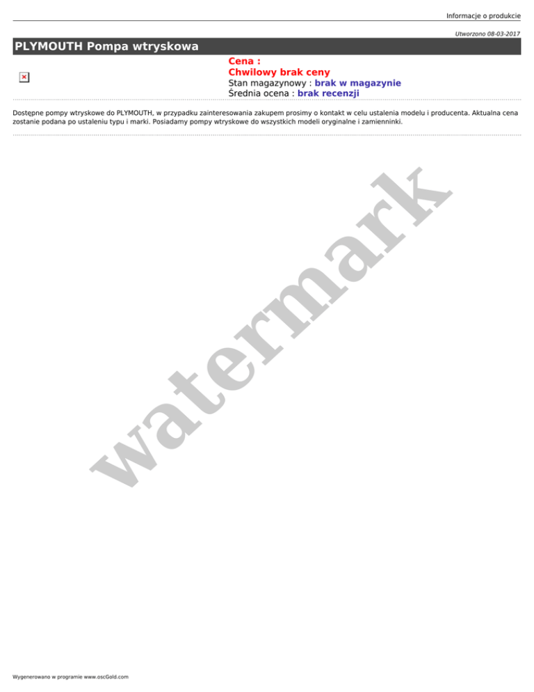 Informacje o produkcie Utworzono 08-03-2017 PLYMOUTH Pompa wtryskowa Cena : Chwilowy brak ceny Stan magazynowy : brak w magazynie Średnia ocena : brak recenzji w at er m ar k Dostępne pompy wtryskowe do PLYMOUTH, w przypadku zainteresowania zakupem prosimy o kontakt w celu ustalenia modelu i producenta. Aktualna cena zostanie podana po ustaleniu typu i marki. Posiadamy pompy wtryskowe do wszystkich modeli oryginalne i zamienninki. Wygenerowano w programie www.oscGold.com