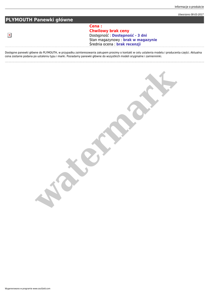 Informacje o produkcie Utworzono 08-03-2017 PLYMOUTH Panewki główne Cena : Chwilowy brak ceny Dostępność : Dostępność - 3 dni Stan magazynowy : brak w magazynie Średnia ocena : brak recenzji w at er m ar k Dostępne panewki główne do PLYMOUTH, w przypadku zainteresowania zakupem prosimy o kontakt w celu ustalenia modelu i producenta części. Aktualna cena zostanie podana po ustaleniu typu i marki. Posiadamy panewki główne do wszystkich modeli oryginalne i zamienninki. Wygenerowano w programie www.oscGold.com