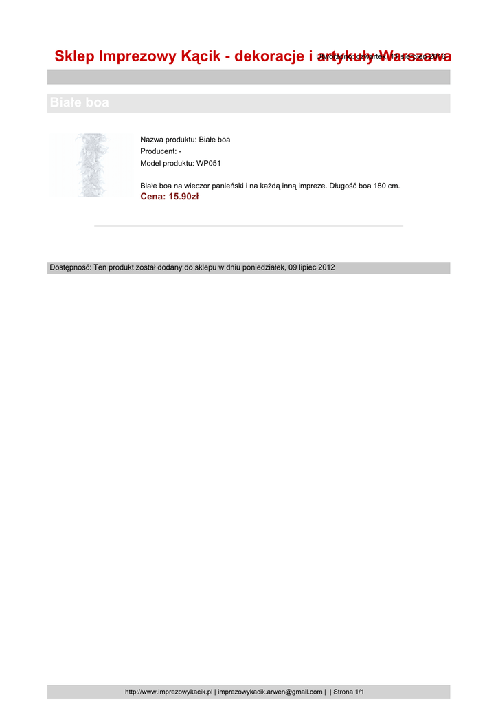 czwartek, 11 sierpień 2016 Sklep Imprezowy Kącik - dekoracje i Utworzono: artykuły Warszawa Białe boa Nazwa produktu: Białe boa Producent: Model produktu: WP051 Białe boa na wieczor panieński i na każdą inną impreze. Długość boa 180 cm. Cena: 15.90zł Dostępność: Ten produkt został dodany do sklepu w dniu poniedziałek, 09 lipiec 2012 http://www.imprezowykacik.pl | [email protected] | | Strona 1/1