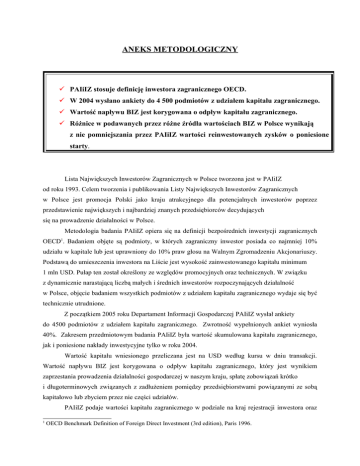 ANEKS METODOLOGICZNY PAIiIZ stosuje definicję inwestora zagranicznego OECD. W 2004 wysłano ankiety do 4 500 podmiotów z udziałem kapitału zagranicznego. Wartość napływu BIZ jest korygowana o odpływ kapitału zagranicznego. Różnice w podawanych przez różne źródła wartościach BIZ w Polsce wynikają z nie pomniejszania przez PAIiIZ wartości reinwestowanych zysków o poniesione starty. Lista Największych Inwestorów Zagranicznych w Polsce tworzona jest w PAIiIZ od roku 1993. Celem tworzenia i publikowania Listy Największych Inwestorów Zagranicznych w Polsce jest promocja Polski jako kraju atrakcyjnego dla potencjalnych inwestorów poprzez przedstawienie największych i najbardziej znanych przedsiębiorców decydujących się na prowadzenie działalności w Polsce. Metodologia badania PAIiIZ opiera się na definicji bezpośrednich inwestycji zagranicznych 1 OECD . Badaniem objęte są podmioty, w których zagraniczny inwestor posiada co najmniej 10% udziału w kapitale lub jest uprawniony do 10% praw głosu na Walnym Zgromadzeniu Akcjonariuszy. Podstawą do umieszczenia inwestora na Liście jest wysokość zainwestowanego kapitału minimum 1 mln USD. Pułap ten został określony ze względów promocyjnych oraz technicznych. W związku z dynamicznie narastającą liczbą małych i średnich inwestorów rozpoczynających działalność w Polsce, objęcie badaniem wszystkich podmiotów z udziałem kapitału zagranicznego wydaje się być technicznie utrudnione. Z początkiem 2005 roku Departament Informacji Gospodarczej PAIiIZ wysłał ankiety do 4500 podmiotów z udziałem kapitału zagranicznego. Zwrotność wypełnionych ankiet wyniosła 40%. Zakresem przedmiotowym badania PAIiIZ była wartość skumulowana kapitału zagranicznego, jak i poniesione nakłady inwestycyjne tylko w roku 2004. Wartość kapitału wniesionego przeliczana jest na USD według kursu w dniu transakcji. Wartość napływu BIZ jest korygowana o odpływ kapitału zagranicznego, który jest wynikiem zaprzestania prowadzenia działalności gospodarczej w naszym kraju, spłatę zobowiązań krótko i długoterminowych związanych z zadłużeniem pomiędzy przedsiębiorstwami powiązanymi ze sobą kapitałowo lub zbyciem przez nie części udziałów. PAIiIZ podaje wartości kapitału zagranicznego w podziale na kraj rejestracji inwestora oraz 1 OECD Benchmark Definition of Foreign Direct Investment (3rd edition), Paris 1996. branże. Zainwestowany kapitał w Polsce w podziale na sektory przeliczany jest wg Polskiej Klasyfikacji Działalności, która skorelowana jest z europejską NACE. Analizy struktury geograficznej BIZ prowadzone są wg kraju rejestracji inwestora. Postępujący proces globalizacji oraz swoboda przepływu kapitału doprowadziły do sytuacji, w której określenie pochodzenia kapitału stało się utrudnione. W celach informacyjnych PAIiIZ w swoich publikacjach podaje przy każdym inwestorze jego kraj rejestracji oraz pochodzenia, aczkolwiek obliczenia kwotowe odbywają się według kraju rejestracji. Inwestycje poniżej 1 miliona USD są przez Agencję szacowane. PAIiIZ nie koryguje danych wstecz. W Polsce, oprócz danych PAIiIZ, źródłem informacji o BIZ są statystyki Głównego Urzędu Statystycznego oraz Narodowego Banku Polskiego. W celu uzyskania dodatkowych informacji prosimy o kontakt: Aleksandra Prachowska E-mail: [email protected] Tel.: (+48 22) 334 98 40