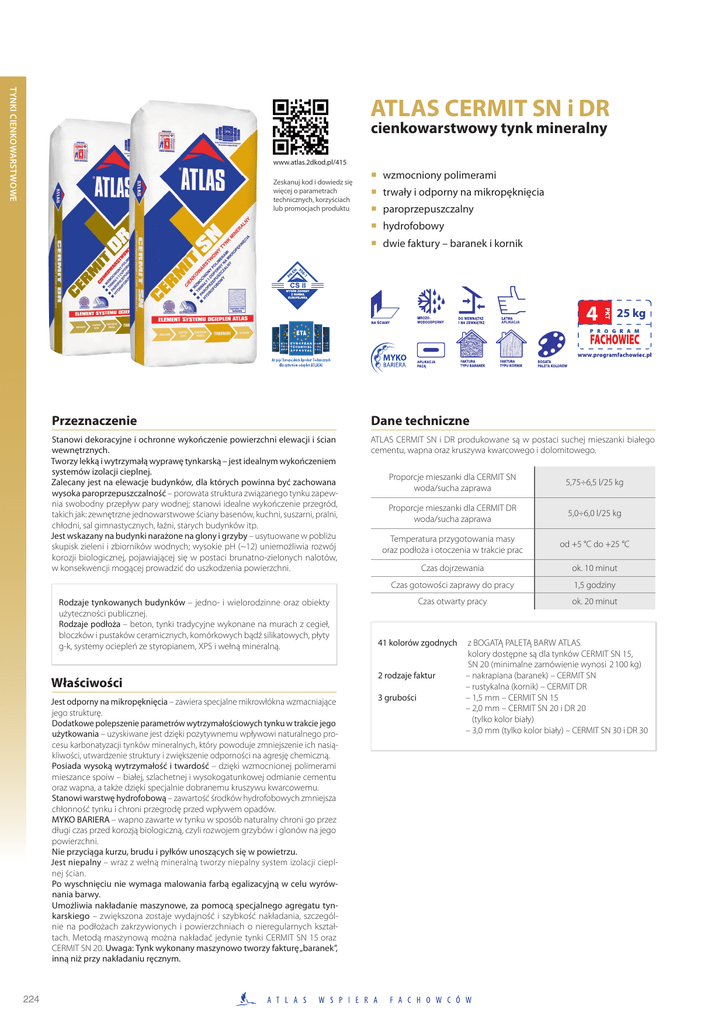 TyNki cieNkowarsTwowe ATLAS CERMIT SN i DR cienkowarstwowy tynk mineralny www.atlas.2dkod.pl/415 Zeskanuj kod i dowiedz się więcej o parametrach technicznych, korzyściach lub promocjach produktu wzmocniony polimerami trwały i odporny na mikropęknięcia paroprzepuszczalny hydrofobowy dwie faktury – baranek i kornik APLIKACJA 25 kg Przeznaczenie Dane techniczne Stanowi dekoracyjne i ochronne wykończenie powierzchni elewacji i ścian wewnętrznych. Tworzy lekką i wytrzymałą wyprawę tynkarską – jest idealnym wykończeniem systemów izolacji cieplnej. Zalecany jest na elewacje budynków, dla których powinna być zachowana wysoka paroprzepuszczalność – porowata struktura związanego tynku zapewnia swobodny przepływ pary wodnej; stanowi idealne wykończenie przegród, takich jak: zewnętrzne jednowarstwowe ściany basenów, kuchni, suszarni, pralni, chłodni, sal gimnastycznych, łaźni, starych budynków itp. Jest wskazany na budynki narażone na glony i grzyby – usytuowane w pobliżu skupisk zieleni i zbiorników wodnych; wysokie pH (~12) uniemożliwia rozwój korozji biologicznej, pojawiającej się w postaci brunatno-zielonych nalotów, w konsekwencji mogącej prowadzić do uszkodzenia powierzchni. ATLAS CERMIT SN i DR produkowane są w postaci suchej mieszanki białego cementu, wapna oraz kruszywa kwarcowego i dolomitowego. Rodzaje tynkowanych budynków – jedno- i wielorodzinne oraz obiekty użyteczności publicznej. Rodzaje podłoża – beton, tynki tradycyjne wykonane na murach z cegieł, bloczków i pustaków ceramicznych, komórkowych bądź silikatowych, płyty g-k, systemy ociepleń ze styropianem, XPS i wełną mineralną. 224 4 Proporcje mieszanki dla CERMIT SN woda/sucha zaprawa 5,75÷6,5 l/25 kg Proporcje mieszanki dla CERMIT DR woda/sucha zaprawa 5,0÷6,0 l/25 kg Temperatura przygotowania masy oraz podłoża i otoczenia w trakcie prac od +5 °C do +25 °C Czas dojrzewania ok. 10 minut Czas gotowości zaprawy do pracy 1,5 godziny Czas otwarty pracy ok. 20 minut 41 kolorów zgodnych Właściwości 2 rodzaje faktur Jest odporny na mikropęknięcia – zawiera specjalne mikrowłókna wzmacniające jego strukturę. Dodatkowe polepszenie parametrów wytrzymałościowych tynku w trakcie jego użytkowania – uzyskiwane jest dzięki pozytywnemu wpływowi naturalnego procesu karbonatyzacji tynków mineralnych, który powoduje zmniejszenie ich nasiąkliwości, utwardzenie struktury i zwiększenie odporności na agresję chemiczną. Posiada wysoką wytrzymałość i twardość – dzięki wzmocnionej polimerami mieszance spoiw – białej, szlachetnej i wysokogatunkowej odmianie cementu oraz wapna, a także dzięki specjalnie dobranemu kruszywu kwarcowemu. Stanowi warstwę hydrofobową – zawartość środków hydrofobowych zmniejsza chłonność tynku i chroni przegrodę przed wpływem opadów. MYKO BARIERA – wapno zawarte w tynku w sposób naturalny chroni go przez długi czas przed korozją biologiczną, czyli rozwojem grzybów i glonów na jego powierzchni. Nie przyciąga kurzu, brudu i pyłków unoszących się w powietrzu. Jest niepalny – wraz z wełną mineralną tworzy niepalny system izolacji cieplnej ścian. Po wyschnięciu nie wymaga malowania farbą egalizacyjną w celu wyrównania barwy. Umożliwia nakładanie maszynowe, za pomocą specjalnego agregatu tynkarskiego – zwiększona zostaje wydajność i szybkość nakładania, szczególnie na podłożach zakrzywionych i powierzchniach o nieregularnych kształtach. Metodą maszynową można nakładać jedynie tynki CERMIT SN 15 oraz CERMIT SN 20. Uwaga: Tynk wykonany maszynowo tworzy fakturę „baranek”, inną niż przy nakładaniu ręcznym. 3 grubości z BOGATĄ PALETĄ BARW ATLAS kolory dostępne są dla tynków CERMIT SN 15, SN 20 (minimalne zamówienie wynosi 2100 kg) – nakrapiana (baranek) – CERMIT SN – rustykalna (kornik) – CERMIT DR – 1,5 mm – CERMIT SN 15 – 2,0 mm – CERMIT SN 20 i DR 20 (tylko kolor biały) – 3,0 mm (tylko kolor biały) – CERMIT SN 30 i DR 30 Tynki spełniają wymagania PN-EN 998-1. Deklaracje właściwości użytkowych nr 013/CPR (tynk SN) i nr 014/CPR (tynk DR). PN-EN 998-1:2012 (EN 998-1:2010) 0767 Wytwarzana w zakładzie, zaprawa tynkarska jednowarstwowa (OC) do stosowania na zewnątrz, na ściany murowane, stropy, słupy i ściany działowe Klasa reakcji ogień A2 s1 d0 Absorpcja wody W1 Przyczepność po wymaganych cyklach sezonowania ≥ 0,3 N/mm² - FP:B Współczynnik przepuszczalności pary wodnej μ 15/35 (EN 1745:2002, tablica A.12) Współczynnik przewodzenia ciepła (średnia wartość tabelaryczna P=50%) 0,83 W/mK (λ10, dry) (EN 1745:2002, tablica A.12) Gęstość brutto w stanie suchym ≤1800 kg/m³ Przepuszczalność wody badana po wymaganych cyklach sezonowania ≤1ml/cm2 po 48 h Trwałość. Przyczepność po wymaganych cyklach sezonowania ≥0,3 N/mm² - FP:B Trwałość. Przepuszczalność wody badana po wymaganych cyklach sezonowania ≤1ml/cm2 po 48 h Uwalnianie/zawartość substancji niebezpiecznych patrz Karta Charakterystyki Nakładanie masy Masę można nakładać na podłoże ręcznie lub maszynowo. Wykonanie ręczne polega na naniesieniu tynku w postaci warstwy o grubości kruszywa za pomocą gładkiej pacy ze stali nierdzewnej. Nadmiar materiału należy ściągnąć z powrotem do wiadra i przemieszać. Nakładanie maszynowe prowadzić należy za pomocą specjalnych agregatów tynkarskich. Fakturowanie Świeżo naniesioną masą należy zafakturować przy użyciu pacy z tworzywa sztucznego. Efekt baranka (tynk SN) uzyskuje się zacierając masę ruchami okrężnymi, natomiast efekt rustykalny (tynk DR) – ruchami okrężnymi, poziomymi lub pionowymi (w zależności od oczekiwanego kierunku rys). Masy nałożonej maszynowo nie fakturuje się. Tworzy ona fakturę „baranek” – inną niż w przypadku nakładania ręcznego. Prace wykończeniowe Tynk można malować, stosując dowolne farby elewacyjne (np. ATLAS ARKOL S