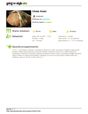 Chleb fiński smakujmy Polecane na: pieczywo Kuchnia (region): arabska Warto wiedzieć: Składniki: 90 min. jogurt natl. lub fefir - 1/2 litr drożdże - 5 dag sól - 1/2 łyżka łatwy 16 porcji miód płynny - 2 łyżka mąka żytnia - 2 i 1/2 szklanka mąka pszenna - 2 - 2 i 1/2 szklanka Sposób przygotowania: KROK 1: Letni jogurt rozetrzeć z drożdżami, dodać sól i miód, wymieszać. Wsypać mąkę żytnią, wyrobić. Dodać mąkę pszenną, ponownie wyrobić i odstawić na 20 min w ciepłe miejsce do wyrośnięcia. Wyłożyć na stolnicę, zagnieść, podzielić na dwie części, uformować okrągłe bochenki. Ułożyć chleby na natłuszczonej blasze, odstawić na 45 min do wyrośnięcia. Nakłuć kilka razy widelcem, piec ok. 30 min w temp. 200 st. C. strona 1 / 1 http://gotujwstylueko.pl/przepisy/chleb-finski Powered by TCPDF (www.tcpdf.org)