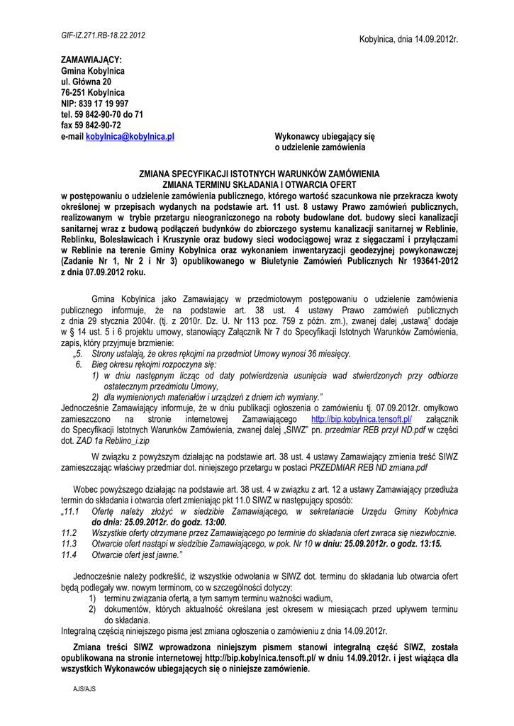 GIF-IZ.271.RB-18.22.2012 ZAMAWIAJĄCY: Gmina Kobylnica ul. Główna 20 76-251 Kobylnica NIP: 839 17 19 997 tel. 59 842-90-70 do 71 fax 59 842-90-72 e-mail [email protected] Kobylnica, dnia 14.09.2012r. Wykonawcy ubiegający się o udzielenie zamówienia ZMIANA SPECYFIKACJI ISTOTNYCH WARUNKÓW ZAMÓWIENIA ZMIANA TERMINU SKŁADANIA I OTWARCIA OFERT w postępowaniu o udzielenie zamówienia publicznego, którego wartość szacunkowa nie przekracza kwoty określonej w przepisach wydanych na podstawie art. 11 ust. 8 ustawy Prawo zamówień publicznych, realizowanym w trybie przetargu nieograniczonego na roboty budowlane dot. budowy sieci kanalizacji sanitarnej wraz z budową podłączeń budynków do zbiorczego systemu kanalizacji sanitarnej w Reblinie, Reblinku, Bolesławicach i Kruszynie oraz budowy sieci wodociągowej wraz z sięgaczami i przyłączami w Reblinie na terenie Gminy Kobylnica oraz wykonaniem inwentaryzacji geodezyjnej powykonawczej (Zadanie Nr 1, Nr 2 i Nr 3) opublikowanego w Biuletynie Zamówień Publicznych Nr 193641-2012 z dnia 07.09.2012 roku. Gmina Kobylnica jako Zamawiający w przedmiotowym postępowaniu o udzielenie zamówienia publicznego informuje, że na podstawie art. 38 ust. 4 ustawy Prawo zamówień publicznych z dnia 29 stycznia 2004r. (tj. z 2010r. Dz. U. Nr 113 poz. 759 z późn. zm.), zwanej dalej „ustawą” dodaje w § 14 ust. 5 i 6 projektu umowy, stanowiący Załącznik Nr 7 do Specyfikacji Istotnych Warunków Zamówienia, zapis, który przyjmuje brzmienie: „5. Strony ustalają, że okres rękojmi na przedmiot Umowy wynosi 36 miesięcy. 6. Bieg okresu rękojmi rozpoczyna się: 1) w dniu następnym licząc od daty potwierdzenia usunięcia wad stwierdzonych przy odbiorze ostatecznym przedmiotu Umowy, 2) dla wymienionych materiałów i urządzeń z dniem ich wymiany.” Jednocześnie Zamawiający informuje, że w dniu publikacji ogłoszenia o zamówieniu tj. 07.09.2012r. omyłkowo zamieszczono na stronie internetowej Zamawiającego http://bip.kobylnica.tensoft.pl/ załącznik do Specyfikacji Istotnych Warunków Zamówienia, zwanej dalej „SIWZ” pn. przedmiar REB przył ND.pdf w części dot. ZAD 1a Reblino_i.zip W związku z powyższym działając na podstawie art. 38 ust. 4 ustawy Zamawiający zmienia treść SIWZ zamieszczając właściwy przedmiar dot. niniejszego przetargu w postaci PRZEDMIAR REB ND zmiana.pdf Wobec powyższego działając na podstawie art. 38 ust. 4 w związku z art. 12 a ustawy Zamawiający przedłuża termin do składania i otwarcia ofert zmieniając pkt 11.0 SIWZ w następujący sposób: „11.1 Ofertę należy złożyć w siedzibie Zamawiającego, w sekretariacie Urzędu Gminy Kobylnica do dnia: 25.09.2012r. do godz. 13:00. 11.2 Wszystkie oferty otrzymane przez Zamawiającego po terminie do składania ofert zwraca się niezwłocznie. 11.3 Otwarcie ofert nastąpi w siedzibie Zamawiającego, w pok. Nr 10 w dniu: 25.09.2012r. o godz. 13:15. 11.4 Otwarcie ofert jest jawne.” Jednocześnie należy podkreślić, iż wszystkie odwołania w SIWZ dot. terminu do składania lub otwarcia ofert będą podlegały ww. nowym terminom, co w szczególności dotyczy: 1) terminu związania ofertą, a tym samym terminu ważności wadium, 2) dokumentów, których aktualność określana jest okresem w miesiącach przed upływem terminu do składania. Integralną częścią niniejszego pisma jest zmiana ogłoszenia o zamówieniu z dnia 14.09.2012r. Zmiana treści SIWZ wprowadzona niniejszym pismem stanowi integralną część SIWZ, została opublikowana na stronie internetowej http://bip.kobylnica.tensoft.pl/ w dniu 14.09.2012r. i jest wiążąca dla wszystkich Wykonawców ubiegających się o niniejsze zamówienie. AJS/AJS