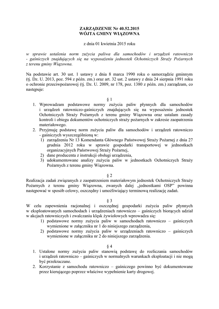 ZARZĄDZENIE Nr 40.52.2015 WÓJTA GMINY WIĄZOWNA z dnia 01 kwietnia 2015 roku w sprawie ustalenia norm zużycia paliwa dla samochodów i urządzeń ratowniczo - gaśniczych znajdujących się na wyposażeniu jednostek Ochotniczych Straży Pożarnych z terenu gminy Wiązowna. Na podstawie art. 30 ust. 1 ustawy z dnia 8 marca 1990 roku o samorządzie gminnym (tj. Dz. U. 2013, poz. 594 z późn. zm.) oraz art. 32 ust. 2 ustawy z dnia 24 sierpnia 1991 roku o ochronie przeciwpożarowej (tj. Dz. U. 2009, nr 178, poz. 1380 z późn. zm.) zarządzam, co następuje: §1 1. Wprowadzam podstawowe normy zużycia paliw płynnych dla samochodów i urządzeń ratowniczo-gaśniczych znajdujących się na wyposażeniu jednostek Ochotniczych Straży Pożarnych z terenu gminy Wiązowna oraz ustalam zasady kontroli i obiegu dokumentów ochotniczych straży pożarnych w zakresie zaopatrzenia materiałowego. 2. Przyjmuję podstawę norm zużycia paliw dla samochodów i urządzeń ratowniczo - gaśniczych wyszczególnioną w: 1) zarządzeniu Nr 13 Komendanta Głównego Państwowej Straży Pożarnej z dnia 27 grudnia 2012 roku w sprawie gospodarki transportowej w jednostkach organizacyjnych Państwowej Straży Pożarnej, 2) dane producenta z instrukcji obsługi urządzenia, 3) udokumentowane analizy zużycia paliw w jednostkach Ochotniczych Straży Pożarnych z terenu gminy Wiązowna. §2 Realizacja zadań związanych z zaopatrzeniem materiałowym jednostek Ochotniczych Straży Pożarnych z terenu gminy Wiązowna, zwanych dalej „jednostkami OSP” powinna następować w sposób celowy, oszczędny i umożliwiający terminową realizację zadań. §3 W celu zapewnienia racjonalnej i oszczędnej gospodarki zużycia paliw płynnych w eksploatowanych samochodach i urządzeniach ratowniczo – gaśniczych biorących udział w akcjach ratowniczych i zwalczaniu klęsk żywiołowych wprowadza się: 1) podstawowe normy zużycia paliw w samochodach ratowniczo – gaśniczych wymienione w załączniku nr 1 do niniejszego zarządzenia, 2) podstawowe normy zużycia paliw w urządzeniach ratowniczo – gaśniczych wymienione w załączniku nr 2 do niniejszego zarządzenia. §4 1. Ustalone normy zużycia paliw stanowią podstawę do rozliczania samochodów i urządzeń ratowniczo – gaśniczych w normalnych warunkach eksploatacji i nie mogą być przekraczane. 2. Korzystanie z samochodu ratowniczo – gaśniczego powinno być dokumentowane przez kierującego poprzez właściwe wypełnienie karty drogowej. 3. Dokumentacja powinna być prowadzona w sposób umożliwiający kontrolę celowości korzystania z samochodu ratowniczo – gaśniczego i określenie kosztów z tym związanych. 4. Korzystanie z urządzenia ratowniczo – gaśniczego powinno być dokumentowane przez kierującego poprzez właściwe wypełnienie karty pracy sprzętu silnikowego. 5. Dokumentacja powinna być prowadzona w sposób umożliwiający kontrolę celowości korzystania z urządzenia ratowniczo – gaśniczego i określenie kosztów z tym związanych. 6. Użytkownicy samochodu zobowiązani są prowadzić dokładną ewidencję zużycia paliw. 7. Każda ilość paliwa wydanego osobie uprawnionej i zakupionego na samochód musi być odnotowana w karcie drogowej wraz z aktualnym stanem licznika. §5 W przypadku niesprawności technicznej samochodu lub urządzenia ratowniczo – gaśniczego powodującej przepał, sprzęt należy wycofać z eksploatacji, naprawić, zapewniając zużycie paliwa w granicach ustalonej normy. §6 Podstawą do rozliczania zużycia paliw samochodów i urządzeń ratowniczo - gaśniczych używanych w jednostkach OSP są: 1) kwartalna karta drogowa pożarniczego pojazdu samochodowego, stanowiąca załącznik nr 3 do niniejszego zarządzenia, 2) kwartalna karta pracy sprzętu silnikowego, stanowiąca załącznik nr 4 do niniejszego zarządzenia §7 1. Rozliczanie zużycia paliw w jednostkach OSP przez samochody lub urządzenia ratowniczo – gaśnicze dokonywane jest raz na kwartał. 2. Dokumenty należy składać w Urzędzie Gminy najpóźniej do 7 dnia miesiąca następującego po upływie danego okresu rozliczeniowego. 3. Za prowadzenie obowiązującej dokumentacji, prawidłowe i terminowe rozliczanie zużycia paliw oraz prowadzenie kontroli stanu ilościowego paliw w jednostce OSP odpowiada osoba odpowiedzialna za konserwację sprzętu p. poż. w jednostce. §8 Wykonanie zarządzenia powierzam Sekretarzowi Gminy. §9 Zarządzenie wchodzi w życie z dniem podjęcia. Wójt Gminy Wiązowna Janusz Budny