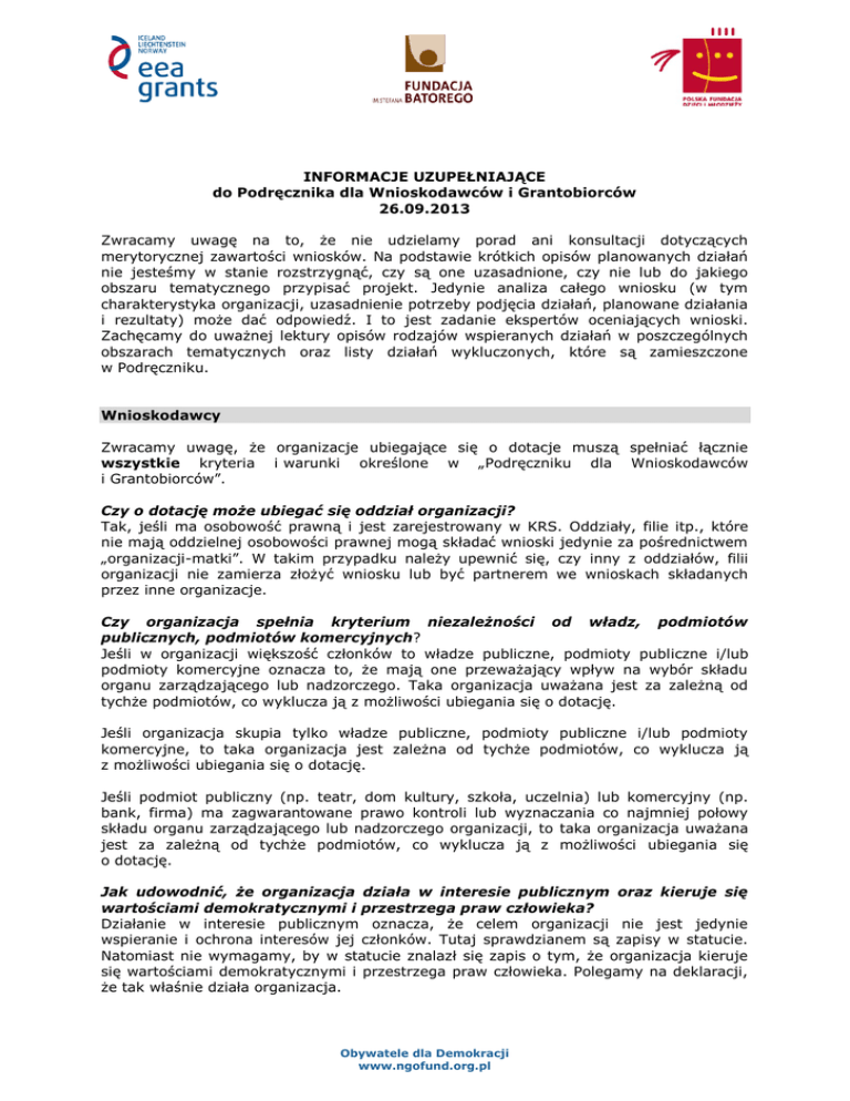 INFORMACJE UZUPEŁNIAJĄCE do Podręcznika dla Wnioskodawców i Grantobiorców 26.09.2013 Zwracamy uwagę na to, że nie udzielamy porad ani konsultacji dotyczących merytorycznej zawartości wniosków. Na podstawie krótkich opisów planowanych działań nie jesteśmy w stanie rozstrzygnąć, czy są one uzasadnione, czy nie lub do jakiego obszaru tematycznego przypisać projekt. Jedynie analiza całego wniosku (w tym charakterystyka organizacji, uzasadnienie potrzeby podjęcia działań, planowane działania i rezultaty) może dać odpowiedź. I to jest zadanie ekspertów oceniających wnioski. Zachęcamy do uważnej lektury opisów rodzajów wspieranych działań w poszczególnych obszarach tematycznych oraz listy działań wykluczonych, które są zamieszczone w Podręczniku. Wnioskodawcy Zwracamy uwagę, że organizacje ubiegające się o dotacje muszą spełniać łącznie wszystkie kryteria i warunki określone w „Podręczniku dla Wnioskodawców i Grantobiorców”. Czy o dotację może ubiegać się oddział organizacji? Tak, jeśli ma osobowość prawną i jest zarejestrowany w KRS. Oddziały, filie itp., które nie mają oddzielnej osobowości prawnej mogą składać wnioski jedynie za pośrednictwem „organizacji-matki”. W takim przypadku należy upewnić się, czy inny z oddziałów, filii organizacji nie zamierza złożyć wniosku lub być partnerem we wnioskach składanych przez inne organizacje. Czy organizacja spełnia kryterium niezależności od władz, podmiotów publicznych, podmiotów komercyjnych? Jeśli w organizacji większość członków to władze publiczne, podmioty publiczne i/lub podmioty komercyjne oznacza to, że mają one przeważający wpływ na wybór składu organu zarządzającego lub nadzorczego. Taka organizacja uważana jest za zależną od tychże podmiotów, co wyklucza ją z możliwości ubiegania się o dotację. Jeśli organizacja skupia tylko władze publiczne, podmioty publiczne i/lub podmioty komercyjne, to taka organizacja jest zależna od tychże podmiotów, co wyklucza ją z możliwości ubiegania się o dotację. Jeśli podmiot publiczny (np. teatr, dom kultury, szkoła, uczelnia) lub komercyjny (np. bank, firma) ma zagwarantowane prawo kontroli lub wyznaczania co najmniej połowy składu organu zarządzającego lub nadzorczego organizacji, to taka organizacja uważana jest za zależną od tychże podmiotów, co wyklucza ją z możliwości ubiegania się o dotację. Jak udowodnić, że organizacja działa w interesie publicznym oraz kieruje się wartościami demokratycznymi i przestrzega praw człowieka? Działanie w interesie publicznym oznacza, że celem organizacji nie jest jedynie wspieranie i ochrona interesów jej członków. Tutaj sprawdzianem są zapisy w statucie. Natomiast nie wymagamy, by w statucie znalazł się zapis o tym, że organizacja kieruje się wartościami demokratycznymi i przestrzega praw człowieka. Polegamy na deklaracji, że tak właśnie działa organizacja. Obywatele dla Demokracji www.ngofund.org.pl Czy możemy złożyć wniosek, jeśli w organizacji zmienił się skład Zarządu, ale zmiana ta nie jest jeszcze uwidoczniona w Krajowym Rejestrze Sądowym? Na etapie ubiegania się o dotację wymóg aktualnych danych o organizacji w Krajowym Rejestrze Sądowym uznajemy za spełniony także w sytuacji, gdy do KRS został złożony wniosek o zmianę danych. Jeśli dotacja zostanie przyznana, to wpis aktualnych danych będzie wymagany przed podpisaniem umowy o dotację. Składanie wniosków na projekty tematyczne i systemowe Czy można złożyć wniosek o dotację na projekt tematyczny i systemowy? Można złożyć wniosek w pierwszej edycji konkursu na projekty tematyczne i w konkursie na projekty systemowe. Jeśli oba wnioski zostaną przyjęte, to organizacja będzie musiała wybrać, który projekt – tematyczny czy systemowy – chce realizować. W przypadku wyboru projektu systemowego, organizacja nie będzie mogła ubiegać się o dotację w kolejnych edycjach konkursu na projekty tematyczne, zgodnie z zapisaną w Podręczniku zasadą, że "Organizacje, którym zostanie przekazana dotacja na realizację projektu systemowego, nie będą mogły otrzymać dotacji na projekt tematyczny." Adresaci / uczestnicy działań Jak w programie definiowana jest młodzież? Dzieci i młodzież to osoby do 25 roku życia. Czy projekty dotyczące zwalczania dyskryminacji lub przeciwdziałania wykluczeniu mogą być adresowane tylko do grup wymienionych w opisach rodzajów wspieranych działań? W opisach wymienione zostały tylko przykładowe grupy. Projekty mogą dotyczyć również innych grup narażonych na dyskryminację lub wykluczenie. Czy beneficjentami działań mogą być społeczności zagraniczne (np. Polonia, aktywiści praw człowieka na Białorusi)? Nie, celem programu Obywatele dla Demokracji jest poprawa sytuacji w Polsce. W związku z tym projekty muszą dotyczyć Polski. Partnerzy Jeśli organizacja we wniosku wstępnym zadeklaruje realizację projektu z Partnerem z Państw-Darczyńców, ale ten Partner się wycofa, to co dalej? W ocenie wniosków wstępnych premiowana jest realizacja projektu we współpracy z Partnerem z Państw-Darczyńców. Na liście organizacji zaproszonych do złożenia wniosku pełnego będą zaznaczone organizacje, które zostały zakwalifikowane do składania wniosków pełnych ze względu na dodatkowe punkty uzyskane dzięki deklaracji realizacji projektu w partnerstwie z podmiotem z Państw-Darczyńców. Jeśli taka organizacja nie będzie miała Partnera z Państw-Darczyńców, to jej wniosek pełny nie będzie rozpatrywany. Obywatele dla Demokracji www.ngofund.org.pl Jeśli organizacja we wniosku wstępnym zadeklaruje realizację projektu z Partnerem (z Polski lub z innych państw, ale nie z Państw-Darczyńców), ale ten Partner się wycofa, to co dalej? W ocenie wniosków wstępnych nie jest premiowane partnerstwo z podmiotami z Polski i z innych krajów (poza podmio