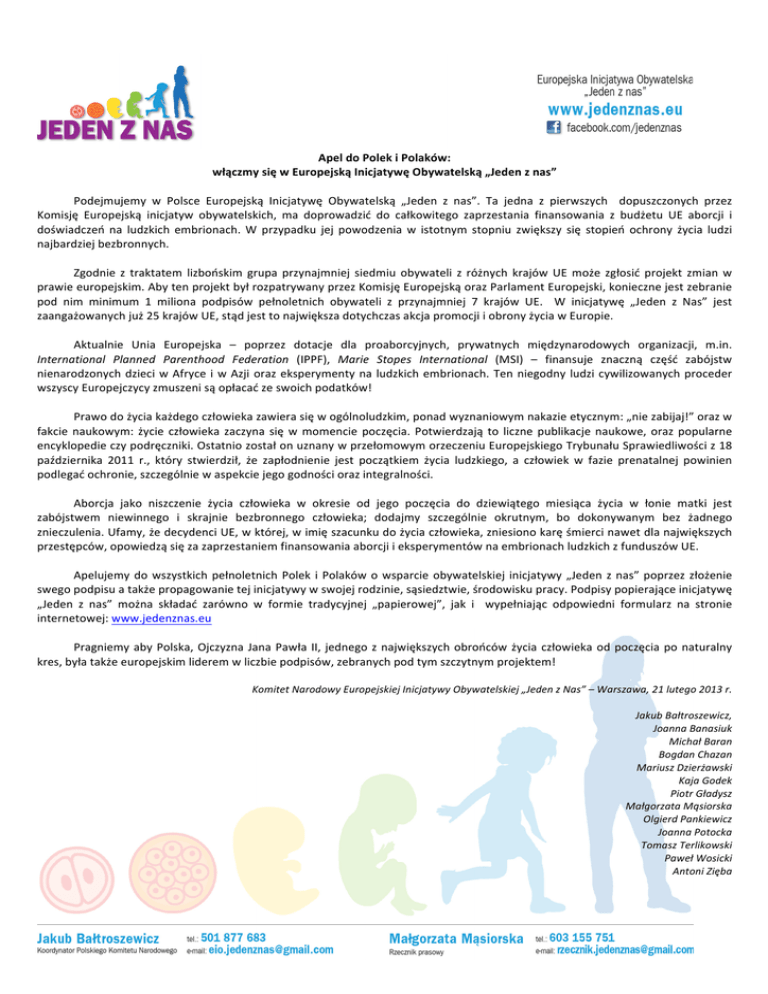 Apel do Polek i Polaków: włączmy się w Europejską Inicjatywę Obywatelską „Jeden z nas” Podejmujemy w Polsce Europejską Inicjatywę Obywatelską „Jeden z nas”. Ta jedna z pierwszych dopuszczonych przez Komisję Europejską inicjatyw obywatelskich, ma doprowadzić do całkowitego zaprzestania finansowania z budżetu UE aborcji i doświadczeń na ludzkich embrionach. W przypadku jej powodzenia w istotnym stopniu zwiększy się stopień ochrony życia ludzi najbardziej bezbronnych. Zgodnie z traktatem lizbońskim grupa przynajmniej siedmiu obywateli z różnych krajów UE może zgłosić projekt zmian w prawie europejskim. Aby ten projekt był rozpatrywany przez Komisję Europejską oraz Parlament Europejski, konieczne jest zebranie pod nim minimum 1 miliona podpisów pełnoletnich obywateli z przynajmniej 7 krajów UE. W inicjatywę „Jeden z Nas” jest zaangażowanych już 25 krajów UE, stąd jest to największa dotychczas akcja promocji i obrony życia w Europie. Aktualnie Unia Europejska – poprzez dotacje dla proaborcyjnych, prywatnych międzynarodowych organizacji, m.in. International Planned Parenthood Federation (IPPF), Marie Stopes International (MSI) – finansuje znaczną część zabójstw nienarodzonych dzieci w Afryce i w Azji oraz eksperymenty na ludzkich embrionach. Ten niegodny ludzi cywilizowanych proceder wszyscy Europejczycy zmuszeni są opłacać ze swoich podatków! Prawo do życia każdego człowieka zawiera się w ogólnoludzkim, ponad wyznaniowym nakazie etycznym: „nie zabijaj!” oraz w fakcie naukowym: życie człowieka zaczyna się w momencie poczęcia. Potwierdzają to liczne publikacje naukowe, oraz popularne encyklopedie czy podręczniki. Ostatnio został on uznany w przełomowym orzeczeniu Europejskiego Trybunału Sprawiedliwości z 18 października 2011 r., który stwierdził, że zapłodnienie jest początkiem życia ludzkiego, a człowiek w fazie prenatalnej powinien podlegać ochronie, szczególnie w aspekcie jego godności oraz integralności. Aborcja jako niszczenie życia człowieka w okresie od jego poczęcia do dziewiątego miesiąca życia w łonie matki jest zabójstwem niewinnego i skrajnie bezbronnego człowieka; dodajmy szczególnie okrutnym, bo dokonywanym bez żadnego znieczulenia. Ufamy, że decydenci UE, w której, w imię szacunku do życia człowieka, zniesiono karę śmierci nawet dla największych przestępców, opowiedzą się za zaprzestaniem finansowania aborcji i eksperymentów na embrionach ludzkich z funduszów UE. Apelujemy do wszystkich pełnoletnich Polek i Polaków o wsparcie obywatelskiej inicjatywy „Jeden z nas” poprzez złożenie swego podpisu a także propagowanie tej inicjatywy w swojej rodzinie, sąsiedztwie, środowisku pracy. Podpisy popierające inicjatywę „Jeden z nas” można składać zarówno w formie tradycyjnej „papierowej”, jak i wypełniając odpowiedni formularz na stronie internetowej: www.jedenznas.eu Pragniemy aby Polska, Ojczyzna Jana Pawła II, jednego z największych obrońców życia człowieka od poczęcia po naturalny kres, była także europejskim liderem w liczbie podpisów, zebranych pod tym szczytnym projektem! Komitet Narodowy Europejskiej Inicjatywy Obywatelskiej „Jeden z Nas” – Warszawa, 21 lutego 2013 r. Jakub Bałtroszewicz, Joanna Banasiuk Michał Baran Bogdan Chazan Mariusz Dzierżawski Kaja Godek Piotr Gładysz Małgorzata Mąsiorska Olgierd Pankiewicz Joanna Potocka Tomasz Terlikowski Paweł Wosicki Antoni Zięba