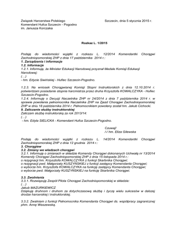 Związek Harcerstwa Polskiego Komendant Hufca Szczecin - Pogodno im. Janusza Korczaka Szczecin, dnia 5 stycznia 2015 r. Rozkaz L. 1/2015 Podaję do wiadomości wyjątki z rozkazu L. 12/2014 Komendantki Chorągwi Zachodniopomorskiej ZHP z dnia 17 października 2014 r.: 1. Zarządzenia i informacje 1.2. Informacje 1.2.1. Informuję, że Minister Edukacji Narodowej przyznał Medale Komisji Edukacji Narodowej: (…) hm. Edycie Siwińskiej Hufiec SzczecinPogodno. 1.2.3. Na wniosek Chorągwianej Komisji Stopni Instruktorskich z dnia 12.10.2014 r. potwierdzam posiadanie stopnia harcmistrza przez druha Krzysztofa KOWALCZYKA Hufiec SzczecinPogodno. 1.2.4. Informuję o Decyzji Naczelnika ZHP nr 24/2014 z dnia 7 października 2014 r. w sprawie powołania pełnomocnika Naczelnika ZHP na Zjazd Chorągwi Zachodniopomorskiej ZHP w dniu 18 października 2014 r. Pełnomocnikiem powołany został hm. Jakub Cichocki. 9. Zaliczanie służby instruktorskiej Zaliczam służbę instruktorską za rok 2013/14: (…) hm. Edyta SIELICKA Komendant Hufca SzczecinPogodno. Czuwaj! // hm. Eliza Gilewska Podaję do wiadomości wyjątki z rozkazu L. 14/2014 Komendantki Chorągwi Zachodniopomorskiej ZHP z dnia 12 grudnia 2014 r.: 3. Chorągiew 3.2. Zmiany we władzach chorągwi 3.2.1. Informuję o zmianach w składzie Komendy Chorągwi dokonanych Uchwałą nr 13/2014 Komendy Chorągwi Zachodniopomorskiej ZHP z dnia 15 listopada 2014 r.: o rezygnacji hm. Krzysztofa KOWALCZYKA z funkcji Skarbnika Chorągwi; o rezygnacji pwd. Małgorzaty KUSZYŃSKIEJ z funkcji zastępcy Komendanta Chorągwi; o wyborze hm. Krzysztofa KOWALCZYKA na funkcję zastępcy Komendanta Chorągwi; o wyborze pwd. Małgorzaty KUSZYŃSKIEJ na funkcję Skarbnika Chorągwi. 3.3. Zwolnienia 3.3.1. Rozwiązuję Zespół Pilota Chorągwi Zachodniopomorskiej w składzie: (…) Jakub MAZURKIEWICZ Dziękuję druhnom i druhom za dotychczasową służbę i życzę wielu sukcesów w dalszej drodze harcerskiej i instruktorskiej. 3.3.2. Zwalniam z funkcji Pełnomocnika Komendanta Chorągwi ds. współpracy zagranicznej phm. Annę Waszewską. Gratuluję druhnie budowy Zespołu Zagranicznego i życzę wielu sukcesów na dalszej drodze instruktorskiej. 3.4. Mianowania na funkcje 3.4.2. Powołuję Zespół Zagraniczny w składzie: - phm. Anna WASZEWSKA szef zespołu Hufiec Szczecin-Pogodno - pwd. Tomasz KRUGOWIEC członek zespołu Hufiec Szczecin-Pogodno - Jan Bober członek zespołu Hufiec Szczecin-Pogodno 4. Rozwiązania i powołania sztabów, komisji, komend kursów 4.3. Rozwiązywanie i powoływanie komend kursów 4.3.2. Powołuję Kolegium Honorowe przyznające tytuł Seniora Roku im. hm. Wojciecha Czyżowskiego w składzie: (…) hm. Bożena KUSZTELSKA 13. Odznaczenia, pochwały, wyróżnienia 13.1. Udzielam pochwały druhnie Dominice PAŁUCKIEJ której praca przyczyniła się dosprawnego zorganizowania i przeprowadzenia XIX Zjazdu Chorągwi Zachodniopomorskiej ZHP. 16. Sprostowania 16.2. Podaję do wiadomości, że w rozkazie L13/2014 w punkcie 13.1 nie podano stopnia instruktorskiego. Było: “Patrycja KMIECIK”. Powinno być: “pwd. Patrycja KMIECIK”. Czuwaj! /-/hm. Eliza Gilewska 1. Zarządzenia i informacje 1.2. Informacje 1.2.1. Przypominam drużynowym oraz instruktorom Hufca Szczecin-Pogodno o obowiązku opłacania składek członkowskich. 1.2.2. Na wniosek Komisji Stopni Instruktorskich z dnia 25.11.2014 r. potwierdzam posiadanie stopnia przewodnika przez druha Piotra Czajkowskiego. 3. Drużyny 3.1. Zmiany organizacyjne. 3.1.1. Na wniosek drużynowego rozwiązuję 82 Drużynę Wędrowniczą „Harmattan”. 3.2. Zwolnienia i mianowanie drużynowych 3.2.1. Zwalniam z funkcji drużynowego 82 Drużyny Wędrowniczej „Harmattan” dh. Jana Bobera. Za dotychczas pełnioną funkcję serdecznie Druhowi dziękuję i życzę sukcesów na dalszej drodze rozwoju. 7. Mianowania instruktorów 7.1 Zamknięcia próby na stopień przewodniczki/przewodnika 7.1.1. Na wniosek Komisji Stopni Instruktorskich z dn. 25.11.2014 r. zamykam z wynikiem pozytywnym próbę na stopień przewodniczki dh. Neli Mikoszy. Opiekun próby hm. Edyta Sielicka. 7.2 Otwarcia próby na stopień przewodniczki/przewodnika 7.2.1. Na wniosek Komisji Stopni Instruktorskich z dn. 25.11.2014 r. otwieram próbę na stopień przewodniczki dh. Karolinie Strojnej. Opiekun próby hm. Maciej Grabowski. 7.2.2. Na wniosek Komisji Stopni Instruktorskich z dn. 25.11.2014 r. otwieram próbę na stopień przewodnika dh. Arkadiuszowi Barć. Opiekun próby hm. Edyta Sielicka. 7.2.3. Na wniosek Komisji Stopni Instruktorskich z dn. 09.12.2014 r. otwieram próbę na stopień przewodnika dh. Jakubowi Chmielowi. Opiekun próby hm. Edyta Sielicka. 8. Zaliczenie służby Instruktorskiej. 8.1. Zaliczam służbę instruktorską za rok 2013/2014 następującym druhnom i druhom: hm. Katarzynie Grabowskiej, hm. Józefowi Raniowskiemu, phm. Ewie Dombrowskiej, pwd. Julii Siemińskiej. 9. Przydział służbowy 9.1.Uzyskanie przydziału służbowego przez członka zwyczajnego ZHP 9.1.1. Informuję o uzyskaniu dodatkowego przydziału służbowego do Hufca SzczecinPogodno przez pwd. Marka Izraelskiego – Hufiec ZHP Koszalin. 9.1.2. Na podstawie pkt. 3 uchwały nr 78/XXXVI Rady Naczelnej ZHP z dnia 3 marca 2013 r. w sprawie zasad ponownego ubiegania się o członkostwo ZHP, na wniosek zainteresowanego, przywracam członkostwo w ZHP druhowi Leszkowi Kaczanowskiemu. 12. Pochwały, wyróżnienia, nagrody. 12.1 Udzielam pochwały za przygotowanie i zorganizowanie Rajdu Złotego Liścia pwd. Klaudii Borkowskiej, dh. Mikołajowi Marczakowi, dh. Szymonowi Wojciechowskiemu. 12.2 Składam podziękowania za przygotowanie i zorganizowanie Hufcowej Ślizgawki pwd. Pawłowi Wnukowi. 14. Sprostowania. 14.1. Informuję, iż w rozkazie L6/2014 z dnia 16.10.2014 r. w punkcie 1.2.3. błędnie podano termin spotkania Komisji Stopni Instruktorskich. Było: 20.01.2014 r., powinno być: 20.01.2015 r. 14.2. Informuję, iż w rozkazie L7/2014 z dnia 30.10