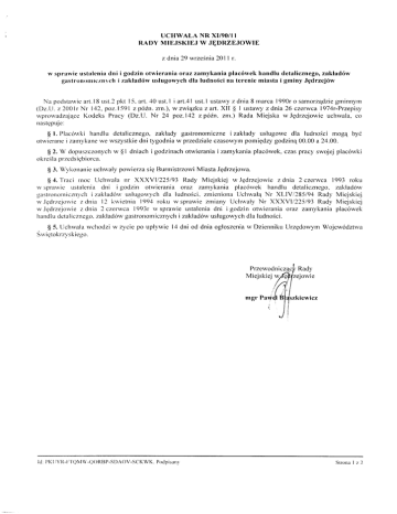 UCHWAT,A NR XI/90/I I RADY MIEJSKIEJ W JEDRZEJOWIE z dnia 2gwrzesnia20 I r r. w sprawie ustalenia dni i godzin otwierania orazzamykania plac6wek handlu detalicznego,zaklad6w g a s t r o n o r n r c z n l c hi z a k l a d 6 w u s l u g o w y c hd l a l u d n o S c in a t e r e n i e m i a s t a i g m i n y J p d r z e j 6 w N a p o c l s t a w i e a rl tS. u s t . 2 p k t l 5 , a r t . 4 0 u s t .I i a r t . 4I u s t .I u s t a w y z d n i a8 n t a r c a l 9 9 0 r o s a m o r z q d z i e g n r i n n y r l ( D z . U . z 2 0 0 l r N r 1 4 2 ,p o z . l 5 9 l z p o L n . z m . ) , w z w i q z k u z a r t . X l l Q l u s t a w y z d n i a 2 6 c z e r w c a 1 9 7 4 r - P r z e p i s y wprowadzajqceKodeks Pracy (Dz.U. Nr 24 poz.l42 zp6in. znr.) Rada Miejska wJgdrzejowie uchwala, co nastppuje: Q l. Placorvki handlu detalicznego, zaklady gastronomiczne izaklady uslugowe dla ludnoSci mog4 by6 otwieranei zarnykanewe wszystkie dni tygodniaw przedzialeczasowynrpomigdzy godzin4 00.00 a 24.00. $ 2. W dopuszczonychw $ I dniach i godzinachotwieraniai zamykaniaplac6wek, czas pracy swojej plac6wki przedsigbiorca. ol<reSla $ 3. Wyl<onanieuchwaly powierza sig Burmistrzowi Miasta Jgdrzejorva. 94.-fraci nroc Uchwala nr XXXYll225l93 Rady Miejskiej wJgdrzejowie zdnia 2czerwca 1993 roku lv sprarvie ustalenia drri i godzin otwierania oraz zamykania plac6wek harrdlu detalicznego, zakladow g a s t l o n o n r i c z n y c ihz a k l a d 6 w r . r s h " r g o w y cdhl a l u d n o S c i ,z r n i e n i o n at J c h w a l q N r X L I V / 2 8 5 / 9 4 R a d y M i e j s k i e j w J q d r z e j o n ' i ez d n i a l 2 k w ' i e t n i a 1 9 9 4 r o l < u w s p r a w i e z m i a n y U c h w a l y N r X X X V I / 2 2 5 1 9 3 R a d y M i e j s k i e j w J q d r z e . i o w i ez d n i a 2 c z e r w c a 1 9 9 3 r w s p r a w i e u s t a l e n i ad n i i g o d z i n o t w i e r a n i a o r a z z a m y k a n i ap l a c 6 w e k handlu detalicznego,zaklad6w gastronornicznychi zaklad6w uslugowychdla ludnoSci. po uplywie l4 dni od dnia ogloszeniaw Dzienniku llrzgdowym Wojew6dznva . S 5. Uchwala wchodzi w zycie ie'ro. Srvictokrzvsk Przewodnicz Miejskiejw I d . I ) K l l Y I l - l i ' l Q l \ 4\ \ ' - ( . X ) R B P - SD A O V - S C K W K . P o d p i s r n _ r Strona I z 2 Uzasadnienie Zgodnie zart. XII $ | r-rstawy' zdnia 26 czerwca !974r-PrzepisywprowadzalqceKodeks Pracy (Dz.U. Nr 24 poz.l42 z pozrrie.jszvrnizmianarni) ,.Dni i godziny otwierania i zarnykania plac6wek handlu detalicznego. z a k l a d 6 w r " r s l u g o w y cdhl a l u d n o S c io k r e S l ag m i n a " . P r z e d s t a w i o n yw n i n i e j s z e j z a k l a d o w g a s t r o n o i n r L . / r r r ci h uchwale czas prac\ plauouek handlu detalicznego,zaklad6w gastronomicznych izaklad6w ush-rgowychdla ludnoScizostal ciostosowanydo lokalnych potrzeb mieszkahc6woraz podmiot6w gospodarczych,dzialajqcychna terenierniastai gminy JEdrzej6w. I d : P K I I Y I t - l : ' l ' Q M \ \ ' - Q O R B P - S D A O V - S C K W K .P o d p i s a n l Sl-ronaI z 2