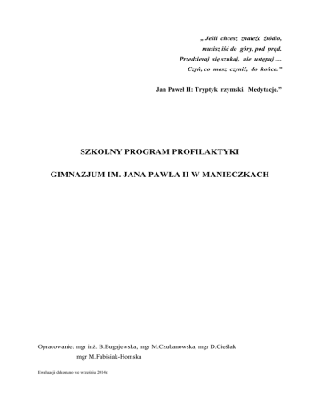 „ Jeśli chcesz znaleźć źródło, musisz iść do góry, pod prąd. Przedzieraj się szukaj, nie ustępuj .... Czyń, co masz czynić, do końca.” Jan Paweł II: Tryptyk rzymski. Medytacje.” SZKOLNY PROGRAM PROFILAKTYKI GIMNAZJUM IM. JANA PAWŁA II W MANIECZKACH Opracowanie: mgr inż. B.Bugajewska, mgr M.Czubanowska, mgr D.Cieślak mgr M.Fabisiak-Homska Ewaluacji dokonano we wrześniu 2014r. WPROWADZENIE Specyfika czasów, w których żyjemy, to przyspieszone tempo przemian, nie zawsze harmonijnych. Zwiększa się liczba czynników destrukcyjnych oddziałujących na młodzież, która staje wobec wyborów i decyzji bardzo złożonych i skomplikowanych. Skutkiem, czego stale wzrasta liczba osób przejawiających dysfunkcje rozwojowe oraz poszukujących wsparcia w trudnych sytuacjach życiowych. Aby przeciwdziałać temu zjawisku, konieczne jest podejmowanie na terenie szkoły wielopoziomowych działań profilaktycznych gdyż: • szkoła wypełnia znaczną część aktywnego życia dzieci i młodzieży, • szkoła jest miejscem intensywnego rozwoju w zakresie funkcjonowania interpersonalnego i społecznego w grupie rówieśniczej, • szkoła jest miejscem działalności zadaniowej uczniów, a więc ujawnia lub wręcz wyzwala trudności dzieci i młodzieży związane z przyjmowaniem odpowiedzialności za własne życie, • szkoła pozwala na łatwy dostęp do środowiska dzieci i młodzieży i sprawną organizację prowadzonych oddziaływań. Szkolny program profilaktyki to program profilaktyki środowiskowej, to znaczy taki, w którym obiektem działań jest całe środowisko szkolne. Profilaktyka to proces, który wspiera zdrowie przez umożliwienie ludziom uzyskania pomocy potrzebnej im do konfrontacji ze złożonymi, stresującymi warunkami życia oraz przez umożliwienie jednostkom osiąganie subiektywnie satysfakcjonującego, społecznie akceptowanego, bogatego życia (Z. Gaś, 1997). Zapobieganie uzależnieniom może dokonywać się na różnych poziomach. W związku z tym wyróżnia się profilaktykę podstawową i skierowana do grup ryzyka. Profilaktyka uniwersalna to działanie mające na celu: z jednej strony – promocję zdrowia i przedłużenie życia człowieka, zaś z drugiej strony zapobiegania pojawianiu się problemów związanych z zachowaniami dysfunkcjonalnymi. Szczególnie wyraźnie akcentuje się tutaj budowanie i rozwijanie różnorodnych umiejętności radzenia sobie z wymogami życia, albowiem deficyty w tym zakresie są powszechnie spotykane w populacji osób dysfunkcjonalnych. Równie ważne jest dostarczanie rzetelnych informacji, dostosowanych do specyfiki odbiorców. Profilaktyka skierowana do grup ryzyka ma na celu ujawnianie osób o najwyższym ryzyku dysfunkcjonalności oraz pomaganie im w redukcji tego ryzyka oraz przeciwdziałanie pogłębianiu się procesu chorobowego i umożliwienie osobie objętej terapią i rehabilitacją powrotu do społeczeństwa, prowadzenia w nim satysfakcjonującego i społecznie akceptowanego trybu życia, wolnego od patologii. PODSTAWA PRAWNA DZIAŁAŃ PROFILAKTYCZNYCH W SZKOLE Prawo do włączania w wychowanie programów profilaktycznych dają szkołom rozporządzenia i ustawy. Rozporządzenia MENiS z 31 stycznia 2002r. wprowadza zapis o podejmowaniu przez rady pedagogiczne uchwał o wprowadzeniu programu profilaktyki spójnego z programem wychowawczym. W Rozporządzeniu MEN z 21 maja 2001 r. w sprawie ramowych statutów publicznego przedszkola i publicznych szkół otrzymał brzmienie (załącznik nr 3) § 2, ust. 1 pkt. 1: 1. Cele i zadania szkoły wynikające z przepisów prawa oraz uwzględniające program wychowawczy szkoły i program profilaktyki dostosowany do potrzeb rozwojowych uczniów oraz potrzeb danego środowiska, o których mowa w odrębnych przepisach. 2. Program wychowawczy szkoły i program profilaktyki, o którym mowa w ust. 1 pkt. 1, uchwala rada pedagogiczna po zasięgnięciu opinii rady rodziców i samorządu uczniowskiego. Profilaktyka związana jest z ochroną zdrowia psychicznego. Ustawa o ochronie zdrowia psychicznego z dnia 19 sierpnia 1994r. podaje w rozdziale 1, art. 1. 1: „ ochronę zdrowia psychicznego zapewniają organy administracji rządowej i samorządowej oraz instytucje do tego powołane”. Art. 2. „ Ochrona zdrowia psychicznego polega w szczególności na: 1) promocji zdrowia psychicznego i zapobieganiu zaburzeniom psychicznym, 2) zapewnieniu osobom z zaburzeniami psychicznymi wszechstronnej i powszechnie dostępnej opieki zdrowotnej oraz innych form opieki i pomocy niezbędnych do życia w środowisku rodzinnym i społecznym”. Art. 4.1 „Działania zapobiegawcze w zakresie ochrony zdrowia psychicznego są podejmowane przede wszystkim wobec dzieci, młodzieży osób starszych i wobec osób znajdujących się w sytuacjach stwarzających zagrożenie dla zdrowia psychicznego”, czyli m. in. w sytuacjach stosowania środków uzależniających i pozostawania w sytuacjach szkodliwych dla równowagi psychicznej i emocjonalnej. W zakres działań profilaktycznych wchodzą zadania przeciwdziałania narkomanii, alkoholizmowi i nikotynie. Ustawa z dnia 26 października 1982r. o wychowaniu w trzeźwości i przeciwdziałaniu alkoholizmowi podaje w rozdz. 1, art. 2.1: „Zadania w zakresie przeciwdziałania alkoholizmowi wykonuje się przez odpowiednie kształtowanie polityki społecznej, a w szczególności: 1) tworzenie warunków sprzyjających realizacji potrzeb, których zaspokojenie motywuje do powstrzymywania się od spożywania alkoholu, 2) działalność wychowawczą i informacyjną. Art. 4. 1. Prowadzenie działań związanych z profilaktyką i rozwiązywaniem problemów alkoholowych należy do zadań własnych gmin. W szczególności zadania te obejmują: 3) prowadzenie profilaktycznej działalności informacyjnej i edukacyjnej, w szczególności dla dzieci i młodzieży”. Art. 5. „Minister właściwy do spraw oświaty i wychowania uwzględnia problem trzeźwości i 