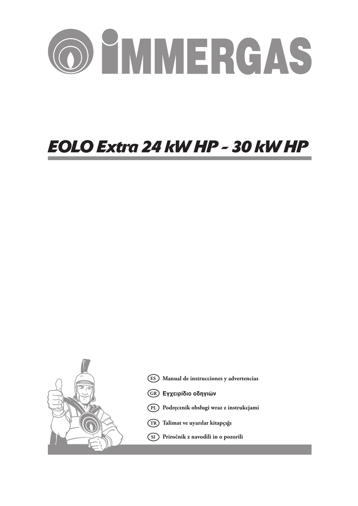 EOLO Extra 24 kW HP - 30 kW HP ES Manual de instrucciones y advertencias GR ∂ÁˉÂÈÚ›‰ÈÔ Ô‰ËÁÈÒÓ PL Podręcznik obsługi wraz z instrukcjami TR Talimat ve uyarılar kitapçığı SI Priročnik z navodili in o pozorili GR Αγαπητοί Πελάτες, Σας ευχαριστούμε που επιλέξατε ένα προϊόν Immergas υψηλής ποιότητας το οποίο θα σας εξασφαλίσει για μεγάλο χρονικό διάστημα ευεξία και ασφάλεια. Ως Πελάτες της Immergas μπορείτε να βασίζεστε σε μια ειδικευμένη Εξουσιοδοτημένη Υπηρεσία Τεχνικής Υποστήριξης, που έχει εκπαιδευτεί και καταρτιστεί για να σας εξασφαλίσει την αδιάλειπτη αποτελεσματικότητα του λέβητά σας. Διαβάστε προσεκτικά τις σελίδες που ακολουθούν. και θα μάθετε χρήσιμες πληροφορίες για τη σωστή χρήση της συσκευή, που θα πρέπει να τηρήσετε ώστε να μείνετε απόλυτα ευχαριστημένοι από την Immergas. Απευθυνθείτε άμεσα στην Εξουσιοδοτημένη Τεχνική υποστήριξη της περιοχής σας για να ζητήσετε τον αρχικό έλεγχο λειτουργίας. Ο τεχνικός μας θα πιστοποιήσει την καλή κατάσταση λειτουργίας, θα προβεί στις απαραίτητες ρυθμίσεις και θα σας υποδείξει τη σωστή χρήση του καυστήρα. Για τυχόν προβλήματα και τακτική συντήρηση απευθυνθείτε στα Εξουσιοδοτημένα Κέντρα Immergas τα οποία διαθέτουν τα πρωτότυπα εξαρτήματα που έχουν προετοιμαστεί ειδικά από τον κατασκευαστή. Γενικές προειδοποιήσεις ES Apreciado Cliente, Felicitaciones por haber elegido un producto Immergas de alta calidad, que le garantiza muchos años de seguridad y bienestar. Usted podrá contar con el apoyo de un Servicio Autorizado de Asistencia Técnica fiable y actualizado, capaz de mantener constante la eficiencia de la caldera. Lea atentamente este manual de instrucciones de uso: le brindará sugerencias útiles sobre el correcto uso del dispositivo, si las cumple, estará totalmente satisfecho con el producto que le brinda Immergas. Diríjase ya a su Centro Autorizado de Asistencia Técnica más cercano para pedir la prueba inicial de funcionamiento. Nuestro técnico controlará el funcionamiento, efectuará las regulaciones necesarias y le mostrará cómo utilizar el generador. Para cualquier necesidad de intervención o mantenimiento ordinario, diríjase a los Centros Autorizados Immergas: los cuales disponen de los componentes originales y del personal cualificado, puesto a su disposición directamente por el fabricante. Advertencias generales Este manual de instrucciones es una parte esencial del producto y debe entregarse al nuevo usuario, incluso en caso de cambio de propiedad o de subentrada. El mismo deberá conservarse con cuidado y consultarse atentamente, ya que contiene indicaciones de seguridad importantes para la fases de instalación, uso y mantenimiento. Conforme a la legislación vigente las instalaciones deben ser diseñadas por profesionales habilitados, en los límites dimensionales establecidos por la Ley. La instalación y el mantenimiento deben ser efectuados por personal cualificado que posea la competencia técnica que exige la ley y aplique las normas vigentes y las instrucciones del fabricante y por personal cualificado que posea la competencia técnica que exige la ley y aplique las normas vigentes y las instrucciones del fabricante, como prevé la Ley. Una instalación incorrecta puede causar a personas, animales o cosas daños de los que el fabricante no es responsable. El mantenimiento requiere personal técnico autorizado. El Servicio Autorizado de Asistencia Técnica Immergas es garantía de cualificación y profesionalidad. La caldera debe utilizarse sólo para los fines para los que ha sido proyectada. Cualquier otro uso se considera inadecuado y por tanto potencialmente peligroso. El fabricante se exime de toda responsabilidad contractual o no contractual por eventuales daños y la garantía queda anulada, en caso de errores de instalación, uso o mantenimiento debidos al incumplimiento de la norma técnica y/o de las instrucciones del manual o del fabricante. Para obtener más información sobre la instalación de los generadores de calor con funcionamiento a gas consulte la página de Immergas: www.immergas.com DECLARACIÓN CE DE CONFORMIDAD En conformidad con la Directiva “Aparatos del gas” CE 90/396, la Directiva EMC CE 2004/108, la Directiva rendimientos CE 92/42 y la Directiva Baja Tensión 2006/95 CE. El fabricante: Immergas S.p.A. v. Cisa Ligure n° 95 42041 Brescello (RE) DECLARA QUE: las calderas Immergas modelo: Eolo Extra 24-30kW HP están en conformidad con dichas Directivas Comunitarias Director de Investigación y Desarrollo Mauro Guareschi Firma: Immergas S.p.A. se exime de cualquier responsabilidad por errores de impresión o trascripción, reservándose el derecho de aportar a sus manuales técnicos y comerciales, cualquier modificación sin previo aviso. IMMERGAS Hispania, S.A. C/Comarques Pais Valencià, 62 • Ctra. N-III km-345 • Apdo. 48 46930 QUART DE POBLET (Valencia) Tel. 96 192 10 76 • Fax 96 192 10 66 E-mail: [email protected] • www.immergash.com Delegación Madrid c/Embajadores, 198-bajo 28045 MADRID Tel. 91 468 01 94 • Fax. 91 528 30 52 Το εγχειρίδιο οδηγιών αποτ