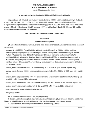 UCHWAŁA NR XLII/291/09 RADY MIEJSKIEJ W SŁAWIE z dnia 29 października 2009 r. w sprawie uchwalenia statutu Biblioteki Publicznej w Sławie Na podstawie art. 40 ust. 2 pkt 2 ustawy z dnia 8 marca 1990 r. o samorządzie gminnym (tj. Dz. U. z 2001 r. Nr 142, poz. 1591 z późn. zm.), art. 13 ust.1 i 2 ustawy z dnia 25 października 1991 r. o organizowaniu i prowadzeniu działalności kulturalnej (tj. Dz. U. z 2001 r. Nr 13, poz. 123, z późn. zm.) oraz art. 11 ust. 1 i 3 ustawy z dnia 27 czerwca 1997 r. o bibliotekach (Dz. U. Nr 85, poz. 123 z późn. zm.), Rada Miejska uchwala, co następuje; STATUT BIBLIOTEKI PUBLICZNEJ W SŁAWIE Rozdział 1 Postanowienia ogólne § 1. Biblioteka Publiczna w Sławie, zwana dalej „Biblioteką” została utworzona i działa na zasadach określonych: - uchwałą Nr XLI/279/09 Rady Miejskiej w Sławie z dnia 10 września 2009 r. – Akt o podziale samorządowej instytucji kultury – Sławskiego Centrum Kultury i utworzeniu Sławskiego Centrum Kultury i Wypoczynku oraz Biblioteki Publicznej w Sławie, w brzmieniu nadanym uchwałą Nr XLII/288/09 Rady Miejskiej w Sławie z dnia 29 października 2009 r. w sprawie zmiany uchwały Nr XLI/279/09 Rady Miejskiej w Sławie z dnia 10 września 2009 r. – Akt o podziale samorządowej instytucji kultury - Sławskiego Centrum Kultury, zmianie zakresu działania oraz utworzeniu Biblioteki Publicznej w Sławie, - ustawą z dnia 27 czerwca 1990 r. o bibliotekach (Dz. U. z dnia 28 lipca 1998 r. z późn. zm.), - ustawą z dnia 8 marca 1990 r. o samorządzie gminnym (tj. Dz. U. z 2001 r. Nr 142, poz. 1591 z późn. zm.), - ustawą z dnia 25 października 1991 r. o organizowaniu i prowadzeniu działalności kulturalnej (tj. Dz, U, z 2001 r. Nr 13, poz. 123 z późn. zm.), - ustawą z dnia 29 września 1994 r. o rachunkowości (tj. Dz. U. z 2002 r. Nr 76, poz. 694 z późn. zm.), - ustawą o ochronie danych osobowych (tj. Dz. U. z 2002 r. Nr 101, poz. 926 z późn. zm.) - innych przepisów powszechnie obowiązujących, - niniejszego statutu. § 2. 1. Biblioteka jest samorządową instytucją kultury. 2. Siedzibą Biblioteki znajduje się w Sławie przy ul. Głogowskiej 5, a terenem działania jest Gmina Sława; w skład Biblioteki wchodzą biblioteki i filie – wykaz stanowi załącznik do statutu. 3. Organizatorem Biblioteki jest Gmina Sława, zwana dalej „Gminą”. 4. Biblioteka powstaje w oparciu o wydzielone mienie i załogę Biblioteki Publicznej Gminy i Miasta ID: KPTTQ-IKMAQ-IPXFZ-NJZJU-BMDUE. Podpisany. Strona 1 / 5 w Sławie, funkcjonującej dotychczas jako forma organizacyjna w ramach Sławskiego Centrum Kultury. 5. Biblioteka przejmuje składniki mienia ruchomego oraz wierzytelności i zobowiązania związane z działalnością wydzielonej jednostki organizacyjnej. Sława; w skład Biblioteki wchodzą biblioteki i filie – wykaz stanowi załącznik do statutu. 3. Organizatorem Biblioteki jest Gmina Sława, zwana dalej „Gminą”. 4. Biblioteka powstaje w oparciu o wydzielone mienie i załogę Biblioteki Publicznej Gminy i Miasta w Sławie, funkcjonującej dotychczas jako forma organizacyjna w ramach Sławskiego Centrum Kultury. 5. Biblioteka przejmuje składniki mienia ruchomego oraz wierzytelności i zobowiązania związane z działalnością wydzielonej jednostki organizacyjnej. 6. Biblioteka wstępuje w prawa i obowiązki wynikające ze stosunków pracy pracowników Sławskiego Centrum Kultury, którzy wykonują zadania przejmowane przez Bibliotekę. 7. Przejęcia mienia, wierzytelności i zobowiązań oraz wstąpienie w prawa i obowiązki wynikające ze stosunków pracy następuje z chwilą wpisania Biblioteki do gminnego rejestru instytucji kultury. Rozdział 2 Cel i przedmiot działania Biblioteki § 3. 1. Działalność Biblioteki nie stanowi działalności gospodarczej i nie jest nastawiona na osiąganie zysku. 2. Do zakresu działania Biblioteki należy zaspakajanie potrzeb oświatowych, kulturalnych i informacyjnych społeczeństwa Gminy Sława oraz uczestnictwo w upowszechnianiu wiedzy i kultury, w szczególności poprzez: - gromadzenie, opracowywanie, przechowywanie i ochrona materiałów bibliotecznych, - obsługa użytkowników, przede wszystkim udostępnianie zbiorów oraz prowadzenie działalności informacyjnej, zwłaszcza informowanie o zbiorach własnych, innych bibliotek, muzeów i ośrodków informacji naukowej, a także współdziałanie z archiwami w tym zakresie, - prowadzenie działalności bibliograficznej, dokumentacyjnej, naukowo-badawczej, edukacyjnej i popularyzatorskiej, - udostępnianie zbiorów na miejscu, wypożyczanie na zewnątrz, prowadzenie wymiany międzybibliotecznej, - organizowanie czytelnictwa i udostępnianie materiałów bibliotecznych mieszkańcom Gminy Sława, - współdziałanie z innymi bibliotekami i instytucjami kultury w zakresie rozwijania czytelnictwa i zaspokajania potrzeb oświatowych i kulturalnych społeczności Gminy Sława, - tworzenie i udostępnianie baz danych katalogowych, bibliograficznych i faktograficznych, - organizowanie i prowadzenie różnych form pracy z czytelnikiem, służących popularyzacji książki, sztuki i nauki oraz upowszechnianiu dorobku kulturalnego Gminy Sława. Rozdział 3 Organizacja i zarządzanie § 4. 1. Działalnością Biblioteki kieruje Dyrektor. 2. Dyrektora zatrudnia i zwalnia Burmistrz Sławy, zgodnie z ustawą z dnia 25 października 1991 r. o organizowaniu i prowadzeniu działalności kulturalnej. 3. Dyrektor może być wyłoniony w drodze konkursu. O przeprowadzeniu konkursu decyduje Burmistrz Sławy, który ustala też Regulamin. 4. Burmistrz Sławy może powierzyć zarządzanie Biblioteką osobie fizycznej lub prawnej. Zgodnie ID: KPTTQ-IKMAQ-IPXFZ-NJZJU-BMDUE. Podpisany. Strona 2 / 5 z ustawą, o której mowa w ust. 2. Do osoby, której powierzono zarządzanie Biblioteką stosuje się odpowiednio postanowienia dotyczące Dyrektora. 5. Burmistrz Sławy wykonuje wobec Dyrektora czynności z zakresu prawa