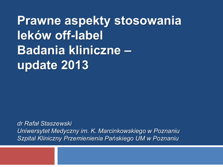 Prawne aspekty stosowania leków off-label Badania kliniczne – update 2013 dr Rafał Staszewski Uniwersytet Medyczny im. K. Marcinkowskiego w Poznaniu Szpital Kliniczny Przemienienia Pańskiego UM w Poznaniu Eksperyment medyczny Eksperyment badawczy Eksperyment leczniczy Podanie leku off-label Oznacza podanie leku poza zarejestrowanym wskazaniem terapeutycznym wymienionym w Charakterystyce Produktu Leczniczego Rejestracja jest rynkowym zaakceptowaniem dowodu naukowego, że dany lek nadaje się wyłącznie do stosowania w schorzeniach czy objawach chorobowych, w których przeprowadzono badanie kliniczne. Podanie off-label W sposób lub z użyciem drogi nie wymienionej w ChPL W populacji pacjentów dla których dawkowanie nie jest ustalone W populacji dla której nie ustalono bezpieczeństwa stosowania leku Warunki podania leku off-label Zaordynowany przez konkretnego lekarza dla konkretnego pacjenta Pacjent powinien wyrazić świadomą zgodę Wyłączenie odpowiedzialności podmiotu odpowiedzialnego za ewentualne działania niepożądane jakie mogą wystąpić w związku z podaniem leku off-label Odpowiedzialność prawna ChPL nie stanowi aktu prawnego w sensie normatywnym. W szczególności nie można jej traktować jako normy prawnej powszechnie obowiązującej ale ChPL jest zbiorem wskazówek stosowania danego leku. Lekarz , który stosuje się do ChPL uniknie odpowiedzialności za ewentualne zdarzenia niepożądane Przesłanki do stosowania leków offlabel istnieje dowód naukowy skuteczności i bezpieczeństwa stosowania leku wyprzedzający rejestrację lek znajduje się w zaleceniach towarzystw naukowych w przypadku ciężkiej choroby zagrażającej życiu w sytuacji gdy nie jest dostępne leczenie alternatywne lub okazało się być nieskuteczne Wyrok Sądu Apelacyjnego w Poznaniu z dnia 17 września 2013 Pacjenci uczestniczący w badania klinicznych mieli prawo do świadczeń gwarantowanych, określonych art. 15 ustawy o świadczeniach…. Obowiązek sponsora sprowadzał się do finansowania tych świadczeń, które nie zostałyby udzielone pacjentowi, gdyby nie był objęty badaniem klinicznym Fakt, że daty wykonania części świadczeń medycznych pokrywały się terminami wizyt opisanymi w protokole, nie przesądza o tym, że zakwestionowana czynność medyczna miała jedynie związek z badaniem klinicznym Wyrok Sądu Apelacyjnego w Poznaniu z dnia 17 września 2013 Kontrola prowadzona w Szpitalu oparta była na błędnym, wynikającym z wadliwej interpretacji obowiązujących wówczas przepisów założeniu, że jeśli w protokole badania klinicznego wymieniono świadczenie gwarantowane, to pomimo iż jego realizacja wynikała ze standardowego postępowania medycznego w danej jednostce chorobowej, a nie konieczności przeprowadzenia badania, jest to świadczenie na rzecz badania klinicznego i powinno w całości pokryte przez sponsora Rynek badań klinicznych Źródło: PwC, 2011 Źródło: PwC, 2011 Źródło: PwC, 2011 Pytania w 2013 r. Jak interpretować art. 37k PF Odpowiedzialność / ubezpieczenia Zdarzenia niepożądane / działalnie niepożądane badanego produktu leczniczego Sprawne kontraktowanie – bez szans na powodzenie? Źródło: www.kwejk.pl Finansowanie świadczeń medycznych (PF) Sponsor finansuje świadczenia opieki zdrowotnej związane z badaniem klinicznym i objęte protokołem badania klinicznego, które nie mieszczą się w zakresie świadczeń gwarantowanych, o których mowa w ustawie z dnia 27 sierpnia 2004 r. o świadczeniach opieki zdrowotnej finansowanych ze środków publicznych, w szczególności dostarcza bezpłatnie uczestnikom badania klinicznego badane produkty lecznicze, komparatory oraz urządzenia stosowane do ich podawania. Finansowanie – wyjątki świadczenia opieki zdrowotnej: 1) niezbędne do usunięcia skutków pojawiających się powikłań zdrowotnych wynikających z zastosowania badanego produktu leczniczego, 2) których konieczność udzielenia wyniknie z zastosowania badanego produktu leczniczego, 3) niezbędne do zakwalifikowania pacjenta do udziału w badaniu klinicznym – sponsor finansuje również, jeżeli świadczenia te są świadczeniami gwarantowanymi w rozumieniu przepisów ustawy z dnia 27 sierpnia 2004 r. o świadczeniach opieki zdrowotnej finansowanych ze środków publicznych. . Jak rozliczać pacjentów włączonych do badań klinicznych z NFZ? Odpowiedzialność a ośrodek badawczy Szkoda pacjenta wynikająca z winy badacza / sponsora Leczenie powikłań związanych z badaniem klinicznym Szkoda sponsora spowodowana działaniem / zaniechaniem ośrodka badawczego Zdarzenia niepożądane w badaniu klinicznym a finansowanie świadczeń AE SAE ADR Problemowe zapisy umów – ubezpieczenie Sponsor: „Instytucja zobowiązuje się przyjąć na siebie całkowitą odpowiedzialność oraz zwalnia Sponsora, a także jego członków zarządu, dyrektorów, pracowników oraz przedstawicieli od wszelkich roszczeń, żądań lub procesów sądowych wynikających z: (a) nierozmyślnego działania, zaniedbania lub zaniechania ze strony instytucji, badacza i/lub jakiegokolwiek członka zespołu badawczego i/lub (b) nieprzestrzegania przez instytucję, badacza i/lub członka zespołu badawczego postanowień umowy, protokołu lub pisemnych zaleceń wydawanych przez sponsora”. Problemowe zapisy umów – ubezpieczenie Sponsor: Sponsor zgodzi się zwrócić Ośrodkowi Badawczemu i Badaczowi koszty medyczne związane z urazami spowodowanymi przez Produkt Badany włączając koszty leczenia powikłań procedur medycznych przewidzianych protokołem oraz ciężkiego niepożądanego działania produktu leczniczego (SAE). Ośrodek Badawczy ponosi pełną odpowiedzialność za (i) rażące zaniedbanie lub winę umyślną Badacza, Ośrodka Badawczego lub Członków Zespołu Badawczego w Ośrodku; (ii) wszelkie odstępstwa od Protokołu Problemowe zapisy umów – ubezpieczenie Ośrodek i/lub Badacz ponosić będą wyłączną odpowiedzi