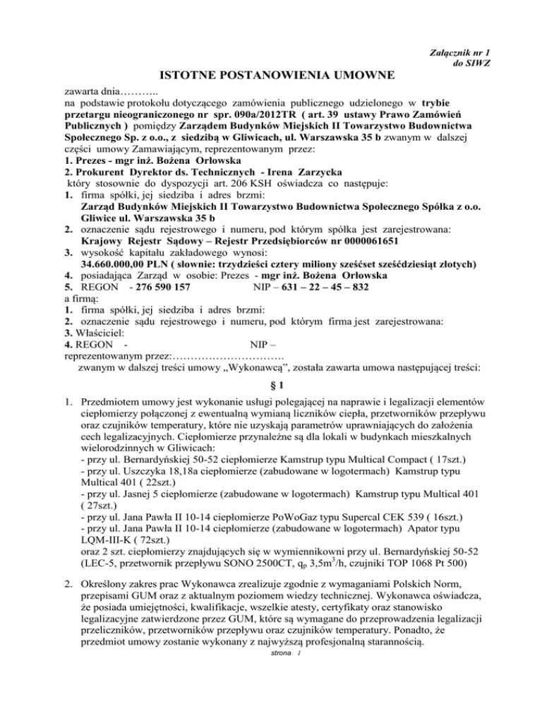 Załącznik nr 1 do SIWZ ISTOTNE POSTANOWIENIA UMOWNE zawarta dnia……….. na podstawie protokołu dotyczącego zamówienia publicznego udzielonego w trybie przetargu nieograniczonego nr spr. 090a/2012TR ( art. 39 ustawy Prawo Zamówień Publicznych ) pomiędzy Zarządem Budynków Miejskich II Towarzystwo Budownictwa Społecznego Sp. z o.o., z siedzibą w Gliwicach, ul. Warszawska 35 b zwanym w dalszej części umowy Zamawiającym, reprezentowanym przez: 1. Prezes - mgr inż. Bożena Orłowska 2. Prokurent Dyrektor ds. Technicznych - Irena Zarzycka który stosownie do dyspozycji art. 206 KSH oświadcza co następuje: 1. firma spółki, jej siedziba i adres brzmi: Zarząd Budynków Miejskich II Towarzystwo Budownictwa Społecznego Spółka z o.o. Gliwice ul. Warszawska 35 b 2. oznaczenie sądu rejestrowego i numeru, pod którym spółka jest zarejestrowana: Krajowy Rejestr Sądowy – Rejestr Przedsiębiorców nr 0000061651 3. wysokość kapitału zakładowego wynosi: 34.660.000,00 PLN ( słownie: trzydzieści cztery miliony sześćset sześćdziesiąt złotych) 4. posiadająca Zarząd w osobie: Prezes - mgr inż. Bożena Orłowska 5. REGON - 276 590 157 NIP – 631 – 22 – 45 – 832 a firmą: 1. firma spółki, jej siedziba i adres brzmi: 2. oznaczenie sądu rejestrowego i numeru, pod którym firma jest zarejestrowana: 3. Właściciel: 4. REGON NIP – reprezentowanym przez:…………………………. zwanym w dalszej treści umowy „Wykonawcą”, została zawarta umowa następującej treści: §1 1. Przedmiotem umowy jest wykonanie usługi polegającej na naprawie i legalizacji elementów ciepłomierzy połączonej z ewentualną wymianą liczników ciepła, przetworników przepływu oraz czujników temperatury, które nie uzyskają parametrów uprawniających do założenia cech legalizacyjnych. Ciepłomierze przynależne są dla lokali w budynkach mieszkalnych wielorodzinnych w Gliwicach: - przy ul. Bernardyńskiej 50-52 ciepłomierze Kamstrup typu Multical Compact ( 17szt.) - przy ul. Uszczyka 18,18a ciepłomierze (zabudowane w logotermach) Kamstrup typu Multical 401 ( 22szt.) - przy ul. Jasnej 5 ciepłomierze (zabudowane w logotermach) Kamstrup typu Multical 401 ( 27szt.) - przy ul. Jana Pawła II 10-14 ciepłomierze PoWoGaz typu Supercal CEK 539 ( 16szt.) - przy ul. Jana Pawła II 10-14 ciepłomierze (zabudowane w logotermach) Apator typu LQM-III-K ( 72szt.) oraz 2 szt. ciepłomierzy znajdujących się w wymiennikowni przy ul. Bernardyńskiej 50-52 (LEC-5, przetwornik przepływu SONO 2500CT, qp 3,5m3/h, czujniki TOP 1068 Pt 500) 2. Określony zakres prac Wykonawca zrealizuje zgodnie z wymaganiami Polskich Norm, przepisami GUM oraz z aktualnym poziomem wiedzy technicznej. Wykonawca oświadcza, że posiada umiejętności, kwalifikacje, wszelkie atesty, certyfikaty oraz stanowisko legalizacyjne zatwierdzone przez GUM, które są wymagane do przeprowadzenia legalizacji przeliczników, przetworników przepływu oraz czujników temperatury. Ponadto, że przedmiot umowy zostanie wykonany z najwyższą profesjonalną starannością. strona 1 §2 1. Zakres zamówienia obejmuje: a. demontaż oraz montaż przeliczników, przetworników przepływu oraz czujników temperatury, b. zapewnienie na okres legalizacji odpowiednich „wstawek” do układów pomiaroworozliczeniowych, sprawdzenie szczelności instalacji c. przygotowanie urządzeń do legalizacji ( sprawdzenie formalne, oględziny zewnętrzne w celu wykrycia defektów mechanicznych, czyszczenie ), d. kontrolę metrologiczną przeliczników, czujników temperatury i przetworników przepływu, które zostały dostarczone do legalizacji, e. wymianę baterii zasilających w przelicznikach, f. w przypadku pozytywnego wyniku kontroli metrologicznej, nałożenie cechy Okręgowego Urzędu Miar, g. spisanie protokołu z demontażu i montażu ciepłomierzy (m.in. numer licznika, stany, podpis najemcy) zgodnego z wzorem podanym przez Zamawiającego h. ewentualną naprawę, regulację urządzeń, i. w przypadku stwierdzenia uszkodzenia części ciepłomierza, których naprawa przekroczyłaby koszt nowego urządzenia dopuszcza się wymianę na nowy odpowiedniego typu i parametrach, po akceptacji Zamawiającego 2. Po przekazaniu przez Zamawiającego protokołem ciepłomierzy, Wykonawca ponosi pełną odpowiedzialność materialną za ich stan techniczny podczas transportu i legalizacji aż do komisyjnego odbioru. 3. Wykonawca przekaże ciepłomierze po legalizacji (posiadające znaki legalizacyjne) na podstawie protokołu odbioru oraz zbiorczego zestawienia legalizowanych liczników. 4. Wykonawca po sprawdzeniu, powiadomi pisemnie Zamawiającego o elementach ciepłomierzy, które nie przeszłyby procedury legalizacji i wymagają naprawy. Zostanie wykonany protokół z podaniem ceny ewentualnej regulacji lub naprawy. Zamawiający wyda decyzję o naprawie lub zakupie nowych części. Wszystkie ciepłomierze, które nie przejdą legalizacji i nie ma możliwości ich naprawy są zwracane do Zamawiającego z protokołem sprawdzenia, w którym należy wykazać uszkodzenia. §3 Koszty sprawdzenia i legalizacji ciepłomierzy, demontażu, montażu oraz nadzoru podczas demontażu, montażu i transportu na trasie z Gliwic do miejsca legalizacji w obydwu kierunkach ponosi Wykonawca. §4 Wykonawca zobowiązuje się zachować właściwą organizację, porządek i czystość podczas wykonywania zamówienia. §5 1. Przekazywanie elementów ciepłomierzy do kontroli metrologicznej będzie się odbywać partiami. Terminy demontażu i montażu Zamawiający uzgodni z Wykonawcą. 2. Ponowny montaż każdej partii zbadanych elementów powinien nastąpić najpóźniej w ciągu 14 dni od chwili przekazania elementów ciepłomierzy Wykonawcy. 3. Termin zakończenia całego zakresu robót objętego w §1 i §2 umowy ustala się na dzień 30 wrzesień 2012r. strona 2 4. W przypadku wystąpienia opóźnienia w realizacji umowy z przyczyn niezależnych od Wykonawcy, 