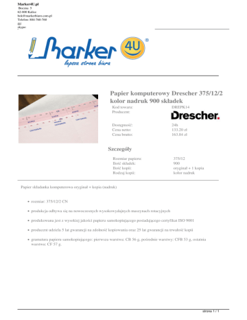 Marker4U.pl Boczna 5 62-800 Kalisz [email protected] Telefon: 884-760-760 gg: skype: Papier komputerowy Drescher 375/12/2 kolor nadruk 900 składek Kod towaru: Producent: DREPK14 Dostępność: Cena netto: Cena brutto: 24h 133.20 zł 163.84 zł Szczegóły Rozmiar papieru: Ilość składek: Ilość kopii: Rodzaj kopii: 375/12 900 oryginał + 1 kopia kolor nadruk Papier składanka komputerowa oryginał + kopia (nadruk) rozmiar: 375/12/2 CN produkcja odbywa się na nowoczesnych wysokowydajnych maszynach rotacyjnych produkowana jest z wysokiej jakości papieru samokopiującego posiadającego certyfikat ISO 9001 producent udziela 5 lat gwarancji na zdolność kopiowania oraz 25 lat gwarancji na trwałość kopii gramatura papieru samokopiującego: pierwsza warstwa: CB 56 g, pośrednie warstwy: CFB 53 g, ostatnia warstwa: CF 57 g. strona 1 / 1 Powered by TCPDF (www.tcpdf.org)