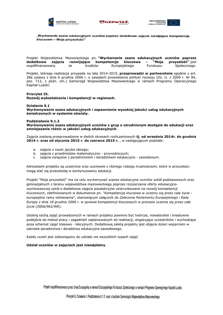 Projekt Województwa Mazowieckiego pn. "Wyrównanie szans edukacyjnych uczniów poprzez dodatkowe zajęcia rozwijające kompetencje kluczowe "Moja przyszłość" jest współfinansowany ze środków Europejskiego Funduszu Społecznego. Projekt, którego realizacja przypada na lata 2014-2015, przeprowadzi w partnerstwie zgodnie z art. 28a ustawy z dnia 6 grudnia 2006 r. o zasadach prowadzenia polityki rozwoju (Dz. U. z 2009 r. Nr 84, poz. 712, z późn. zm.) Samorząd Województwa Mazowieckiego w ramach Programu Operacyjnego Kapitał Ludzki: Priorytet IX. Rozwój wykształcenia i kompetencji w regionach. Działanie 9.1 Wyrównywanie szans edukacyjnych i zapewnienie wysokiej jakości usług edukacyjnych świadczonych w systemie oświaty. Poddziałanie 9.1.2 Wyrównywanie szans edukacyjnych uczniów z grup o utrudnionym dostępie do edukacji oraz zmniejszanie różnic w jakości usług edukacyjnych. Zajęcia zostaną przeprowadzone w dwóch okresach rozliczeniowych tj. od września 2014r. do grudnia 2014 r. oraz od stycznia 2015 r. do czerwca 2015 r. , w następującym podziale: a. b. c. zajęcia z nauki języka obcego; zajęcia z przedmiotów matematyczno - przyrodniczych; zajęcia związane z poradnictwem i doradztwem edukacyjno - zawodowym. Adresatami projektu są uczennice oraz uczniowie z różnego rodzaju trudnościami, które w przyszłości mogą stać się przeszkodą w kontynuowaniu edukacji. Projekt "Moja przyszłość" ma na celu wyrównywać szanse edukacyjne uczniów szkół podstawowych oraz gimnazjalnych z terenu województwa mazowieckiego poprzez rozszerzanie oferty edukacyjnowychowawczej szkół o dodatkowe zajęcia pozalekcyjne ukierunkowane na rozwój kompetencji kluczowych, zdefiniowanych w dokumencie pn. "Kompetencje kluczowe w uczeniu się przez całe życie europejskie ramy odniesienia", stanowiącym załącznik do Zalecenia Parlamentu Europejskiego i Rady Europy z dnia 18 grudnia 2006 r. w sprawie kompetencji kluczowych w procesie uczenia się przez całe życie (2006/962/WE). Istotną cechą zajęć prowadzonych w ramach projektu powinno być twórcze, nowatorskie i kreatywne podejście do metod pracy i zagadnień zaplanowanych do realizacji, angażujące uczestników i wychodzące poza schemat zajęć klasowo - lekcyjnych. Dodatkową zaletą projektu jest objęcie dzieci wsparciem w zakresie poradnictwa i doradztwa edukacyjno-zawodowego. Każdy uczeń jest zobowiązany do udziału we wszystkich typach zajęć. Udział uczniów w zajęciach jest nieodpłatny.