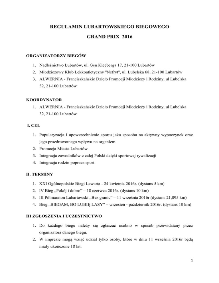REGULAMIN LUBARTOWSKIEGO BIEGOWEGO GRAND PRIX 2016