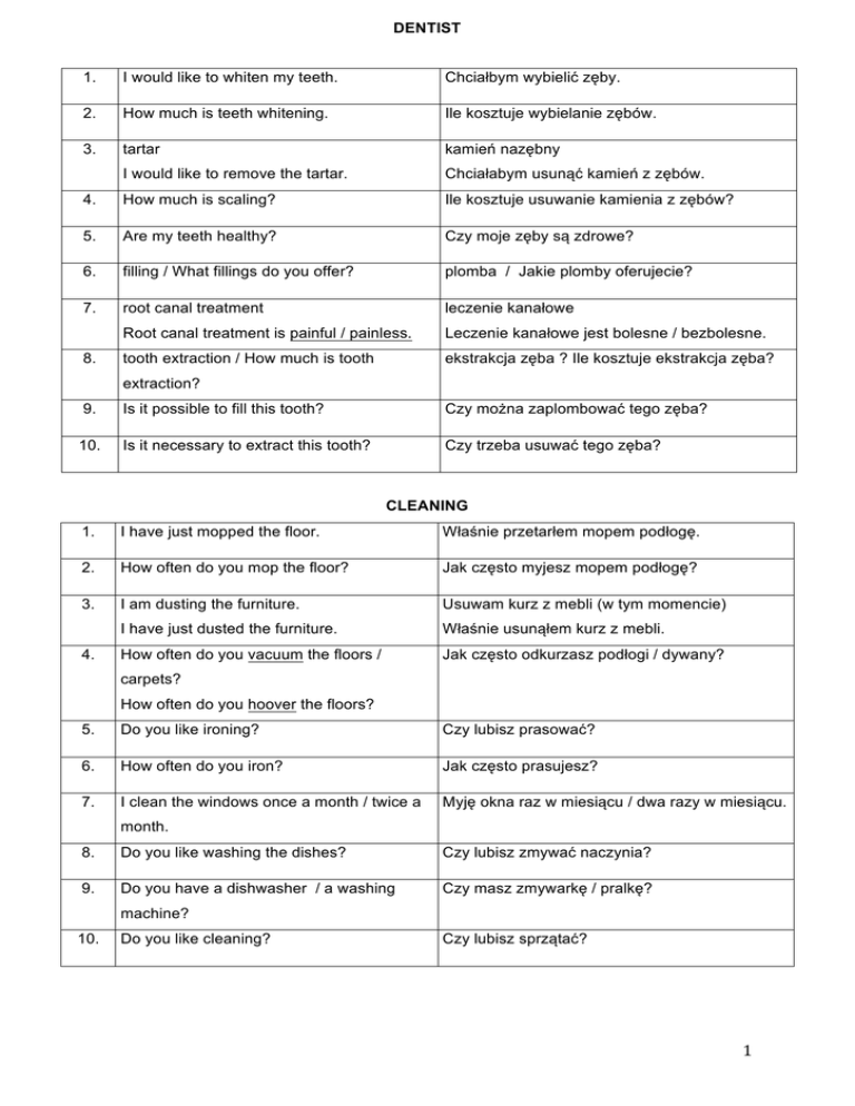DENTIST 1. I would like to whiten my teeth. Chciałbym wybielić zęby. 2. How much is teeth whitening. Ile kosztuje wybielanie zębów. 3. tartar kamień nazębny I would like to remove the tartar. Chciałabym usunąć kamień z zębów. 4. How much is scaling? Ile kosztuje usuwanie kamienia z zębów? 5. Are my teeth healthy? Czy moje zęby są zdrowe? 6. filling / What fillings do you offer? plomba / Jakie plomby oferujecie? 7. root canal treatment leczenie kanałowe Root canal treatment is painful / painless. Leczenie kanałowe jest bolesne / bezbolesne. tooth extraction / How much is tooth ekstrakcja zęba ? Ile kosztuje ekstrakcja zęba? 8. extraction? 9. Is it possible to fill this tooth? Czy można zaplombować tego zęba? 10. Is it necessary to extract this tooth? Czy trzeba usuwać tego zęba? CLEANING 1. I have just mopped the floor. Właśnie przetarłem mopem podłogę. 2. How often do you mop the floor? Jak często myjesz mopem podłogę? 3. I am dusting the furniture. Usuwam kurz z mebli (w tym momencie) I have just dusted the furniture. Właśnie usunąłem kurz z mebli. How often do you vacuum the floors / Jak często odkurzasz podłogi / dywany? 4. carpets? How often do you hoover the floors? 5. Do you like ironing? Czy lubisz prasować? 6. How often do you iron? Jak często prasujesz? 7. I clean the windows once a month / twice a Myję okna raz w miesiącu / dwa razy w miesiącu. month. 8. Do you like washing the dishes? Czy lubisz zmywać naczynia? 9. Do you have a dishwasher / a washing Czy masz zmywarkę / pralkę? machine? 10. Do you like cleaning? Czy lubisz sprzątać? 1 LOST THINGS 1. I have lost a wallet / an ID / a passport. Zgubiłem portfel / dowód osobisty / paszport. 2. I can’t find my wallet / my ID / my passport. Nie potrafię znaleźć portfela / dowodu / paszportu. 3. My wallet is small / big. Mój portfel jest mały / duży. My wallet is square /rectangular. Mój portfel jest kwadratowy / prostokątny. 4. My wallet is brown / black / red. Mój portfel jest brązowy / czarny / czerwony. 5. My wallet is made of leather / artificial Mój portfel jest skórzany / jest skóropodobny. leather. 6. Inside the wallet there were my ID, money W środku portfela znajdowały się: dowód and credit cards. osobisty, pieniądze i karty kredytowe. to steal / stole / stolen kraść Someone has stolen my wallet. Ktoś ukradł mój portfel. 8. I would like to report a stolen credit card. Chciałbym zgłosić kradzież karty kredytowej. 9. Where is the lost and found office? Gdzie znajduje się biuro rzeczy zagubionych? 10. I would like to report a theft. Chciałbym zgłosić kradzież. 7. HAIRDRESSER 1. cut hair / cut hair a little ścinać włosy / podciąć włosy I would like to cut hair. Chciałbym ściąć włosy. dye hair / color hair farbować włosy I would like to dye / color hair. Chciałabym zafarbować włosy. do hair / change hairstyle robić fryzurę / zmienić fryzurę I would like to change my hairstyle. Chciałabym zmienić fryzurę. 4. highlights pasemka 5. Are highlights trendy? Czy pasemka są modne? 6. bleach hair rozjaśnić włosy 7. It is possible to bleach my hair? Czy można rozjaśnić moje włosy? 8. darken hair przyciemniać włosy 9. Is it possible to darken my hair? Czy da się przyciemnić moje włosy? 10. grey hair siwe włosy How to get rid of grey hair? Jak pozbyć się siwych włosów? 2. 3. 2