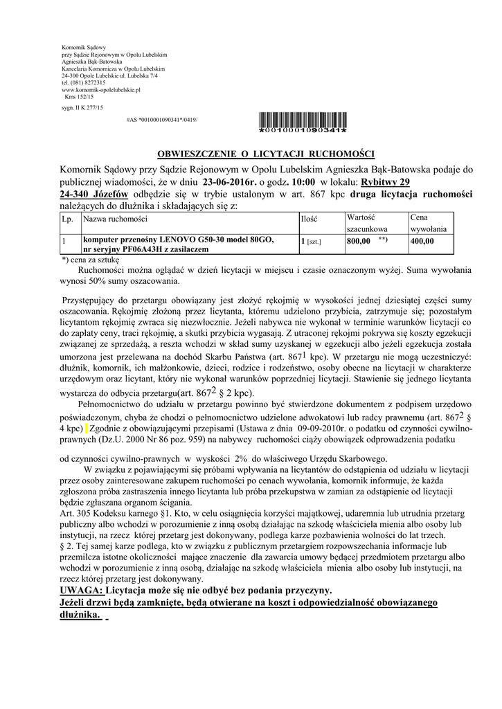 Komornik Sądowy przy Sądzie Rejonowym w Opolu Lubelskim Agnieszka Bąk-Batowska Kancelaria Komornicza w Opolu Lubelskim 24-300 Opole Lubelskie ul. Lubelska 7/4 tel. (081) 8272315 www.komornik-opolelubelskie.pl Kms 152/15 sygn. II K 277/15 #AS *0010001090341*/0419/ *0010001090341* OBWIESZCZENIE O LICYTACJI RUCHOMOŚCI Komornik Sądowy przy Sądzie Rejonowym w Opolu Lubelskim Agnieszka Bąk-Batowska podaje do publicznej wiadomości, że w dniu 23-06-2016r. o godz. 10:00 w lokalu: Rybitwy 29 24-340 Józefów odbędzie się w trybie ustalonym w art. 867 kpc druga licytacja ruchomości należących do dłużnika i składających się z: Lp. Nazwa ruchomości komputer przenośny LENOVO G50-30 model 80GO, nr seryjny PF06A43H z zasilaczem *) cena za sztukę 1 Ilość 1 [szt.] Wartość szacunkowa 800,00 **) Cena wywołania 400,00 Ruchomości można oglądać w dzień licytacji w miejscu i czasie oznaczonym wyżej. Suma wywołania wynosi 50% sumy oszacowania. Przystępujący do przetargu obowiązany jest złożyć rękojmię w wysokości jednej dziesiątej części sumy oszacowania. Rękojmię złożoną przez licytanta, któremu udzielono przybicia, zatrzymuje się; pozostałym licytantom rękojmię zwraca się niezwłocznie. Jeżeli nabywca nie wykonał w terminie warunków licytacji co do zapłaty ceny, traci rękojmię, a skutki przybicia wygasają. Z utraconej rękojmi pokrywa się koszty egzekucji związanej ze sprzedażą, a reszta wchodzi w skład sumy uzyskanej w egzekucji albo jeżeli egzekucja została umorzona jest przelewana na dochód Skarbu Państwa (art. 8671 kpc). W przetargu nie mogą uczestniczyć: dłużnik, komornik, ich małżonkowie, dzieci, rodzice i rodzeństwo, osoby obecne na licytacji w charakterze urzędowym oraz licytant, który nie wykonał warunków poprzedniej licytacji. Stawienie się jednego licytanta wystarcza do odbycia przetargu(art. 8672 § 2 kpc). Pełnomocnictwo do udziału w przetargu powinno być stwierdzone dokumentem z podpisem urzędowo poświadczonym, chyba że chodzi o pełnomocnictwo udzielone adwokatowi lub radcy prawnemu (art. 8672 § 4 kpc) Zgodnie z obowiązującymi przepisami (Ustawa z dnia 09-09-2010r. o podatku od czynności cywilnoprawnych (Dz.U. 2000 Nr 86 poz. 959) na nabywcy ruchomości ciąży obowiązek odprowadzenia podatku od czynności cywilno-prawnych w wyskości 2% do właściwego Urzędu Skarbowego. W związku z pojawiającymi się próbami wpływania na licytantów do odstąpienia od udziału w licytacji przez osoby zainteresowane zakupem ruchomości po cenach wywołania, komornik informuje, że każda zgłoszona próba zastraszenia innego licytanta lub próba przekupstwa w zamian za odstąpienie od licytacji będzie zgłaszana organom ścigania. Art. 305 Kodeksu karnego §1. Kto, w celu osiągnięcia korzyści majątkowej, udaremnia lub utrudnia przetarg publiczny albo wchodzi w porozumienie z inną osobą działając na szkodę właściciela mienia albo osoby lub instytucji, na rzecz której przetarg jest dokonywany, podlega karze pozbawienia wolności do lat trzech. § 2. Tej samej karze podlega, kto w związku z publicznym przetargiem rozpowszechania informacje lub przemilcza istotne okoliczności mające znaczenie dla zawarcia umowy będącej przedmiotem przetargu albo wchodzi w porozumienie z inną osobą, działając na szkodę właściciela mienia albo osoby lub instytucji, na rzecz której przetarg jest dokonywany. UWAGA: Licytacja może się nie odbyć bez podania przyczyny. Jeżeli drzwi będą zamknięte, będą otwierane na koszt i odpowiedzialność obowiązanego dłużnika.