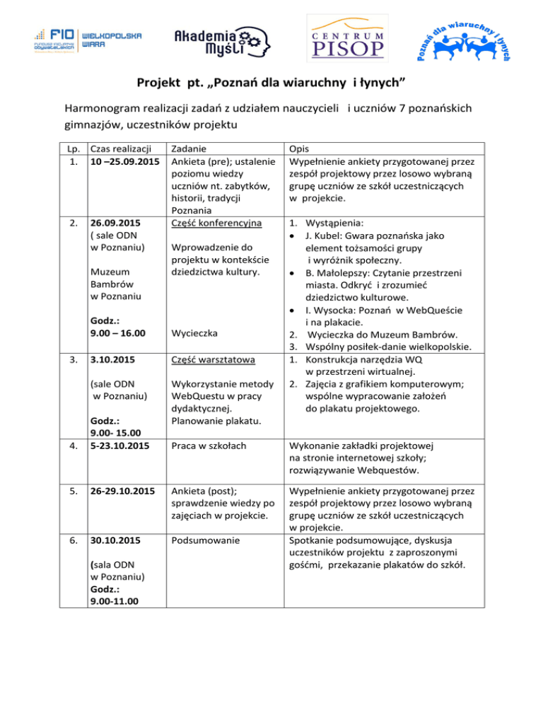 Projekt pt. „Poznań dla wiaruchny i łynych” Harmonogram realizacji zadań z udziałem nauczycieli i uczniów 7 poznańskich gimnazjów, uczestników projektu Lp. Czas realizacji 1. 10 –25.09.2015 2. 26.09.2015 ( sale ODN w Poznaniu) Muzeum Bambrów w Poznaniu 3. Zadanie Ankieta (pre); ustalenie poziomu wiedzy uczniów nt. zabytków, historii, tradycji Poznania Część konferencyjna Wprowadzenie do projektu w kontekście dziedzictwa kultury. Godz.: 9.00 – 16.00 Wycieczka 3.10.2015 Część warsztatowa (sale ODN w Poznaniu) Wykorzystanie metody WebQuestu w pracy dydaktycznej. Planowanie plakatu. 4. Godz.: 9.00- 15.00 5-23.10.2015 5. 6. Opis Wypełnienie ankiety przygotowanej przez zespół projektowy przez losowo wybraną grupę uczniów ze szkół uczestniczących w projekcie. 1. Wystąpienia: J. Kubel: Gwara poznańska jako element tożsamości grupy i wyróżnik społeczny. B. Małolepszy: Czytanie przestrzeni miasta. Odkryć i zrozumieć dziedzictwo kulturowe. I. Wysocka: Poznań w WebQueście i na plakacie. 2. Wycieczka do Muzeum Bambrów. 3. Wspólny posiłek-danie wielkopolskie. 1. Konstrukcja narzędzia WQ w przestrzeni wirtualnej. 2. Zajęcia z grafikiem komputerowym; wspólne wypracowanie założeń do plakatu projektowego. Praca w szkołach Wykonanie zakładki projektowej na stronie internetowej szkoły; rozwiązywanie Webquestów. 26-29.10.2015 Ankieta (post); sprawdzenie wiedzy po zajęciach w projekcie. 30.10.2015 Podsumowanie Wypełnienie ankiety przygotowanej przez zespół projektowy przez losowo wybraną grupę uczniów ze szkół uczestniczących w projekcie. Spotkanie podsumowujące, dyskusja uczestników projektu z zaproszonymi gośćmi, przekazanie plakatów do szkół. (sala ODN w Poznaniu) Godz.: 9.00-11.00