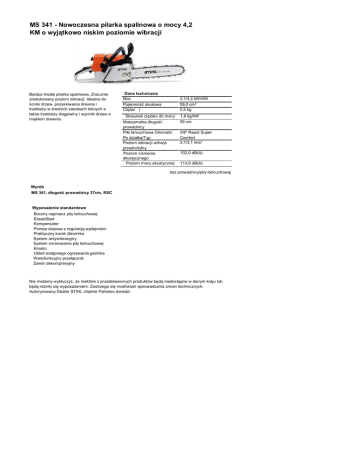 MS 341 - Nowoczesna pilarka spalinowa o mocy 4,2 KM o wyjątkowo niskim poziomie wibracji Bardzo trwała pilarka spalinowa. Znacznie zredukowany poziom wibracji. Idealna do ścinki drzew, pozyskiwania drewna i trzebieży w średnich zasobach leśnych a także trzebieży drągowiny i wycinki drzew o miękkim drewnie. Dane techniczne Moc Pojemność skokowa Ciężar ) 3,1/4,2 kW/KM 59,0 cm³ 5,5 kg Stosunek ciężaru do mocy Maksymalna długość prowadnicy Piła łańcuchowa Oilomatic Po działka/Typ Poziom wibracji uchwyt przedni/tylny Poziom ciśnienia akustycznego Poziom mocy akustycznej 1,8 kg/kW 50 cm 3/8" Rapid Super Comfort 3,1/3,1 m/s² 102,0 dB(A) 113,0 dB(A) bez prowadnicy/piły łańcuchowej Wyrób MS 341, długość prowadnicy 37cm, RSC Wyposażenie standardowe Boczny napinacz piły łańcuchowej ElastoStart Kompensator Pompa olejowa z regulacją wydajności Praktyczny korek zbiornika System antywibracyjny System smarowania piły łańcuchowej Ematic Układ wstępnego ogrzewania gaźnika Wielofunkcyjny przełącznik Zawór dekompresyjny Nie możemy wykluczyć, że niektóre z przedstawionych produktów będą niedostępne w danym kraju lub będą różniły się wyposażeniem. Zastrzega się możliwość wprowadzania zmian technicznych. Autoryzowany Dealer STIHL chętnie Państwu doradzi.