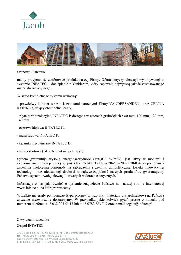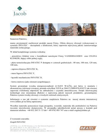Szanowni Państwo, mamy przyjemność zaoferować produkt naszej Firmy. Oferta dotyczy elewacji wykonywanej w systemie INFATEC – docieplanie z klinkierem, który zapewnia najwyższą jakość zastosowanego materiału izolacyjnego. W skład kompletnego systemu wchodzą: - prawdziwy klinkier wraz z kształtkami narożnymi Firmy VANDERSANDEN oraz CELINA KLINKER, dający efekt pełnej cegły, - płyta termoizolacyjna INFATEC P dostępna w czterech grubościach : 80 mm, 100 mm, 120 mm, 140 mm, - zaprawa klejowa INFATEC K, - masa fugowa INFATEC F, - łączniki mechaniczne INFATEC D, - listwa startowa (jako element uzupełniający). System gwarantuje wysoką energooszczędność (λ=0,033 W/m2K), jest łatwy w montażu i ekonomiczny (elewacja wisząca), posiada certyfikat TZUS nr 204/C5/2009/070-034375 jak również zapewnia wieloletnią odporność na zabrudzenia i czynniki atmosferyczne. Dzięki innowacyjnej technologii oraz nieustannej dbałości o najwyższą jakość naszych produktów, gwarantujemy Państwu system trwałej elewacji o trwałych walorach estetycznych. Informacje o nas jak również o systemie znajdziecie Państwo na www.infatec.pl na którą zapraszamy. naszej stronie internetowej Wszelkie materiały pomocnicze (typu prospekty, wzorniki, materiały dla architektów) na Państwa życzenie niezwłocznie dostarczymy. W przypadku jakichkolwiek pytań proszę o kontakt pod numerem telefonu +48 032 205 51 13 lub + 48 0782 883 747 oraz e-mail [email protected]. Z wyrazami szacunku Zespół INFATEC