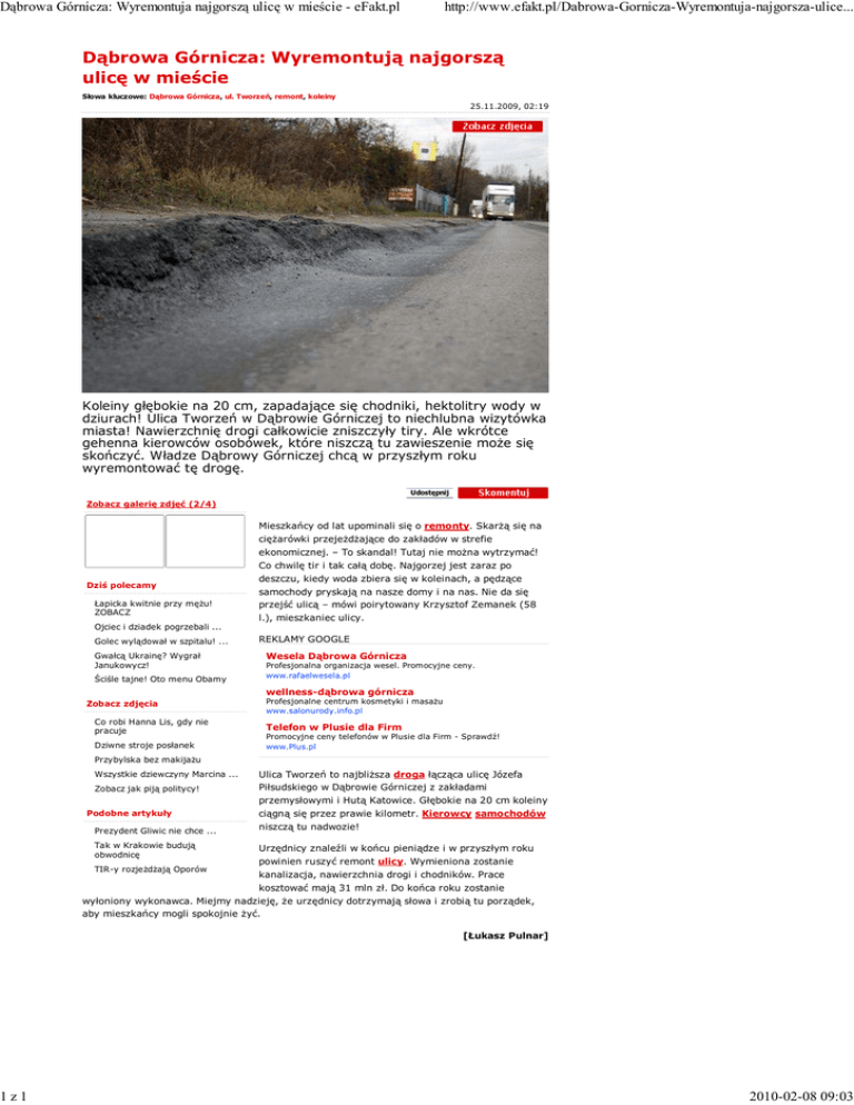 Dąbrowa Górnicza: Wyremontuja najgorszą ulicę w mieście - eFakt.pl 1z1 http://www.efakt.pl/Dabrowa-Gornicza-Wyremontuja-najgorsza-ulice... Dąbrowa Górnicza: Wyremontują najgorszą ulicę w mieście Słowa kluczowe: Dąbrowa Górnicza, ul. Tworzeń, remont, koleiny 25.11.2009, 02:19 Koleiny głębokie na 20 cm, zapadające się chodniki, hektolitry wody w dziurach! Ulica Tworzeń w Dąbrowie Górniczej to niechlubna wizytówka miasta! Nawierzchnię drogi całkowicie zniszczyły tiry. Ale wkrótce gehenna kierowców osobówek, które niszczą tu zawieszenie moŜe się skończyć. Władze Dąbrowy Górniczej chcą w przyszłym roku wyremontować tę drogę. Udostępnij Zobacz galerię zdjęć (2/4) Mieszkańcy od lat upominali się o remonty. SkarŜą się na cięŜarówki przejeŜdŜające do zakładów w strefie Dziś polecamy Łapicka kwitnie przy męŜu! ZOBACZ ekonomicznej. – To skandal! Tutaj nie moŜna wytrzymać! Co chwilę tir i tak całą dobę. Najgorzej jest zaraz po deszczu, kiedy woda zbiera się w koleinach, a pędzące samochody pryskają na nasze domy i na nas. Nie da się przejść ulicą – mówi poirytowany Krzysztof Zemanek (58 l.), mieszkaniec ulicy. Ojciec i dziadek pogrzebali ... Golec wylądował w szpitalu! ... Gwałcą Ukrainę? Wygrał Janukowycz! Ściśle tajne! Oto menu Obamy REKLAMY GOOGLE Wesela Dąbrowa Górnicza Profesjonalna organizacja wesel. Promocyjne ceny. www.rafaelwesela.pl wellness-dąbrowa górnicza Zobacz zdjęcia Co robi Hanna Lis, gdy nie pracuje Dziwne stroje posłanek Profesjonalne centrum kosmetyki i masaŜu www.salonurody.info.pl Telefon w Plusie dla Firm Promocyjne ceny telefonów w Plusie dla Firm - Sprawdź! www.Plus.pl Przybylska bez makijaŜu Wszystkie dziewczyny Marcina ... Zobacz jak piją politycy! Podobne artykuły Prezydent Gliwic nie chce ... Ulica Tworzeń to najbliŜsza droga łącząca ulicę Józefa Piłsudskiego w Dąbrowie Górniczej z zakładami przemysłowymi i Hutą Katowice. Głębokie na 20 cm koleiny ciągną się przez prawie kilometr. Kierowcy samochodów niszczą tu nadwozie! Tak w Krakowie budują obwodnicę Urzędnicy znaleźli w końcu pieniądze i w przyszłym roku powinien ruszyć remont ulicy. Wymieniona zostanie TIR-y rozjeŜdŜają Oporów kanalizacja, nawierzchnia drogi i chodników. Prace kosztować mają 31 mln zł. Do końca roku zostanie wyłoniony wykonawca. Miejmy nadzieję, Ŝe urzędnicy dotrzymają słowa i zrobią tu porządek, aby mieszkańcy mogli spokojnie Ŝyć. [Łukasz Pulnar] 2010-02-08 09:03