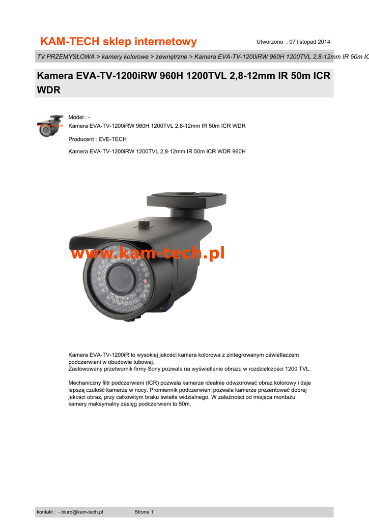 KAM-TECH sklep internetowy Utworzono : 07 listopad 2014 TV PRZEMYSŁOWA > kamery kolorowe > zewnętrzne > Kamera EVA-TV-1200iRW 960H 1200TVL 2,8-12mm IR 50m IC Kamera EVA-TV-1200iRW 960H 1200TVL 2,8-12mm IR 50m ICR WDR Model : Kamera EVA-TV-1200iRW 960H 1200TVL 2,8-12mm IR 50m ICR WDR Producent : EVE-TECH Kamera EVA-TV-1200iRW 1200TVL 2,8-12mm IR 50m ICR WDR 960H Kamera EVA-TV-1200iR to wysokiej jakości kamera kolorowa z zintegrowanym oświetlaczem podczerwieni w obudowie tubowej. Zastowowany przetwornik firmy Sony pozwala na wyświetlenie obrazu w rozdzielczości 1200 TVL. Mechaniczny filtr podczerwieni (ICR) pozwala kamerze idealnie odwzorować obraz kolorowy i daje lepszą czulość kamerze w nocy. Promiennik podczerwieni pozwala kamerze prezentować dobrej jakości obraz, przy całkowitym braku światła widzialnego. W zależności od miejsca montażu kamery maksymalny zasięg podczerwieni to 50m. kontakt : - [email protected] Strona 1 KAM-TECH sklep internetowy Utworzono : 07 listopad 2014 TV PRZEMYSŁOWA > kamery kolorowe > zewnętrzne > Kamera EVA-TV-1200iRW 960H 1200TVL 2,8-12mm IR 50m IC Kamera EVA-TV-1200iRW 960H 1200TVL 2,8-12mm IR 50m ICR WDR kontakt : - [email protected] Strona 2 KAM-TECH sklep internetowy Utworzono : 07 listopad 2014 TV PRZEMYSŁOWA > kamery kolorowe > zewnętrzne > Kamera EVA-TV-1200iRW 960H 1200TVL 2,8-12mm IR 50m IC Kamera EVA-TV-1200iRW 960H 1200TVL 2,8-12mm IR 50m ICR WDR � Zastosowany obiektyw 2,8-12mm pozwala na dokładniejsze ustawienie kąta widzenia kamery, dodatkowo kamera posiada 5-cio krotny bezstratny zoom cyfrowy. Z poziomu menu ekranowego dostępnego w kamerze, możemy również ustawić tryb pracy kamery, strefy prywatności (8stref), strefy detekcji ruchu (4 strefy). WDR (Wide Dynamic Range - Szeroki zakres dynamiki) - działanie tej funkcji w kamerach polega na użyciu odpowiednich algorytmów do analizy naświetlenia obrazu oraz na dynamicznej zmianie wartości niedoświetlonych i prześwietlonych pikseli monitorowanych scen w celu uwidocznienia na obrazie niedoświetlonych elementów. Dzięki temu mamy możliwość dokładnej rejestracji sceny mimo dużego kontrastu. Kamery z funkcją WDR stosujemy zarówno do instalacji zewnętrznych jak i wewnętrznych - wszędzie tam gdzie występuje intensywne źródło światła, które może "oślepiać" kamerę: np. kamera monitorująca pomieszczenie w kierunku dużego oświetlonego okna. Dane techniczne: Model EVA-TV-1200iRW Przetwornik ⅓” Sony IMX238 Liczba efektywnych pikseli PAL: 1305x1069 Rozdzielczość pozioma 1200 TVL Dodatkowe funkcje WDR, 960H Stosunek S/N > 50 dB (AGC wył.) Częstotliwość (MHz) PAL: 18.9375 System skanowania 2:1 Interlace kontakt : - [email protected] Strona 3 KAM-TECH sklep internetowy Utworzono : 07 listopad 2014 TV PRZEMYSŁOWA > kamery kolorowe > zewnętrzne > Kamera EVA-TV-1200iRW 960H 1200TVL 2,8-12mm IR 50m IC Kamera EVA-TV-1200iRW 960H 1200TVL 2,8-12mm IR 50m ICR WDR Minimalne oświetlenie 0 Lux (IR wł.), 0,2 Lux (IR wył.) System synchronizacji wewnętrzny Automatyczna migawka NTSC: 1/60s~1/100,000s, PAL: 1/50s~1/100,000s Filtr IR Tak, mechaniczny Zasięg IR 50m Próg załączania IR poniżej 10 LUX Sterowanie IR Automatyczne, CDS Wyjście Video 1Vpp 75Ω Kontrola wzmocnienia Automatyczna Zasilanie 12V DC (+/- 10%) 650mA (IR wł.) Obiektyw 2,8-12mm Klasa szczelności IP 66 Wymiary 186mm x 101mm x 95mm kontakt : - [email protected] Strona 4 KAM-TECH sklep internetowy Utworzono : 07 listopad 2014 TV PRZEMYSŁOWA > kamery kolorowe > zewnętrzne > Kamera EVA-TV-1200iRW 960H 1200TVL 2,8-12mm IR 50m IC Kamera EVA-TV-1200iRW 960H 1200TVL 2,8-12mm IR 50m ICR WDR Waga 750g Temperatura magazynowania -30°C ~ +60°C RH95% Temperatura pracy -25°C ~ +45°C RH95% Cena : 613,77 zł Brutto ( 499,00 zł Netto) Cena promocyjna : 349,00 zł Brutto ( 283,74 zł Netto) Dostępność: Produkt dostępny w naszym sklepie od 27 sierpień 2014 kontakt : - [email protected] Strona 5