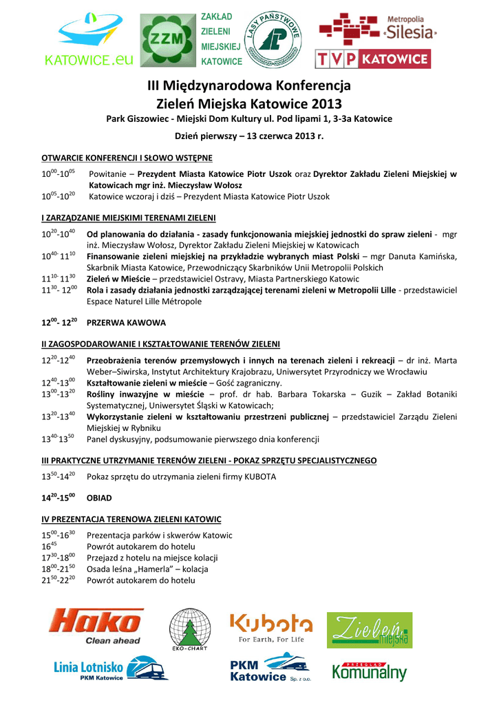 ZAKŁAD ZIELENI MIEJSKIEJ KATOWICE III Międzynarodowa Konferencja Zieleń Miejska Katowice 2013 Park Giszowiec - Miejski Dom Kultury ul. Pod lipami 1, 3-3a Katowice Dzień pierwszy – 13 czerwca 2013 r. OTWARCIE KONFERENCJI I SŁOWO WSTĘPNE 1000-1005 1005-1020 Powitanie – Prezydent Miasta Katowice Piotr Uszok oraz Dyrektor Zakładu Zieleni Miejskiej w Katowicach mgr inż. Mieczysław Wołosz Katowice wczoraj i dziś – Prezydent Miasta Katowice Piotr Uszok I ZARZĄDZANIE MIEJSKIMI TERENAMI ZIELENI 1020-1040 1040- 1110 1110- 1130 1130- 1200 1200- 1220 Od planowania do działania - zasady funkcjonowania miejskiej jednostki do spraw zieleni - mgr inż. Mieczysław Wołosz, Dyrektor Zakładu Zieleni Miejskiej w Katowicach Finansowanie zieleni miejskiej na przykładzie wybranych miast Polski – mgr Danuta Kamińska, Skarbnik Miasta Katowice, Przewodniczący Skarbników Unii Metropolii Polskich Zieleń w Mieście – przedstawiciel Ostravy, Miasta Partnerskiego Katowic Rola i zasady działania jednostki zarządzającej terenami zieleni w Metropolii Lille - przedstawiciel Espace Naturel Lille Métropole PRZERWA KAWOWA II ZAGOSPODAROWANIE I KSZTAŁTOWANIE TERENÓW ZIELENI 1220-1240 1240-1300 1300-1320 1320-1340 1340-1350 Przeobrażenia terenów przemysłowych i innych na terenach zieleni i rekreacji – dr inż. Marta Weber–Siwirska, Instytut Architektury Krajobrazu, Uniwersytet Przyrodniczy we Wrocławiu Kształtowanie zieleni w mieście – Gość zagraniczny. Rośliny inwazyjne w mieście – prof. dr hab. Barbara Tokarska – Guzik – Zakład Botaniki Systematycznej, Uniwersytet Śląski w Katowicach; Wykorzystanie zieleni w kształtowaniu przestrzeni publicznej – przedstawiciel Zarządu Zieleni Miejskiej w Rybniku Panel dyskusyjny, podsumowanie pierwszego dnia konferencji III PRAKTYCZNE UTRZYMANIE TERENÓW ZIELENI - POKAZ SPRZĘTU SPECJALISTYCZNEGO 1350-1420 Pokaz sprzętu do utrzymania zieleni firmy KUBOTA 1420-1500 OBIAD IV PREZENTACJA TERENOWA ZIELENI KATOWIC 1500-1630 1645 1730-1800 1800-2150 2150-2220 Prezentacja parków i skwerów Katowic Powrót autokarem do hotelu Przejazd z hotelu na miejsce kolacji Osada leśna „Hamerla” – kolacja Powrót autokarem do hotelu ZAKŁAD ZIELENI MIEJSKIEJ KATOWICE Dzień drugi – 14 czerwca 2013 r. OTWARCIE DRUGIEGO DNIA KONFERENCJI 1000-1010 Powitanie gości i otwarcie 2-go dnia obrad – Mieczysław Wołosz, ZZM V DZIAŁANIA EDUKACJYJNE NA RZECZ OCHRONY TERENÓW PRZYRODNICZYCH (TERENÓW ZIELENI) 1010-1030 Edukacja ekologiczna na terenach leśnych – mgr inż. Bolesław Bobrzyk, Nadleśnictwo Katowice 1030-1100 Wielokierunkowe działania edukacyjno-promocyjne terenów zieleni na przykładzie Metropolii Lille – przedstawiciel Espace Naturel Lille Métropole 00 25 11 -11 Doświadczenia programu edukacyjnego pt. „Jestem sąsiadem parku” – mgr inż. Grzegorz Okołów Główny specjalista ds. ochrony przyrody i edukacji, Kampinowski Park Narodowy Izabelin 1125- 1145 PRZERWA KAWOWA VI DRZEWO W MIEŚCIE – KORZYŚCI I OBOWIĄZKI 1145-1210 Udział roślinności drzewiastej w komponowaniu przestrzeni miasta - funkcja i forma - dr inż. arch. kraj. Beata Fortuna-Antoszkiewicz Katedra Architektury Krajobrazu, Wydział Ogrodnictwa i Architektury Krajobrazu, Szkoła Główna Gospodarstwa Wiejskiego Warszawa; 1210-1235 Ochrona drzew w kontekście jakości życia w mieście - dr Janina Szczepańska, rzeczoznawca Towarzystwa Urbanistów Polskich w zakresie środowiska przyrodniczego w planowaniu przestrzennym; 1235-1300 Dobór gatunkowy i pielęgnacja zieleni przyulicznej - prof. dr hab. inż. Jacek Borowski, Katedra Ochrony Środowiska, Szkoła Główna Gospodarstwa Wiejskiego Warszawa, Prezes Polskiego Towarzystwa Dendrologicznego; 1300-1320 Pytania i dyskusja VII WYKORZYSTANIE TECHNIKI W UTRZYMANIU ZIELENI W MIEŚCIE 1320 – 1340 Pokaz sprzętu do utrzymania terenów zieleni miejskiej firmy HAKO 1340- 1400 Podsumowanie i zakończenie konferencji 1400 OBIAD Organizator zastrzega sobie prawo do zmian programu Osoby do kontaktu: Magdalena Biela tel. 696-471-677 Lech Marek tel. 509-100-025 Relacja z Konferencji 2012 wraz z wystąpieniami na stronie: http://www.zielenkatowice.pl