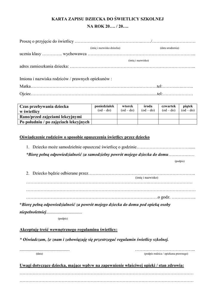KARTA ZAPISU DZIECKA DO ŚWIETLICY SZKOLNEJ NA ROK 20…. / 20…. Proszę o przyjęcie do świetlicy ………………………………………..……/………………………… (imię i nazwisko dziecka) (data urodzenia) ucznia klasy ………….. wychowawca ………………………………………………………………... (imię i nazwisko) adres zamieszkania dziecka: …………………………………………………………………………... Imiona i nazwiska rodziców / prawnych opiekunów : Matka……………………………………………………………………………tel:……….….…….. Ojciec…………………………………………....................................................tel:………………… Czas przebywania dziecka w świetlicy Rano/przed zajęciami lekcyjnymi Po południu / po zajęciach lekcyjnych poniedziałek (od – do) wtorek (od – do) środa (od – do) czwartek (od – do) piątek (od – do) Oświadczenie rodziców o sposobie opuszczenia świetlicy przez dziecko 1. Dziecko może samodzielnie opuszczać świetlicę o godzinie………………………………...... *Biorę pełną odpowiedzialność za samodzielny powrót mojego dziecka do domu……………… (podpis) 2. Dziecko będzie odbierane przez……………………………………………………………….. (imię i nazwisko) ………………………………………………………………………….………………………… ……………………………………………………………………………………………………… ……………………………………………………………………………….o godz. …………….. *Biorę pełną odpowiedzialność za powrót mojego dziecka do domu pod opieką osoby niepełnoletniej................................. (podpis) Akceptuję treść wewnętrznego regulaminu świetlicy: * Oświadczam, że znam i zobowiązuję się przestrzegać regulamin świetlicy szkolnej. .............................................. (data) …………………………………... (podpis rodzica / opiekuna prawnego) Uwagi dotyczące dziecka, mające wpływ na zapewnienie właściwej opieki / stan zdrowia: ………………………………………………………………………………………………………… ………………………………………………………………………………………………………… Zaświadczenie o zatrudnieniu rodziców / prawnych opiekunów Miejsce pracy matki / tel : ………………………………………………………………………………………………………… ………………………………………………………………………………………………………… (pieczątka zakładu pracy i podpis osoby uprawnionej) Miejsce pracy ojca / tel : ………………………………………………………………………………………………………… ………………………………………………………………………………………………………… (pieczątka zakładu pracy i podpis osoby uprawnionej) * Rodzice / prawni opiekunowie są zobowiązani do niezwłocznego powiadomienia wychowawców świetlicy o zmianie danych, zawartych w karcie zapisu dziecka do świetlicy. * Wypisanie dziecka ze świetlicy szkolnej jest możliwe po przedstawieniu pisemnego oświadczenia rodziców, z uwzględnieniem daty wypisu.
