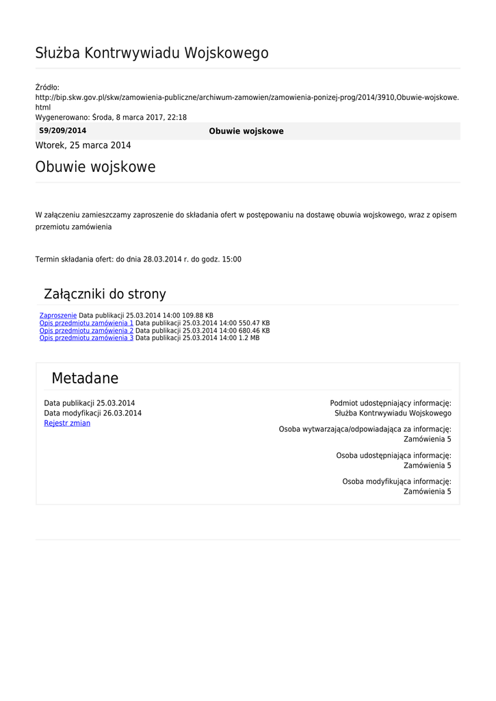 Służba Kontrwywiadu Wojskowego Źródło: http://bip.skw.gov.pl/skw/zamowienia-publiczne/archiwum-zamowien/zamowienia-ponizej-prog/2014/3910,Obuwie-wojskowe. html Wygenerowano: Środa, 8 marca 2017, 22:18 S9/209/2014 Obuwie wojskowe Wtorek, 25 marca 2014 Obuwie wojskowe W załączeniu zamieszczamy zaproszenie do składania ofert w postępowaniu na dostawę obuwia wojskowego, wraz z opisem przemiotu zamówienia Termin składania ofert: do dnia 28.03.2014 r. do godz. 15:00 Załączniki do strony Zaproszenie Data publikacji 25.03.2014 14:00 109.88 KB Opis przedmiotu zamówienia 1 Data publikacji 25.03.2014 14:00 550.47 KB Opis przedmiotu zamówienia 2 Data publikacji 25.03.2014 14:00 680.46 KB Opis przedmiotu zamówienia 3 Data publikacji 25.03.2014 14:00 1.2 MB Metadane Data publikacji 25.03.2014 Data modyfikacji 26.03.2014 Rejestr zmian Podmiot udostępniający informację: Służba Kontrwywiadu Wojskowego Osoba wytwarzająca/odpowiadająca za informację: Zamówienia 5 Osoba udostępniająca informację: Zamówienia 5 Osoba modyfikująca informację: Zamówienia 5