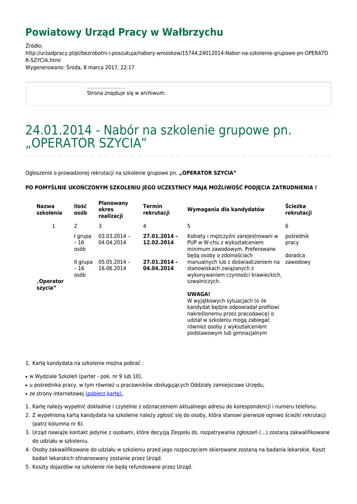 Powiatowy Urząd Pracy w Wałbrzychu Źródło: http://urzadpracy.pl/pl/bezrobotni-i-poszukuja/nabory-wnioskow/15744,24012014-Nabor-na-szkolenie-grupowe-pn-OPERATO R-SZYCIA.html Wygenerowano: Środa, 8 marca 2017, 22:17 Strona znajduje się w archiwum. 24.01.2014 - Nabór na szkolenie grupowe pn. „OPERATOR SZYCIA” Ogłoszenie o prowadzonej rekrutacji na szkolenie grupowe pn. „OPERATOR SZYCIA” PO POMYŚLNIE UKOŃCZONYM SZKOLENIU JEGO UCZESTNICY MAJĄ MOŻLIWOŚĆ PODJĘCIA ZATRUDNIENIA ! Nazwa szkolenia 1 Ilość osób Planowany okres realizacji Termin rekrutacji Wymagania dla kandydatów Ścieżka rekrutacji 2 3 4 5 6 I grupa – 16 osób 03.03.2014 – 04.04.2014 27.01.2014 – 12.02.2014 pośrednik pracy II grupa – 16 osób 05.05.2014 – 16.06.2014 27.01.2014 – 04.04.2014 Kobiety i mężczyźni zarejestrowani w PUP w W-chu z wykształceniem minimum zawodowym. Preferowane będą osoby o zdolnościach manualnych lub z doświadczeniem na stanowiskach związanych z wykonywaniem czynności krawieckich, szwalniczych. „Operator szycia” doradca zawodowy UWAGA! W wyjątkowych sytuacjach (o ile kandydat będzie odpowiadał profilowi nakreślonemu przez pracodawcę) o udział w szkoleniu mogą zabiegać również osoby z wykształceniem podstawowym lub gimnazjalnym 1. Kartę kandydata na szkolenie można pobrać : ● w Wydziale Szkoleń (parter - pok. nr 9 lub 10), ● u pośrednika pracy, w tym również u pracowników obsługujących Oddziały zamiejscowe Urzędu, ● ze strony internetowej (pobierz kartę). 1. Kartę należy wypełnić dokładnie i czytelnie z odznaczeniem aktualnego adresu do korespondencji i numeru telefonu. 2. Z wypełnioną kartą kandydata na szkolenie należy zgłosić się do osoby, która stanowi pierwsze ogniwo ścieżki rekrutacji (patrz kolumna nr 6). 3. Urząd nawiąże kontakt jedynie z osobami, które decyzją Zespołu ds. rozpatrywania zgłoszeń (…) zostaną zakwalifikowane do udziału w szkoleniu. 4. Osoby zakwalifikowane do udziału w szkoleniu przed jego rozpoczęciem skierowane zostaną na badania lekarskie. Koszt badań lekarskich sfinansowany zostanie przez Urząd. 5. Koszty dojazdów na szkolenie nie będą refundowane przez Urząd. 6. Wykonawca usługi szkoleniowej zapewnia uczestnikom materiały dydaktyczne jak również odzież roboczą. 7. Szkolenie obejmuje 195 jednostek dydaktycznych, z czego 160 godzin stanowią zajęcia praktyczne zrealizowane w warunkach naturalnego środowiska pracy. Metryka strony Data publikacji 24.01.2014 Data modyfikacji 23.06.2014Rejestr zmian Osoba publikująca: Beata Uhryn Zespół ds. Analiz, Statystyki i Zamówień Publicznych Autor: Magdalena Oleś Liczba wejść: 614 Drukuj Generuj PDF Powiadom znajomego Wstecz