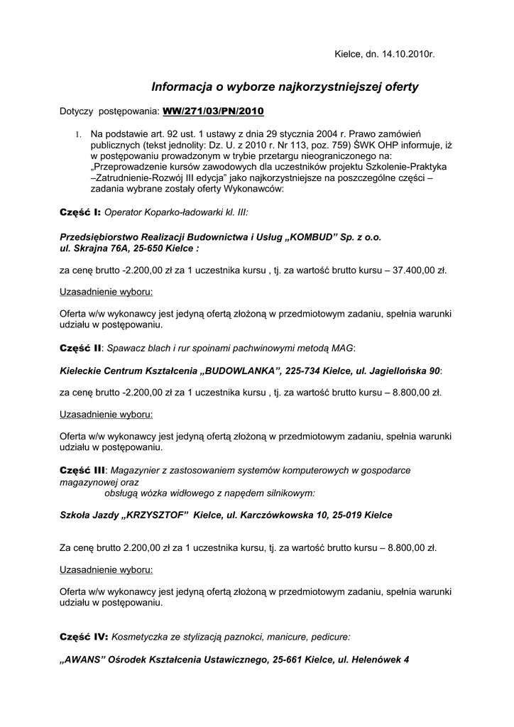 Kielce, dn. 14.10.2010r. Informacja o wyborze najkorzystniejszej oferty Dotyczy postępowania: WW/271/03/PN/2010 1. Na podstawie art. 92 ust. 1 ustawy z dnia 29 stycznia 2004 r. Prawo zamówień publicznych (tekst jednolity: Dz. U. z 2010 r. Nr 113, poz. 759) ŚWK OHP informuje, iż w postępowaniu prowadzonym w trybie przetargu nieograniczonego na: „Przeprowadzenie kursów zawodowych dla uczestników projektu Szkolenie-Praktyka –Zatrudnienie-Rozwój III edycja” jako najkorzystniejsze na poszczególne części – zadania wybrane zostały oferty Wykonawców: Część I: Operator Koparko-ładowarki kl. III: Przedsiębiorstwo Realizacji Budownictwa i Usług „KOMBUD” Sp. z o.o. ul. Skrajna 76A, 25-650 Kielce : za cenę brutto -2.200,00 zł za 1 uczestnika kursu , tj. za wartość brutto kursu – 37.400,00 zł. Uzasadnienie wyboru: Oferta w/w wykonawcy jest jedyną ofertą złożoną w przedmiotowym zadaniu, spełnia warunki udziału w postępowaniu. Część II: Spawacz blach i rur spoinami pachwinowymi metodą MAG: Kieleckie Centrum Kształcenia „BUDOWLANKA”, 225-734 Kielce, ul. Jagiellońska 90: za cenę brutto -2.200,00 zł za 1 uczestnika kursu , tj. za wartość brutto kursu – 8.800,00 zł. Uzasadnienie wyboru: Oferta w/w wykonawcy jest jedyną ofertą złożoną w przedmiotowym zadaniu, spełnia warunki udziału w postępowaniu. Część III: Magazynier z zastosowaniem systemów komputerowych w gospodarce magazynowej oraz obsługą wózka widłowego z napędem silnikowym: Szkoła Jazdy „KRZYSZTOF” Kielce, ul. Karczówkowska 10, 25-019 Kielce Za cenę brutto 2.200,00 zł za 1 uczestnika kursu, tj. za wartość brutto kursu – 8.800,00 zł. Uzasadnienie wyboru: Oferta w/w wykonawcy jest jedyną ofertą złożoną w przedmiotowym zadaniu, spełnia warunki udziału w postępowaniu. Część IV: Kosmetyczka ze stylizacją paznokci, manicure, pedicure: „AWANS” Ośrodek Kształcenia Ustawicznego, 25-661 Kielce, ul. Helenówek 4 za cenę brutto – 2.200,00 zł za 1 uczestnika kursu, tj. za wartość brutto kursu – 13.200,00 zł. Uzasadnienie wyboru: Jedynym kryterium oceny ofert była cena – 100%. Wykonawca złożył najtańszą ofertę, która spełnia warunki udziału w postępowaniu i dlatego też, oferta tego Wykonawcy została wybrana jako najkorzystniejsza. Wykaz Wykonawców, którzy złożyli ważne oferty w tej części postępowania i otrzymali w kryterium oceny ofert następującą ilość punktów: Numer oferty 3. 4. 5. Nazwa Wykonawcy CENTRUM NAUKI I BIZNESU „ŻAK” Sp. z o.o. 90-361 Łódź, ul. Piotrkowska 278 Szkoła w Kielcach, 25-304 Kielce, ul. Duża 8 Ośrodek Kształcenia Ustawicznego „AWANS” w Skarżysku-Kamiennej, ul. Sokola 38 „AWANS” Ośrodek Kształcenia Ustawicznego, 25-661 Kielce, Helenówek 4 Liczba pkt w kryterium „Cena” 85,14 92,44 100,00 Część V: Kosmetyczka z elementami wizażu: „AWANS” Ośrodek Kształcenia Ustawicznego, 25-661 Kielce, ul. Helenówek 4 za cenę brutto – 2.200,00 zł za 1 uczestnika kursu, tj. za wartość brutto kursu – 13.200,00 zł. Uzasadnienie wyboru: Jedynym kryterium oceny ofert była cena – 100%. Wykonawca złożył najtańszą ofertę, która spełnia warunki udziału w postępowaniu i dlatego też, oferta tego Wykonawcy została wybrana jako najkorzystniejsza. Wykaz Wykonawców, którzy złożyli ważne oferty w tej części postępowania i otrzymali w kryterium oceny ofert następującą ilość punktów: Numer oferty 3. 4. 5. Nazwa Wykonawcy CENTRUM NAUKI I BIZNESU „ŻAK” Sp. z o.o. 90-361 Łódź, ul. Piotrkowska 278 Szkoła w Kielcach, 25-304 Kielce, ul. Duża 8 Ośrodek Kształcenia Ustawicznego „AWANS” w Skarżysku-Kamiennej, ul. Sokola 38 „AWANS” Ośrodek Kształcenia Liczba pkt w kryterium „Cena” 80,00 92,44 100,00 Ustawicznego, 25-661 Kielce, Helenówek 4 2. Informacja o ofertach odrzuconych wraz z uzasadnieniem: W prowadzonym postępowaniu nie odrzucono żadnych ofert. 3. Informacja o Wykonawcach wykluczonych z postępowania wraz z uzasadnieniem: W prowadzonym postępowaniu nie wykluczono żadnego z Wykonawców. 4. Informacja o terminie, po którego upływie umowa w sprawie zamówienia publicznego może być zawarta: Zgodnie z art. 94 ust. 2 pkt 3 ppkt a Zamawiający może zawrzeć umowę w sprawie zamówienia publicznego w terminie krótszym niż 5 dni od dnia przesłania zawiadomienia o wyborze najkorzystniejszej oferty, gdyż w przedmiotowym postępowaniu nie wykluczono żadnego z Wykonawców i nie odrzucono żadnej oferty. Sporządziła: ZATWIERDZIŁ: Elżbieta Zagnińska Specjalista ds. zam. publicznych Po otrzymaniu w/w informacji faxem proszę o odwrotne potwierdzenie otrzymania tej informacji na nasz fax: (41) 343-13-55. Otrzymują: 1. Wykonawcy: I. II. III. IV. V. VI. Przedsiębiorstwo Realizacji Budownictwa i Usług „KOMBUD” Sp. z o.o. ul. Skrajna 76A, 25-650 Kielce (fax: (41) 346-03-10) Kieleckie Centrum Kształcenia „BUDOWLANKA” ul. Jagiellońska 90, 25-734 Kielce (fax: (41) 34-616-00) CENTRUM NAUKI I BIZNESU „ŻAK” Sp. z o.o. 90-361 Łódź, ul. Piotrkowska 278 Szkoła w Kielcach 25-304 Kielce, ul. Duża 8 (fax: (41) 343-31-05) Ośrodek Kształcenia Ustawicznego „AWANS” w Skarżysku –Kamiennej, ul. Sokola 38 (fax: (41) 345-28-32) „AWANS” Ośrodek Kształcenia Ustawicznego 25-661 Kielce, ul. Helenówek 4 (fax: (41) 345-28-32. Szkoła Jazdy „Krzysztof” Kielce, ul. Karczówkowska 10, 25-019 Kielce.(fax: ( 41) 361-51-02) 2. Informacja została zamieszczona na stronie internetowej Zamawiającego i na tablicy ogłoszeń w siedzibie Zamawiającego. 3. a/a.