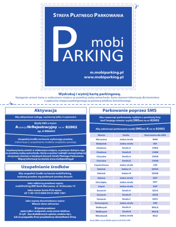 P mobi ARKING m.mobiparking.pl www.mobiparking.pl Wydrukuj i wytnij kartę parkingową. Następnie umieść kartę w widocznym miejscu za przednią szybą samochodu. Karta stanowi informację dla kontrolera o opłaceniu miejsca parkingowego za pomocą telefonu komórkowego. Aktywacja Parkowanie poprzez SMS Aby aktywować usługę, wystarczą tylko 3 czynności: Aby rozpocząć parkowanie, wybierz z poniższej listy kod Twojego miasta i wyślij SMSem na nr 82002 Wyślij SMS o treści: A(spacja)NrRejestracyjny na nr 82002 np. A WB6693 Aby zakończyć parkowanie wyślij SMSem: K na nr 82002 Miasto Strefa Kod miasta dla SMS Warszawa Jedna strefa WAR Białystok Jedna strefa BIA Chełmno Strefa A CHEA Chełmno Strefa B CHEB Chorzów Strefa A CHOA Chorzów Strefa B CHOB Uzupełnianie środków Częstochowa Jedna strefa CZE Gdańsk Sektor A GDAA Aby uzupełnić środki na koncie mobiParking, wykonaj przelew wg podanych poniżej danych: Gdańsk Sektor B GDAB Gdynia Jedna strefa GDY Jako odbiorcę przelewu wpisz: mobiParking BRE Bank Warszawa, ul. Królewska 14 Ostrołęka Jedna strefa OST Sopot Jedna strefa SOP Jako numer konta PLN wpisz: 20 1140 1010 0000 9419 3900 1001 Szczecin Strefa A SZCA Szczecin Strefa B SZCB Szczecin Strefa C SZCC Świnoujście Jedna strefa SWI Wałbrzych Strefa A WALA Wałbrzych Strefa B WALB Włocławek Jedna strefa WLO Uzupełnij środki na koncie wykonując przelew (informacje o uzupełnianiu środków znajdziesz poniżej). Uzyskaną kartę umieść w widocznym miejscu, w prawym dolnym rogu za przednią szybą samochodu. Kartę w postaci naklejki samoprzylepnej otrzymasz również w lokalnych biurach Strefy Płatnego Parkowania. Więcej informacji na stronie www.mobiparking.pl Jako nazwę zleceniodawcy wpisz: Własne dane adresowe W tytule przelewu: wpisz tylko i wyłącznie: swój numer telefonu (9 cyfr - bez dodatkowych opisów, znaków itp.), Parkowanie poprzez NUMERY SPECJALNE Rozpoczęcie lub zakończenie parkowania (nie dotyczy parkowania czasowego). Miasto Strefa Kod miasta Warszawa Jedna strefa 221 Dla klientów Orange, Plus, Play Białystok Jedna strefa 851 *159*kod_strefy# - START/STOP Chełmno Strefa A 561 Chełmno Strefa B 562 Chorzów Strefa A 321 Chorzów Strefa B 322 Częstochowa Jedna strefa 341 Gdańsk Sektor A 584 Gdańsk Sektor B 585 Gdynia Jedna strefa 582 Ostrołęka Jedna strefa 291 Sopot Jedna strefa 583 Szczecin Strefa A 911 Szczecin Strefa B 912 Szczecin Strefa C 913 Świnoujście Jedna strefa 914 Należy połączyć się z numerem: Wałbrzych Strefa A 741 *71559 lub 223121500 Wałbrzych Strefa B 742 Włocławek Jedna strefa 541 parkowania pierwszego na liście samochodu w wybranej strefie *159*kod_strefy*numer_samochodu# - START/STOP parkowania wybranego samochodu w wybranej strefie Dla klientów pozostałych sieci (np. T-Mobile): *71559*kod_strefy - START/STOP parkowania pierwszego samochodu na liście w wybranej strefie *71559*kod_strefy*numer_samochodu - START/STOP parkowania wybranego samochodu w wybranej strefie Menu głosowe serwisu mobiParking Po uzyskaniu połączenia postępuj zgodnie z komendami głosowymi. Koszt: *159# - bezpłatnie, menu głosowe *71559 - 1,23 PLN brutto/min., menu głosowe 223121500 - opłata zgodnie z cennikiem operatora, z którego wykonywane jest połączenie. Parkowanie poprzez APLIKACJĘ MOBILNĄ Aplikacja mobilna dzięki gotowym komendom, pozwala na korzystanie z pełnej funkcjonalności mobiParking. Aplikację mobiParking można pobrać ze strony m.mobiparking.pl lub wysyłając wiadomość SMS o treści „MOBI” (opłata 0,25 PLN brutto) na nr 82002. Pobierz aplikację, zainstaluj i korzystaj dzięki niej z mobiParking np. w poniższy sposób: 1. Menu główne aplikacji 2. Rozpoczęcie parkowania: 3. Zakończenie parkowania: Po zalogowaniu się, wybierz odpowiedni przycisk odpowiadający komendzie. Z menu aplikacji wybierz przycisk START. Nastepnie z listy pojazdów wybierz nr rejestracyjny pojazdu który chcesz zaparkować. W kolejnym kroku Wpisz swój PIN zapamiętany w usłudze i zatwierdź. Po chwili na ekranie telefonu otrzymasz potwierdzenie: Z menu aplikacji wybierz przycisk STOP. Następnie z listy aktywnych parkowań, wybierz aktywne parkowanie (nr rej. aktualnie zaparkowanego pojazdu) które chcesz zakończyć. W kolejnym kroku Wpisz swój PIN i zatwierdź. Po chwili na ekranie telefonu otrzymasz potwierdzenie: Android iPhone Windows Mobile BlackBerry Inne telefony W przypadku korzystania z transmisji w sieci GSM opłaty zgodnie z aktualnym cennikiem i taryfą operatora, z którego wykonywana jest połączenie w ramach transmisji danych.