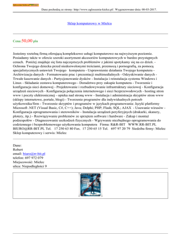 Dane pochodzą ze strony: http://www.ogloszenia-kielce.pl/. Wygenerowano dnia: 08-03-2017. Sklep komputerowy w Mielcu Cena:50,00 pln Jesteśmy rzetelną firmą oferującą kompleksowe usługi komputerowe na najwyższym poziomie. Posiadamy także w ofercie szeroki asortyment akcesoriów komputerowych w bardzo przystępnych cenach. Poniżej znajduje się lista najczęstszych problemów z jakimi spotykamy się na co dzień. Ochrona Twojego dziecka przed niedozwolonymi treściami, przemocą i pornografią, za pomocą specjalistycznych ustawień Twojego komputera - Usprawnienie działania Twojego komputera Archiwizacja danych - Formatowanie prac i prezentacji multimedialnych - Odzyskiwanie danych Trwałe kasowanie danych - Partycjonowanie dysków - Instalacja i reinstalacja systemu Windows i Linux - Składanie zestawu komputerowego - Doradztwo przy zakupie komputera - Tworzenie i konfiguracja sieci domowej - Projektowanie i rozbudowywanie infrastruktury sieciowej - Konfiguracja urządzeń sieciowych - Konfiguracja połączenia internetowego i sieci bezprzewodowych - hosting stron www i poczty elektronicznej - opieka nad stroną www - Instalacja i administracja skryptów stron www (sklepy internetowe, portale, blogi) - Tworzenie programów dla indywidualnych potrzeb użytkownika/firm - Tworzenie skryptów i programów w językach programowania: Języki platformy Microsoft .NET (Visual Basic, C#, C++); Java; Delphi; PHP; Flash; SQL; AJAX - Usuwanie wirusów Konfiguracja oprogramowania i sterowników - Instalacja urządzeń peryferyjnych (drukarki, skanery, plotery, itp.) - Rozwiązywanie problemów ze sprzętem software i hardware - Zakup i montaż podzespołów - Diagnozowanie uszkodzeń fizycznych - Wgrywanie niezbędnego oprogramowania do codziennego i bezproblemowego użytkowania komputera Firma: R&R-BIT WWW.RR-BIT.PL [email protected] Tel. 17 250 63 80 Fax. 17 250 65 15 Tel. 697 97 20 79 Siedziba firmy: Mielec Sklep komputerowy i serwis: Mielec Dane: Robert email: [email protected] telefon: 697 972 079 Miejscowość: Mielec ulica: Niepodległości 9