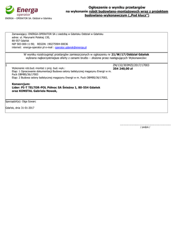 Ogłoszenie o wyniku przetargów ENERGA – OPERATOR SA. Oddział w Gdańsku na wykonanie robót budowlano-montażowych wraz z projektem budowlano-wykonawczym („Pod klucz”) Zamawiający: ENERGA-OPERATOR SA z siedzibą w Gdańsku Oddział w Gdańsku adres: ul. Marynarki Polskiej 130, 80-557 Gdańsk NIP 583-000-11-90; REGON: 190275904-00036 internet: energa-operator.pl e-mail : [email protected] W wyniku rozstrzygnięć przetargów zamieszczonych w ogłoszeniu nr 21/W/17/Oddział Gdańsk wybrano najkorzystniejsze oferty z cenami brutto – złożone przez następujących Wykonawców: 1 ZN/132/303MZI/2017/17003 Wykonanie rob.bud.-montaż z proj. bud.-wyk.: 354 240,00 zł Etap: 1 Opracowanie dokumentacji Budowa osłony balistycznej magazynu Energii w m. Puck OBMBS/36/17003 Etap: 2 Budowa osłony balistycznej magazynu Energii w m. Puck OBMBS/36/17003, Konsorcjum: Lider: PI-T TELTOR-POL Północ SA Śnieżna 1, 80-554 Gdańsk oraz KONSTAL Gabriela Nowak, Sporządził(a): Olga Szwarc Gdańsk, dnia 31-01-2017 ......................................................................... / podpis /