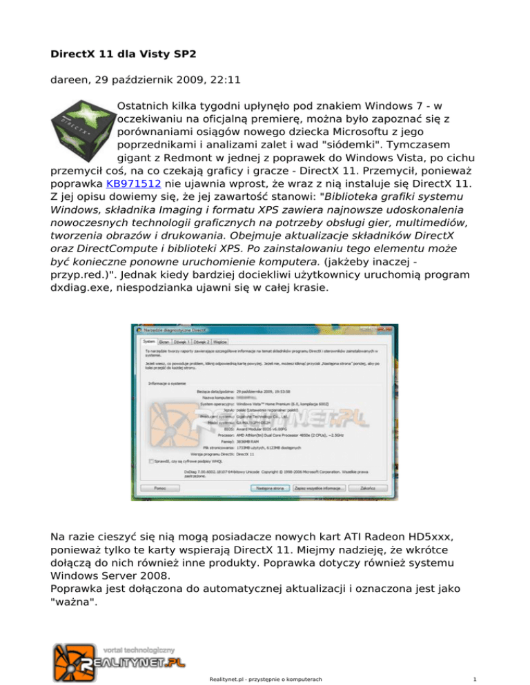 DirectX 11 dla Visty SP2 dareen, 29 październik 2009, 22:11 Ostatnich kilka tygodni upłynęło pod znakiem Windows 7 - w oczekiwaniu na oficjalną premierę, można było zapoznać się z porównaniami osiągów nowego dziecka Microsoftu z jego poprzednikami i analizami zalet i wad "siódemki". Tymczasem gigant z Redmont w jednej z poprawek do Windows Vista, po cichu przemycił coś, na co czekają graficy i gracze - DirectX 11. Przemycił, ponieważ poprawka KB971512 nie ujawnia wprost, że wraz z nią instaluje się DirectX 11. Z jej opisu dowiemy się, że jej zawartość stanowi: "Biblioteka grafiki systemu Windows, składnika Imaging i formatu XPS zawiera najnowsze udoskonalenia nowoczesnych technologii graficznych na potrzeby obsługi gier, multimediów, tworzenia obrazów i drukowania. Obejmuje aktualizacje składników DirectX oraz DirectCompute i biblioteki XPS. Po zainstalowaniu tego elementu może być konieczne ponowne uruchomienie komputera. (jakżeby inaczej przyp.red.)". Jednak kiedy bardziej dociekliwi użytkownicy uruchomią program dxdiag.exe, niespodzianka ujawni się w całej krasie. Na razie cieszyć się nią mogą posiadacze nowych kart ATI Radeon HD5xxx, ponieważ tylko te karty wspierają DirectX 11. Miejmy nadzieję, że wkrótce dołączą do nich również inne produkty. Poprawka dotyczy również systemu Windows Server 2008. Poprawka jest dołączona do automatycznej aktualizacji i oznaczona jest jako "ważna". Realitynet.pl - przystępnie o komputerach 1