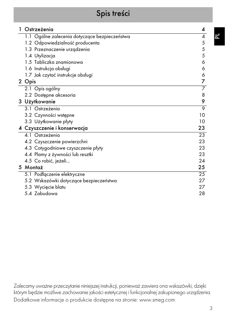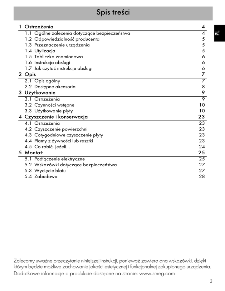 Spis treści 1.1 1.2 1.3 1.4 1.5 1.6 1.7 Ogólne zalecenia dotyczące bezpieczeństwa Odpowiedzialność producenta Przeznaczenie urządzenia Utylizacja Tabliczka znamionowa Instrukcja obsługi Jak czytać instrukcje obsługi 2 Opis 2.1 Opis ogólny 2.2 Dostępne akcesoria 3 Użytkowanie 3.1 Ostrzeżenia 3.2 Czynności wstępne 3.3 Użytkowanie płyty 4 Czyszczenie i konserwacja 4.1 4.2 4.3 4.4 4.5 Ostrzeżenia Czyszczenie powierzchni Cotygodniowe czyszczenie płyty Plamy z żywności lub resztki Co robić, jeżeli... 5 Montaż 5.1 5.2 5.3 5.4 Podłączenie elektryczne Wskazówki dotyczące bezpieczeństwa Wycięcie blatu Zabudowa 4 PL 1 Ostrzeżenia 4 5 5 5 6 6 6 7 7 8 9 9 10 10 23 23 23 23 23 24 25 25 27 27 28 Zalecamy uważne przeczytanie niniejszej instrukcji, ponieważ zawiera ona wskazówki, dzięki którym będzie możliwe zachowanie jakości estetycznej i funkcjonalnej zakupionego urządzenia. Dodatkowe informacje o produkcie dostępne na stronie: www.smeg.com 3 Ostrzeżenia 1 Ostrzeżenia 1.1 Ogólne zalecenia dotyczące bezpieczeństwa Szkody powstałe na osobach • Urządzenie i jego elementy są bardzo gorące podczas użytkowania. • Podczas użytkowania nie należy dotykać elementów grzejnych. • Dzieci poniżej 8 roku życia nie powinny przebywać w pobliżu urządzenia bez opieki osoby dorosłej. • Urządzenie nie służy do zabawy. • Podczas użytkowania nie kłaść na urządzeniu metalowych przedmiotów takich, jak widelce, łyżki i pokrywki. • Po zakończeniu użytkowania wyłączyć urządzenie. • Nie należy nigdy próbować gasić płomienia lub pożaru wodą: wyłączyć urządzenie i nakryć płomień pokrywą lub ognioodporną narzutą. • Czynności związane z czyszczeniem i konserwacją nie powinny być wykonywane przez dzieci bez nadzoru. • Montaż i naprawy powinny być wykonywane przez wykwalifikowany personel zgodnie z obowiązującymi przepisami. 4 • Nie wprowadzać zmian na urządzeniu. • Nie wkładać ostro zakończonych metalowych przedmiotów (sztućce lub przyrządy) do szczelin. • Nigdy nie należy próbować naprawiać urządzenia samodzielnie lub bez pomocy wykwalifikowanego specjalisty. • Jeśli przewód zasilania elektrycznego jest uszkodzony, należy natychmiast skontaktować się z serwisem technicznym, który dokona jego wymiany. Uszkodzenie urządzenia • Nie stosować ściernych lub agresywnych detergentów (np. produktów z granulkami, odplamiaczy i metalowych gąbek) na częściach szklanych. • Ewentualnie używać drewnianych lub plastikowych narzędzi. • Nie siadać na urządzeniu. • Nie stosować pary do czyszczenia urządzenia. • Nie zatykać otworów, szczelin wentylacyjnych i odprowadzających ciepło. • Nie zostawiać urządzenia bez nadzoru podczas przyrządzania potraw, które mogą wydzielać tłuszcz lub olej. • Nie zostawiać przedmiotów na powierzchniach gotowania. • W żadnym razie nie używać urządzenia do ogrzewania pomieszczeń. Ostrzeżenia • Nie polegać wyłącznie na ewentualnym czujniku obecności garnka. • Jeżeli obecny, przed otwarciem usunąć z pokrywy ewentualny płyn, który się wylał. • Przed zamknięciem pokrywy, poczekać na całkowite ostudzenie płyty kuchennej. • Jeżeli pojawią się rysy, pęknięcia lub powierzchnia płyty witroceramicznej całkowicie pęknie, należy natychmiast wyłączyć urządzenie. Odłączyć zasilanie elektryczne i skontaktować się z Serwisem Technicznym. • Osoby posiadające rozrusznik serca lub inne podobne urządzenia powinny się upewnić, czy ich funkcjonowanie nie zostanie zakłócone przez pole indukcyjne, którego częstotliwość zawiera się w przedziale od 20 do 50 kHz. • Zgodnie z przepisami dotyczącymi kompatybilności elektromagnetycznej, płyta indukcyjna należy do grupy 2 i klasy B (EN 55011). 1.2 Odpowiedzialność producenta Producent nie ponosi żadnej odpowiedzialności za szkody osobowe lub rzeczowe powstałe w wyniku: • użycia urządzenia w sposób niezgodny z przeznaczeniem; • nieprzestrzegania zaleceń zawartych w instrukcji użytkowania; • naruszenia chociaż jednej części urządzenia; • używania nieoryginalnych części zamiennych. 1.3 Przeznaczenie urządzenia • Urządzenie jest przeznaczone do przyrządzania potraw w warunkach domowych. Każde inne użycie jest nieprawidłowe. • Urządzenie może być używane przez dzieci powyżej 8 roku życia oraz osoby o ograniczonych zdolnościach psychofizycznych lub nieposiadające odpowiedniego doświadczenia lub wiedzy pozostające pod kontrolą osób dorosłych odpowiedzialnych za ich bezpieczeństwo. • Urządzenie nie zostało zaprojektowane do działania w zmiennej temperaturze zewnętrznej lub z systemami zdalnego sterowania. 1.4 Utylizacja Urządzenie należy poddać utylizacji oddzielnie od innych odpadów (dyrektywy 2002/95/WE, 2002/96/WE, 2003/108/WE). Urządzenie nie zawiera substancji w ilości niebezpiecznej dla zdrowia i środowiska, zgodnie z obowiązującymi dyrektywami europejskimi. Aby dokonać utylizacji urządzenia należy: • Odłączyć przewód zasilania elektrycznego i usunąć go razem z wtyczką. Napięcie elektryczne Niebezpieczeństwo porażenia prądem • Odłączyć główne zasilanie elektryczne. • Odłączyć przewód zasilający od instalacji elektrycznej. 5 PL Informacje na temat niniejszego urządzenia Ostrzeżenia • Powierzyć urządzenie odpowiednim centrom selektywnej zbiórki odpadów elektrycznych i elektronicznych lub oddać sprzedawcy w momencie zakupu podobnego urządzenia. Opakowanie urządzenia zostało wykonane z materiałów, które nie zanieczyszczają środowiska i nadają się do recyklingu. • Materiały z opakowania należy oddać do odpowiednich punktów selektywnej zbiórki odpadów. Opakowania z tworzyw sztucznych Niebezpieczeństwo uduszenia się • Nie pozostawiać opakowania i jego elementów bez nadzoru. • Dzieci nie powinny bawić się plastikowymi torebkami z o